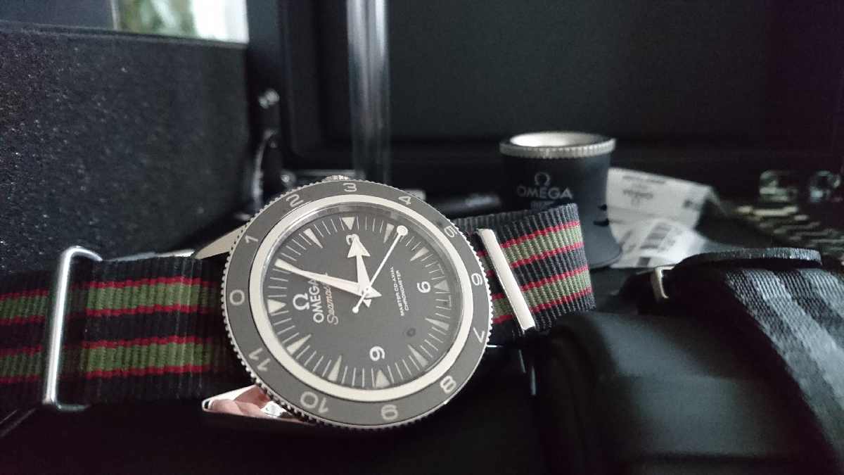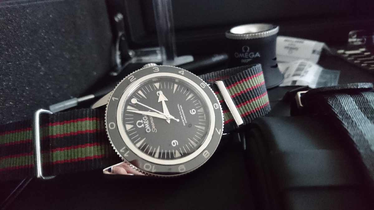 I'm guessing it could be the new SM300 Re-issue on an Omega Nato. It wouldn't make sense for Omega to put an Aqua Terra on a nato, at least not in my mind.