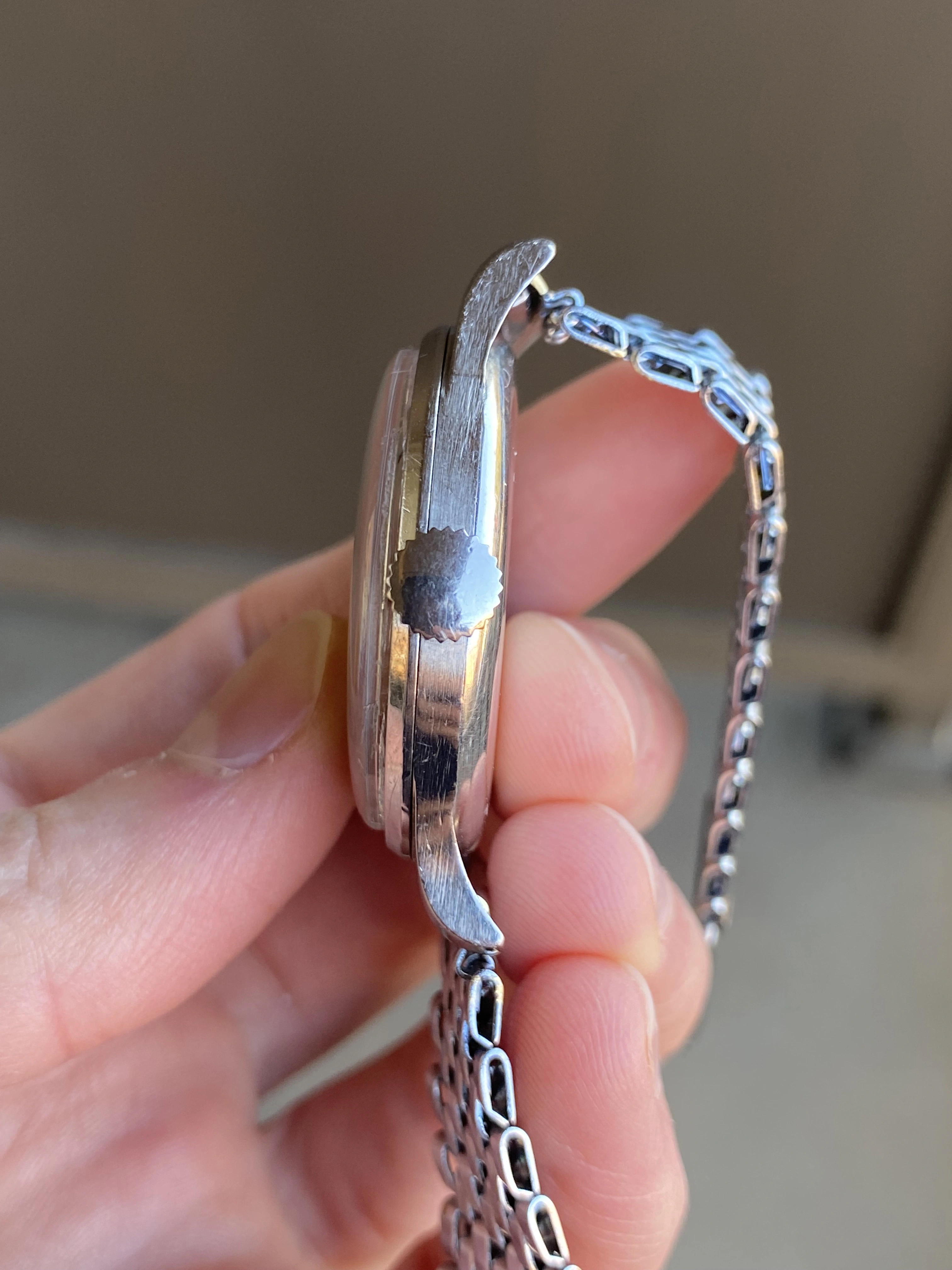 Crystal: Unclear if it’s the original as they weren’t originally signed. It’s free of scratches, but there appears to be a hairline crack on the edge of the crystal near 12-1 and some light debris stuck to the inside of the crystal. A new crystal would help this dial shine!