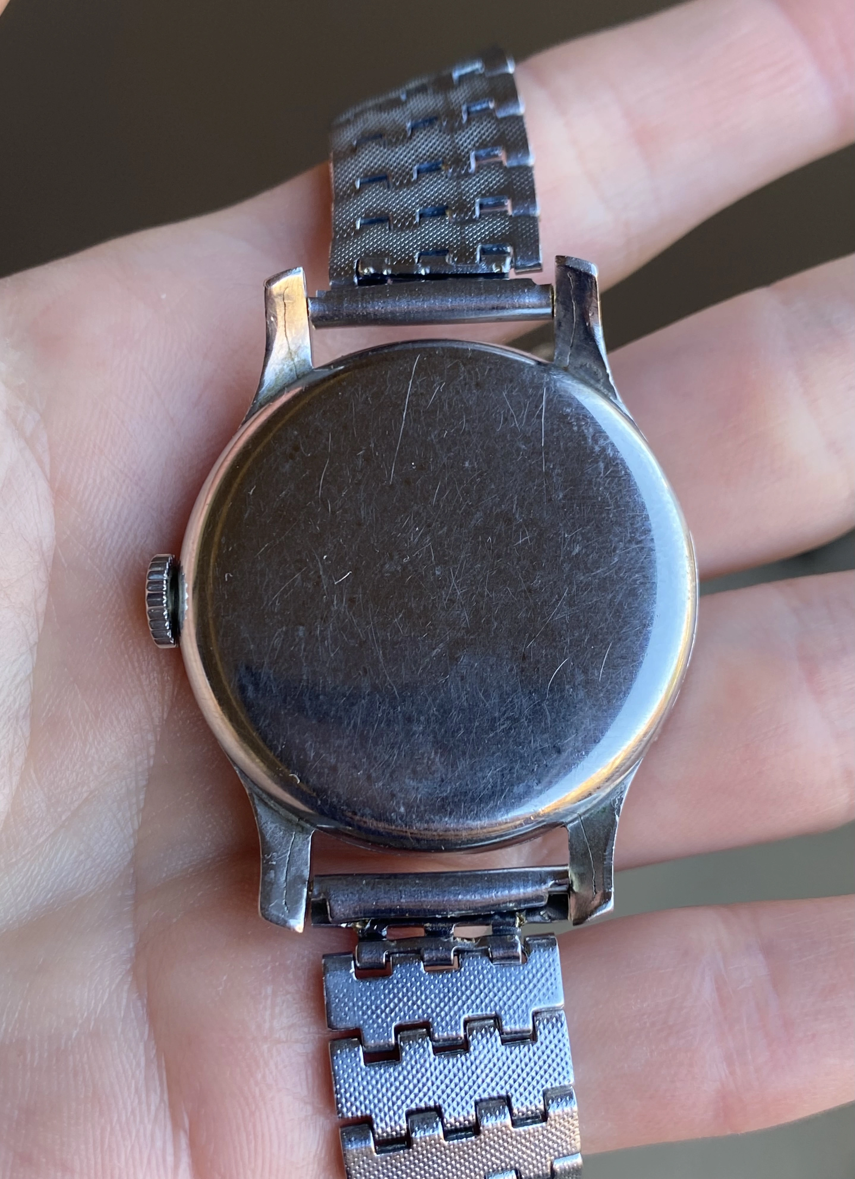Dial: Original, non-refinished dial is a unique, original copper color and features glossy silver Roman numerals and a Suiza signature. Suiza indicates delivery to South America, which is reinforced by the archive info. The dial has fairly even patina with some minor marks and discoloration, the most significant being degradation around the outside of the dial that isn’t very noticeable. Features oxidized silver stick hands to match the numerals.