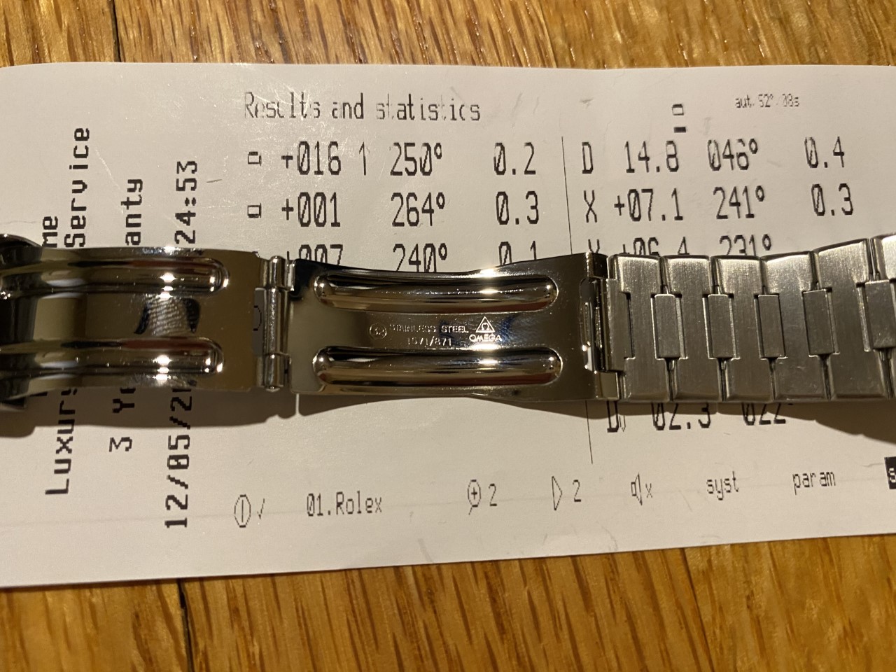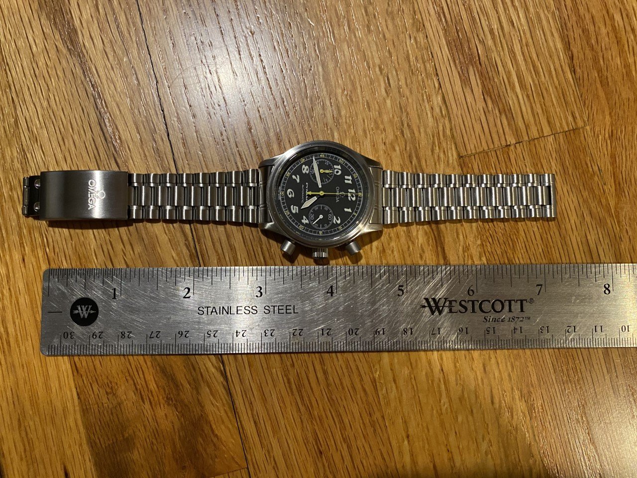 Bracelet: Omega 1571 bracelet with 871 endlinks. Measured to fit up to 7" wrist. Bracelet is polished and overall in excellent condition.
