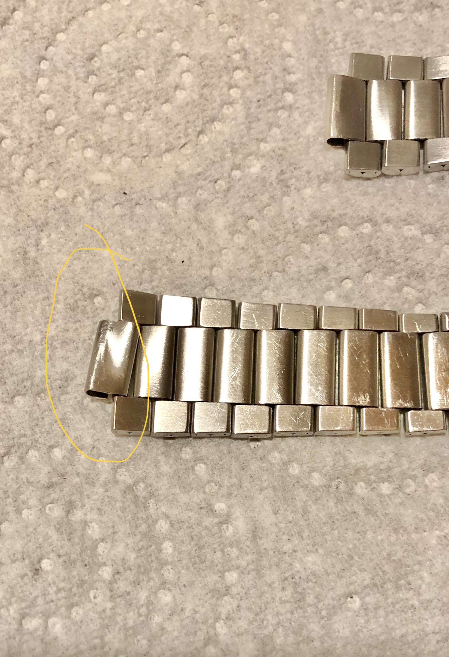 I've recently acquired a 145.012 that came with a 1039 flat link bracelet. However the the last inner links connecting to the end links are twisted, one more than the other (see picture). My watchmaker said he could try bending them back into shape but the result would most likely not be perfect.