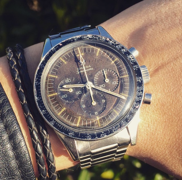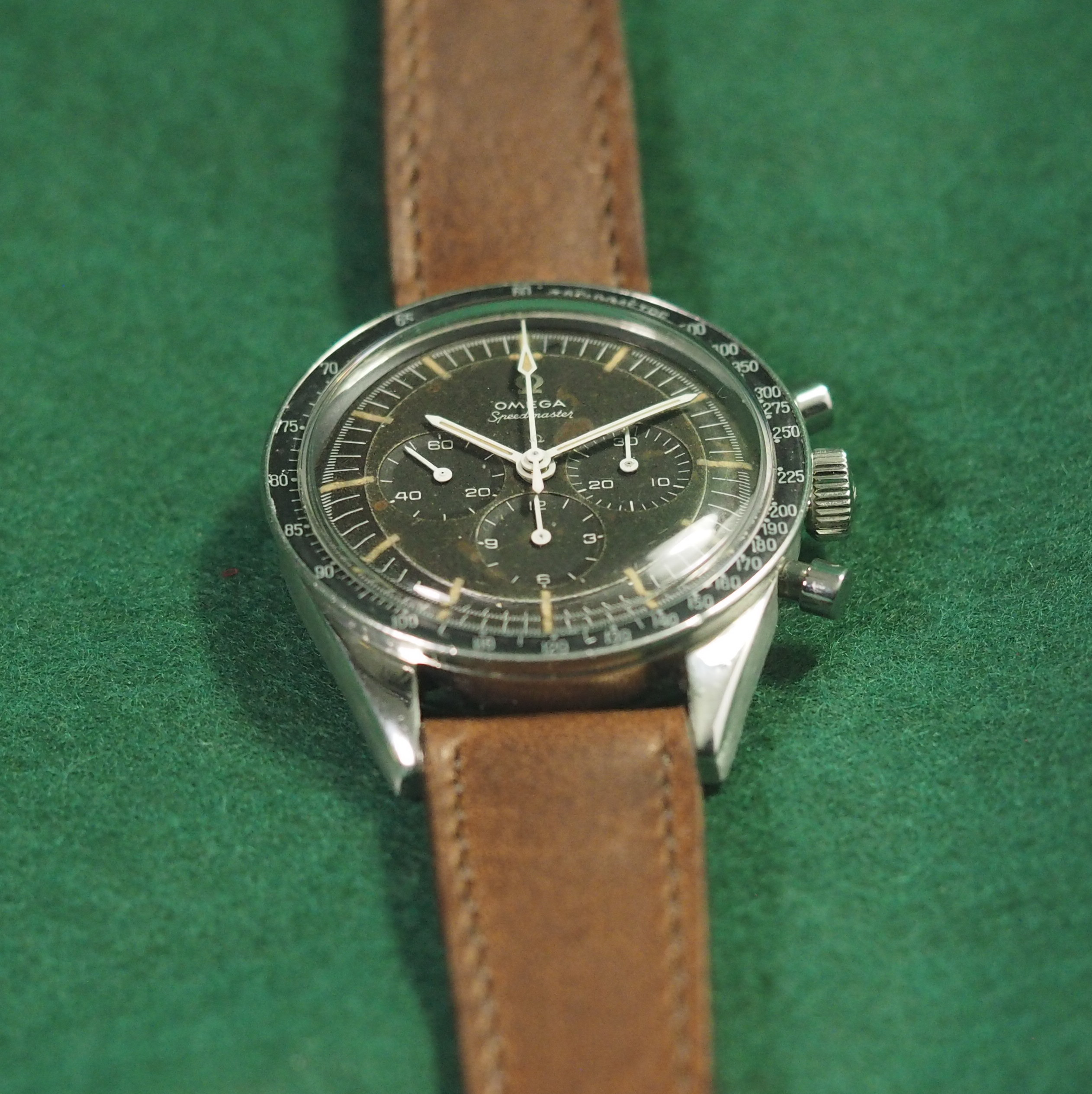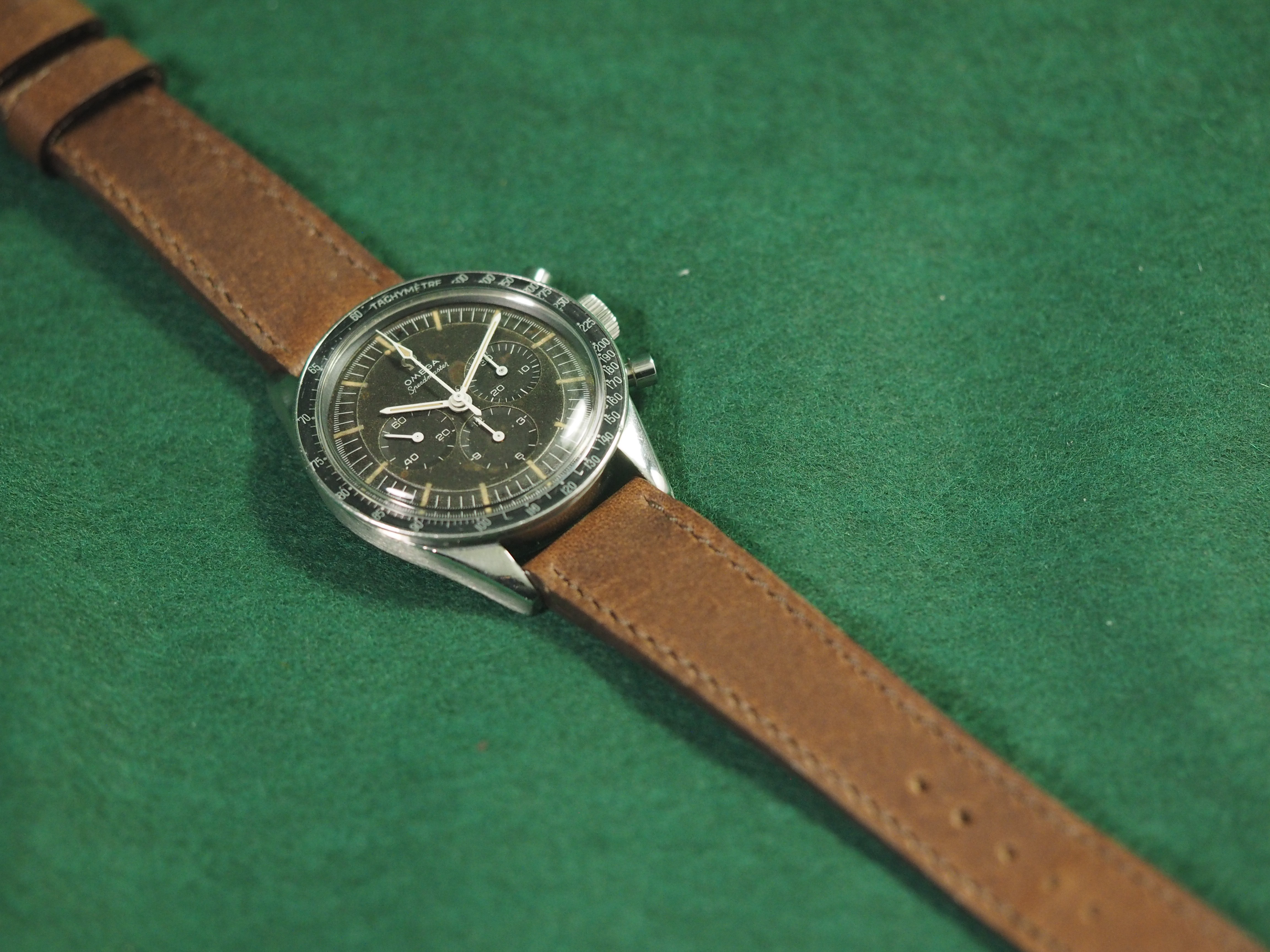 ··Prolific Speedmaster HoarderOmega Speedmaster 105.003-64 with tropical / degraded dial. On a hand made leather strap with an Omega marked buckle that I cannot say is original.