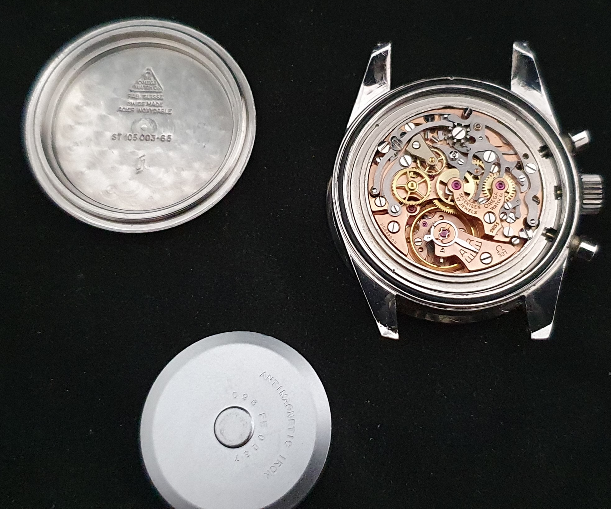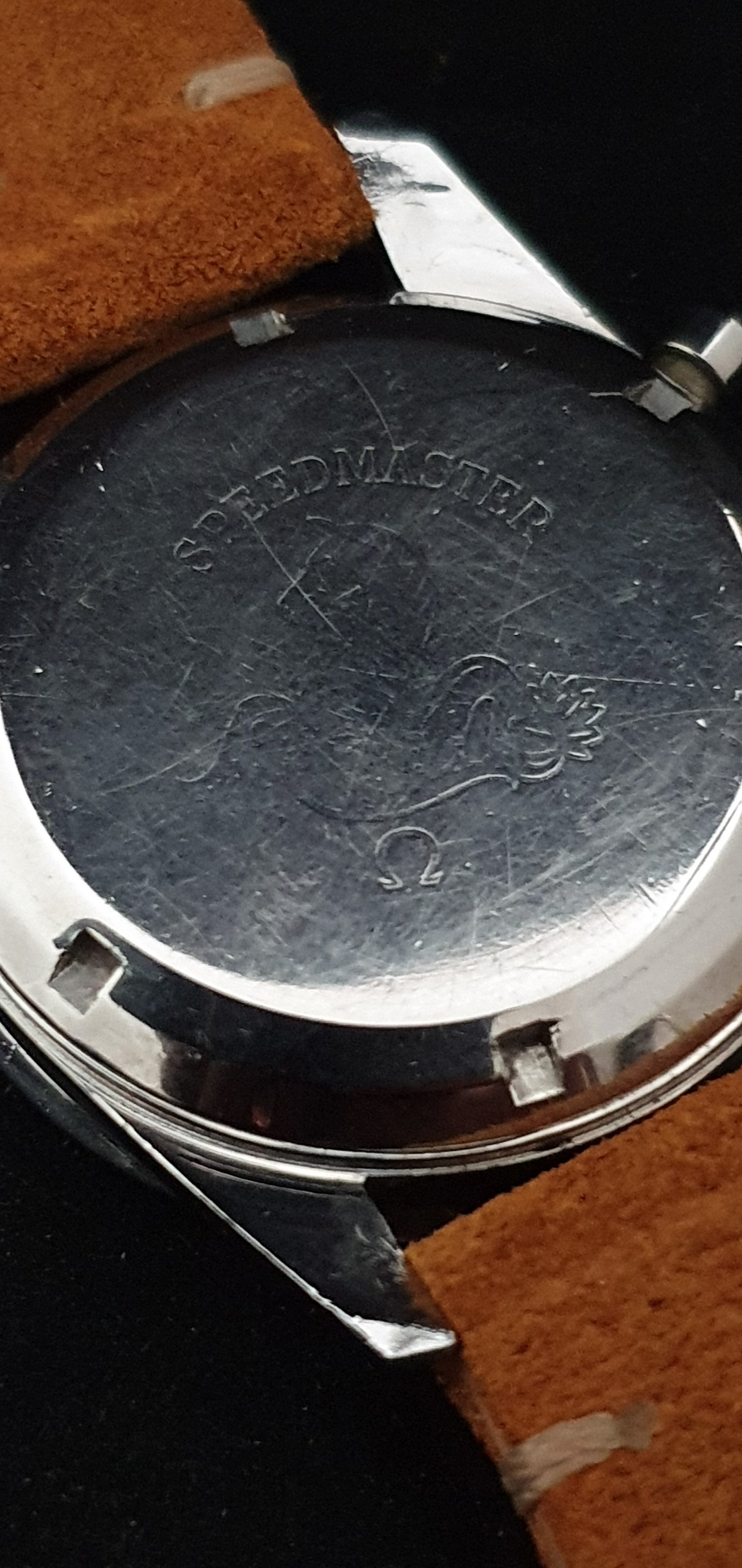Caseback - A3 double bevelled caseback featuring the word "SPEEDMASTER", hippocampus and Omega logo. Correctly stamped internally with the FJ makers logo. Correct and original to the watch.