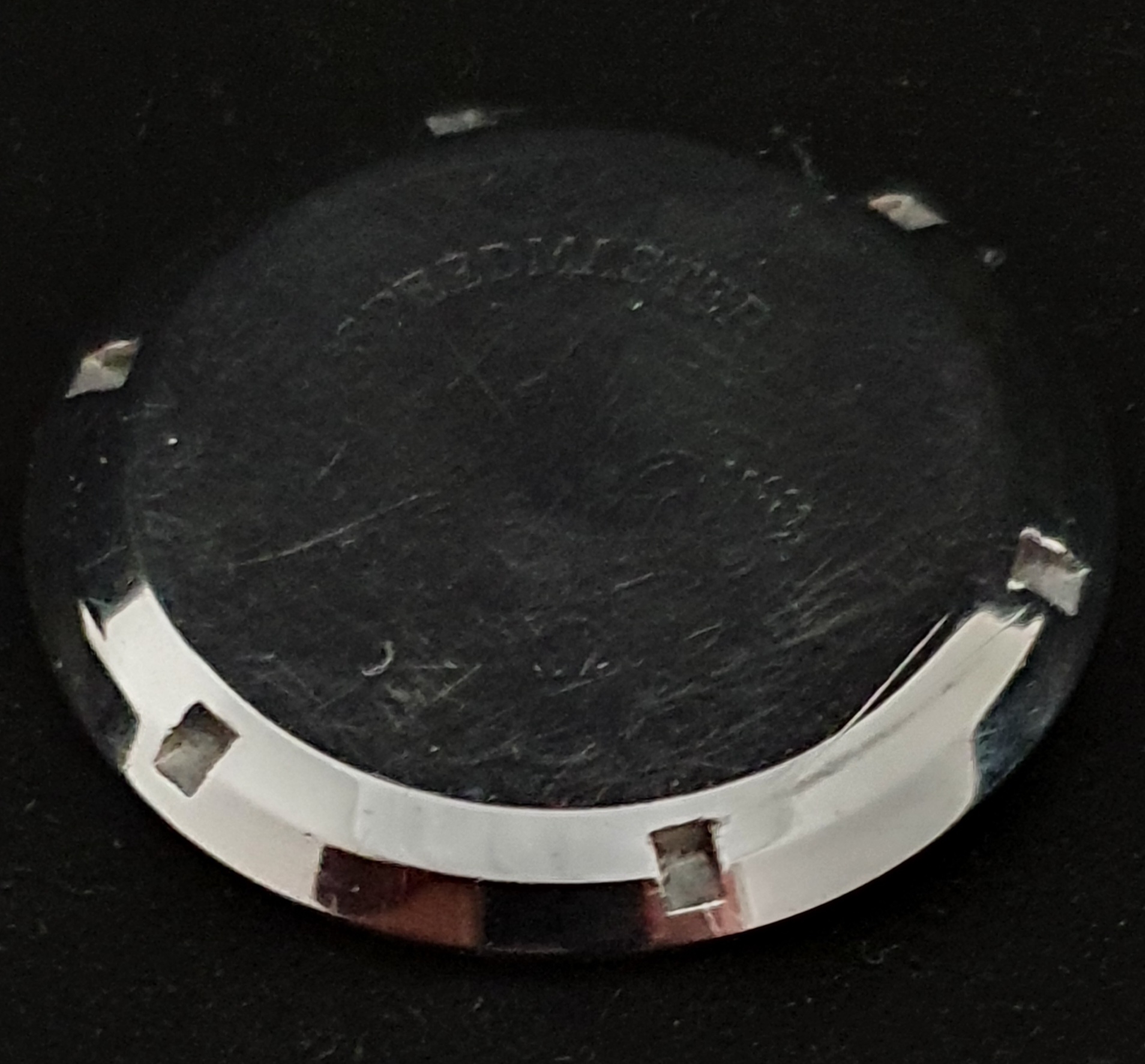 Glass - OK, don't laugh! The hesalite is the correct shape and I am pretty sure it is correct. In some lights, I swear I can see the curve of the omega logo on the inside and then I can't. The glass is in good condition so the few scratches were polished out and the glass retained.