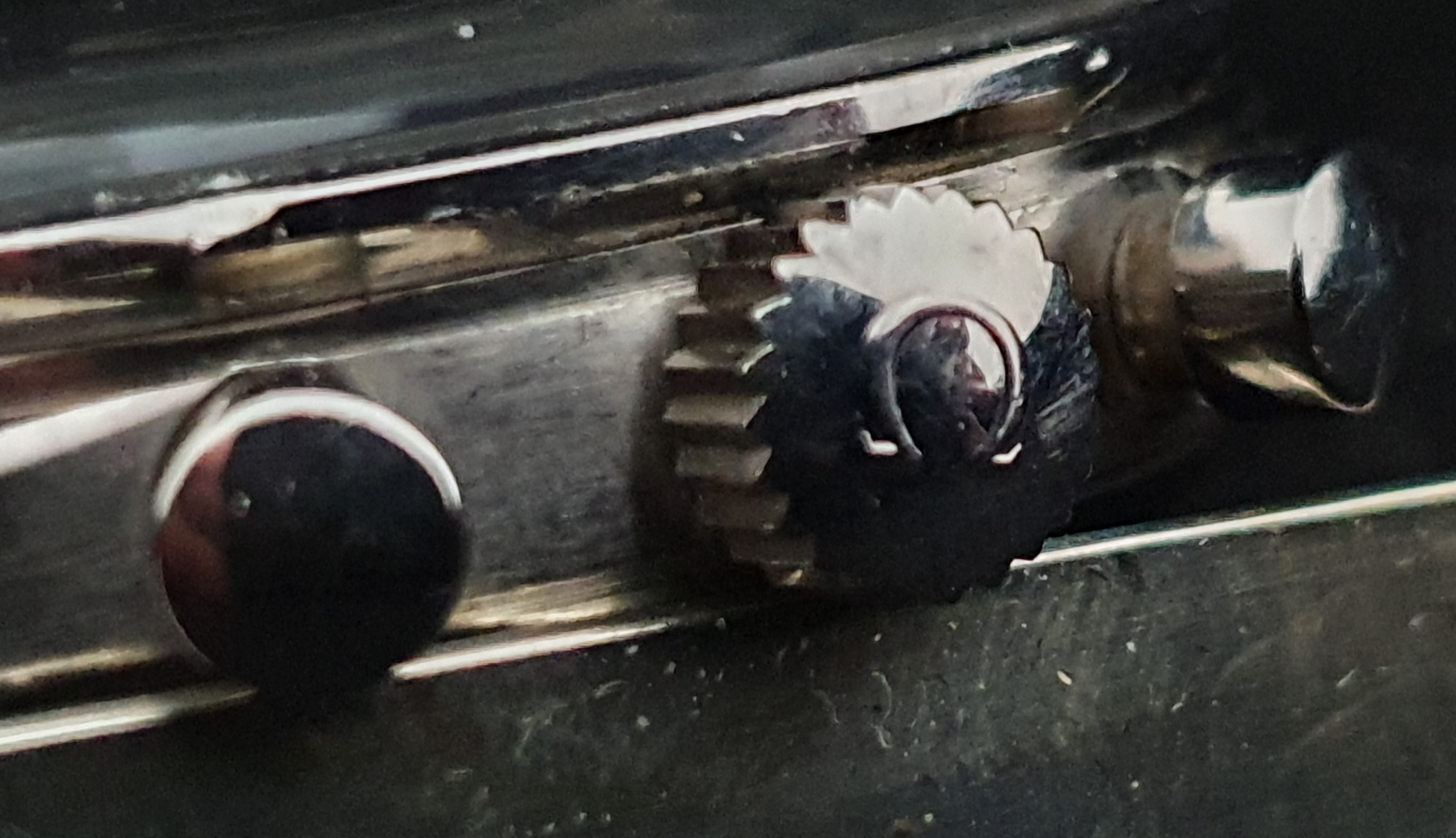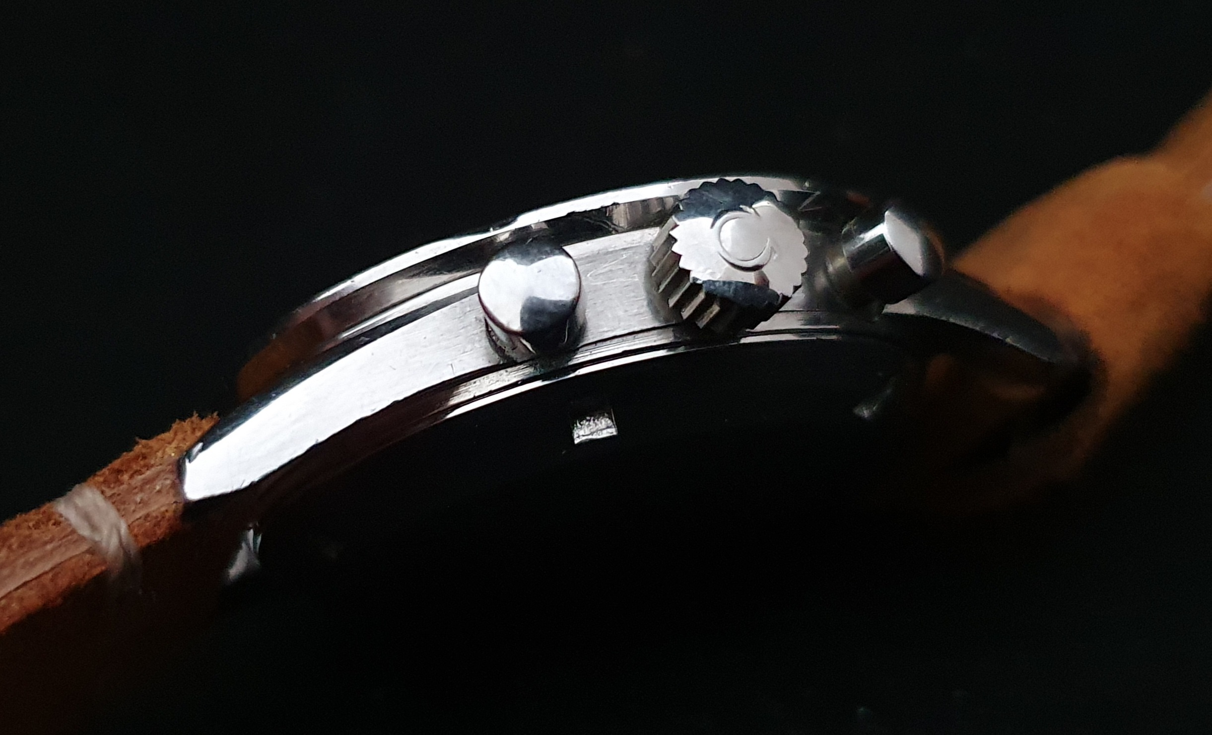 Crown - A3 crown which would be a service replacement. The original owner's son seems to remember it was sent to Omega for its first service. Fortunately, this appears to be the only part replaced.