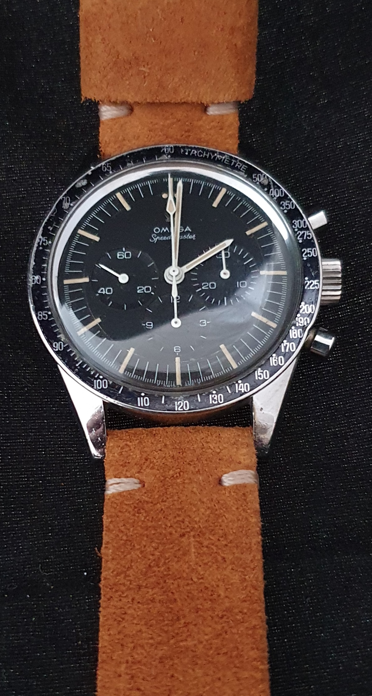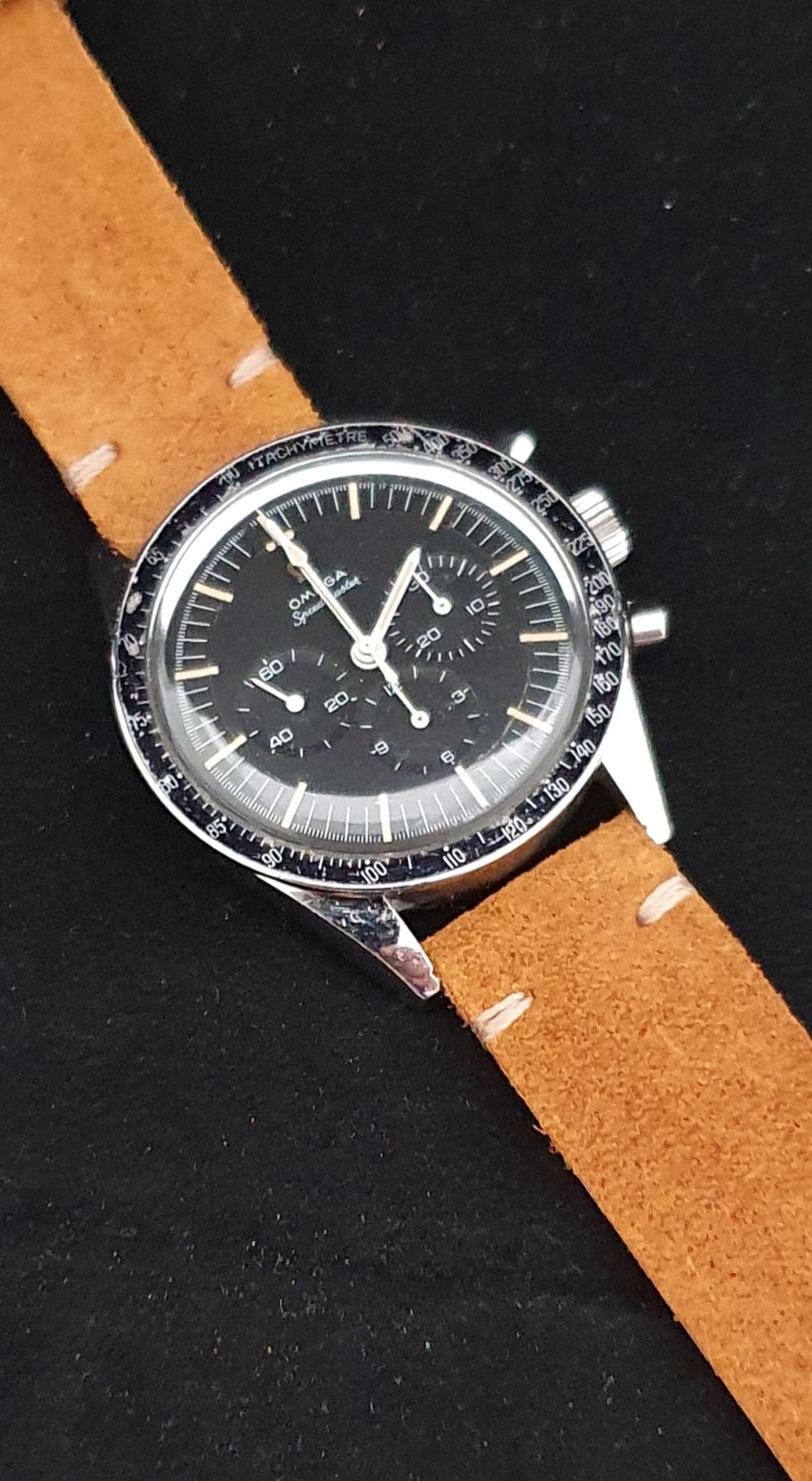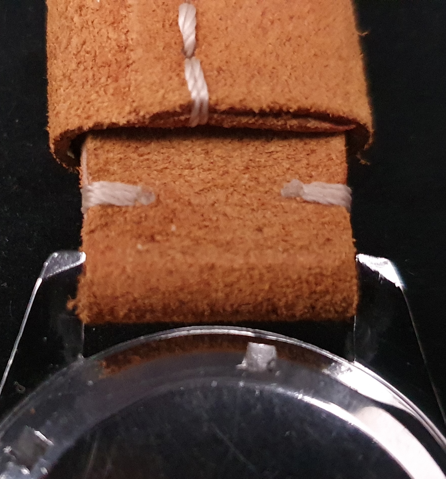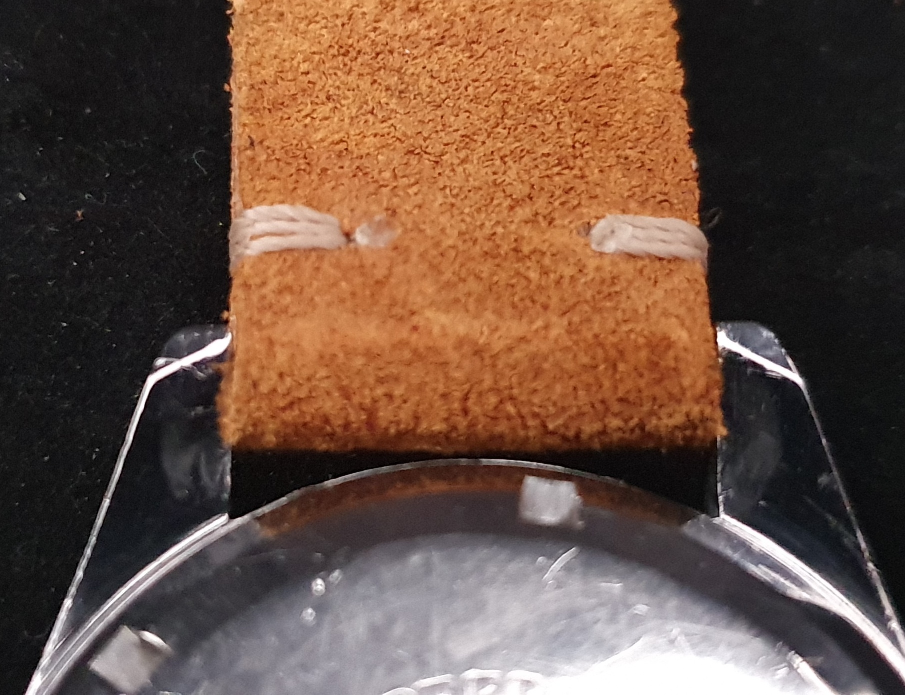 Strap - the watch is presented on a tan suede single stitch strap which will easily fit up to an 8 inch wrist (probably 8 1/2). Those of you who know Steveo will recognise his work. These are very good, handmade, straps.