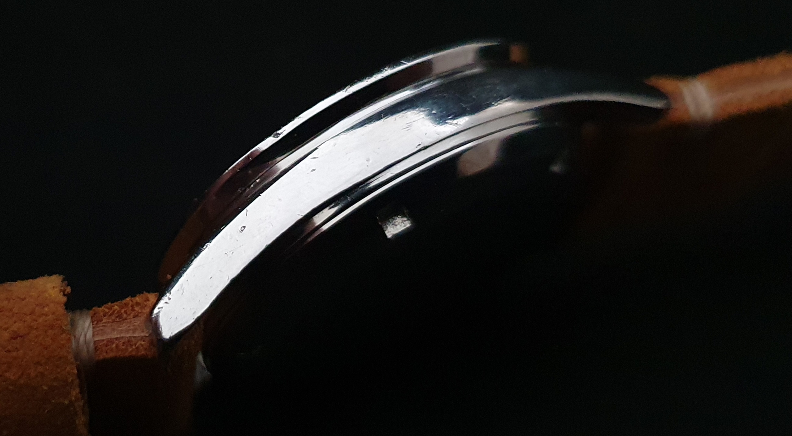 Case - A1 symmetrical case, or "straight lug", in unpolished condition. Measuring 38.2mm without the crown, 42.2mm with. 48mm lug to lug. There are nicks and scratches but we have chosen not to polish and leave in its original state. Its a good case.