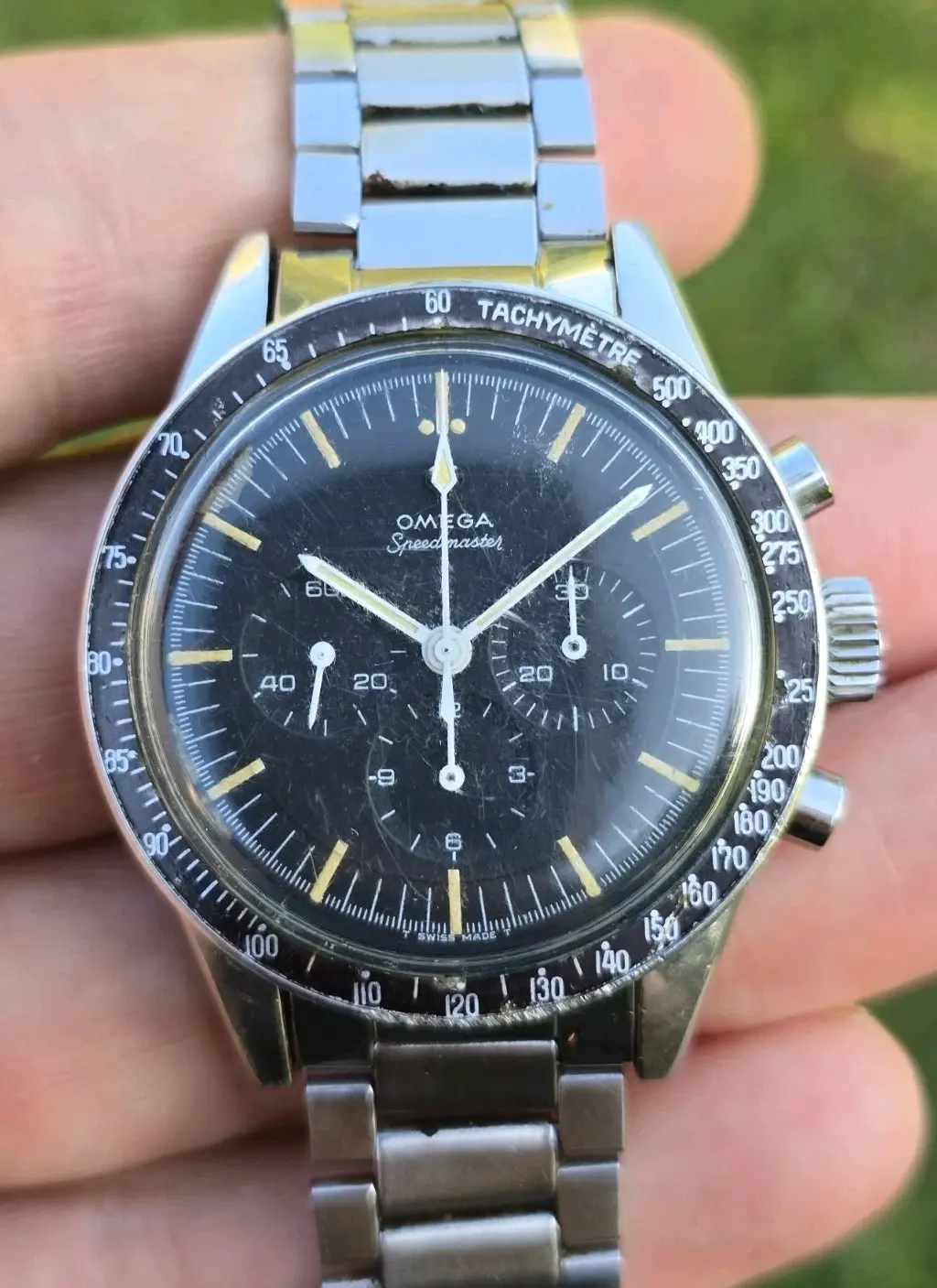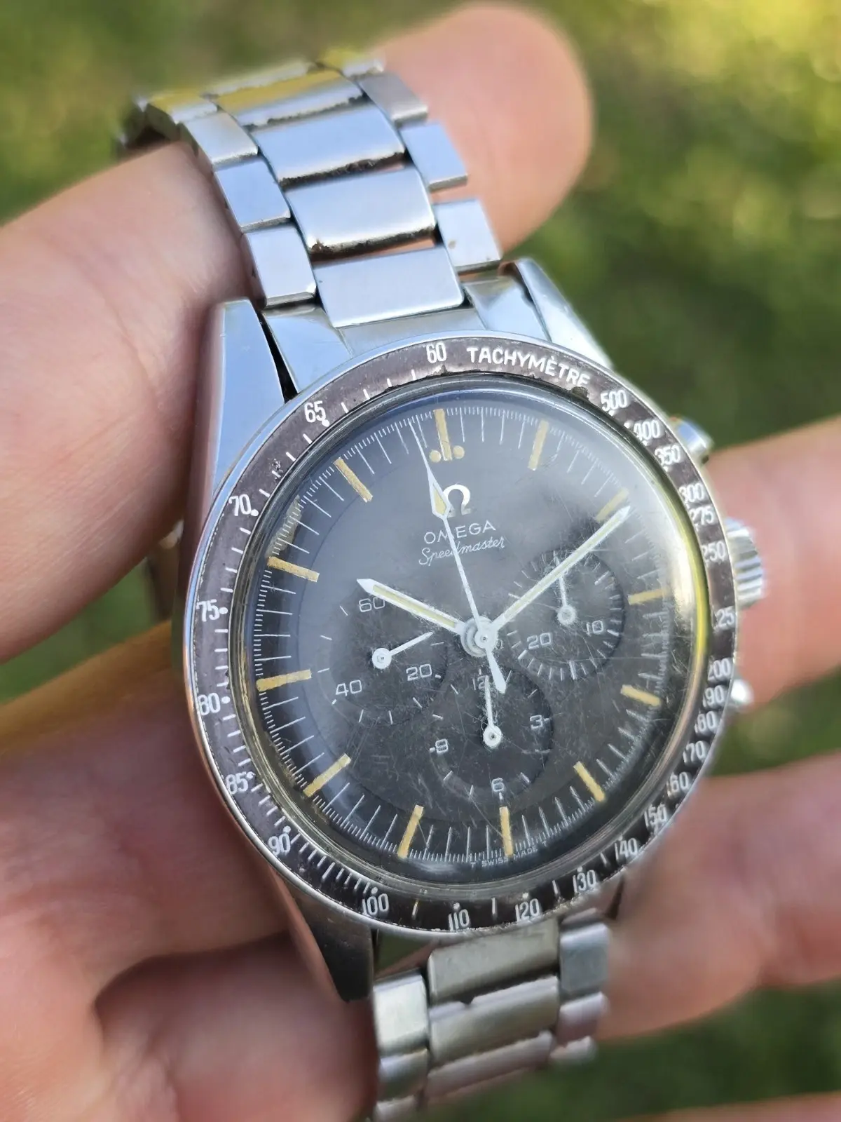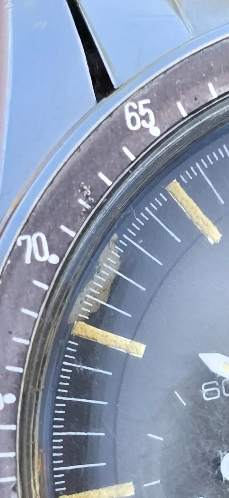 The damage to the dial is the most curious part of the watch - Retouched markers over the damage? Some sort leeching oil that producing a bleaching like effect of the black paint?
