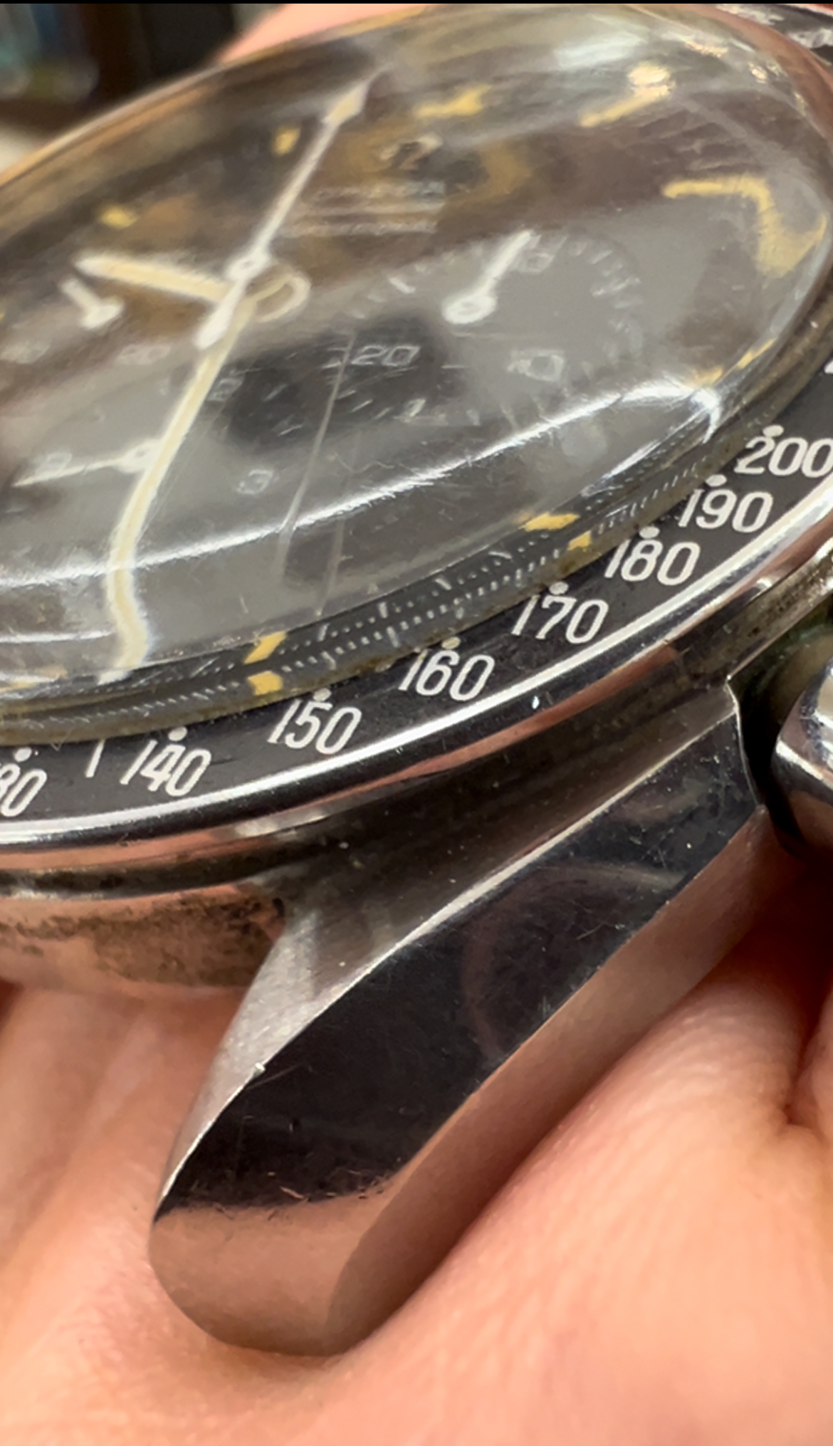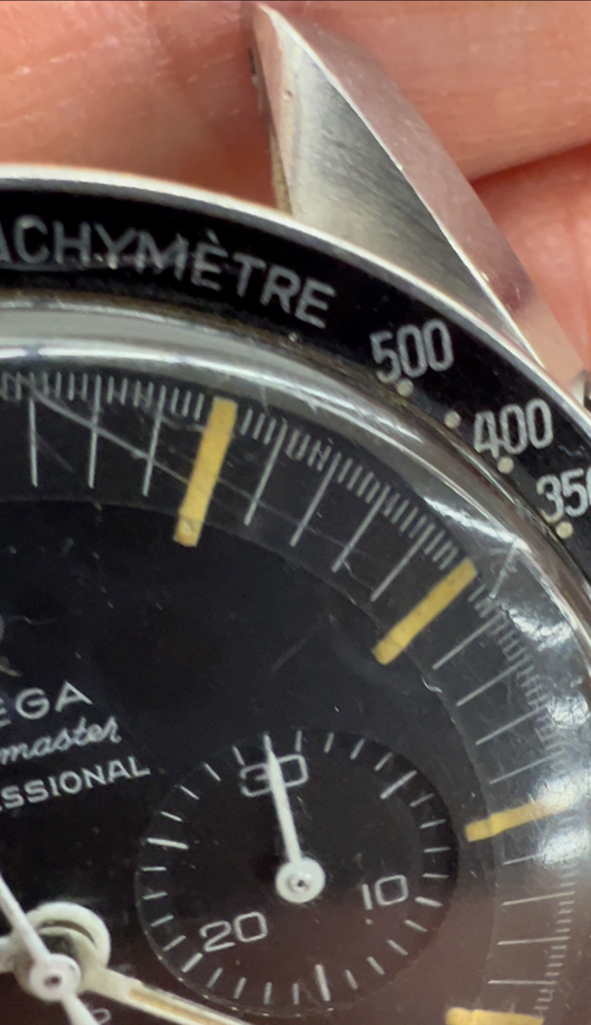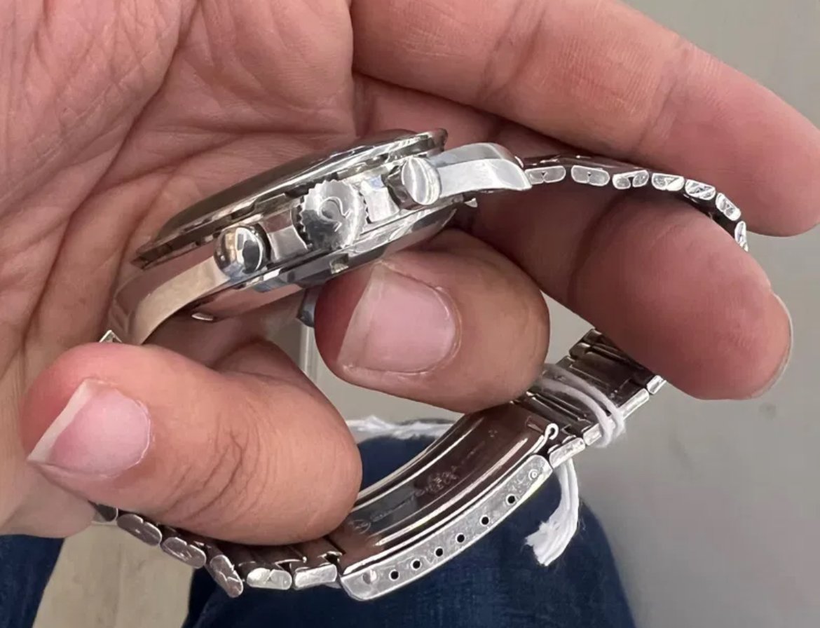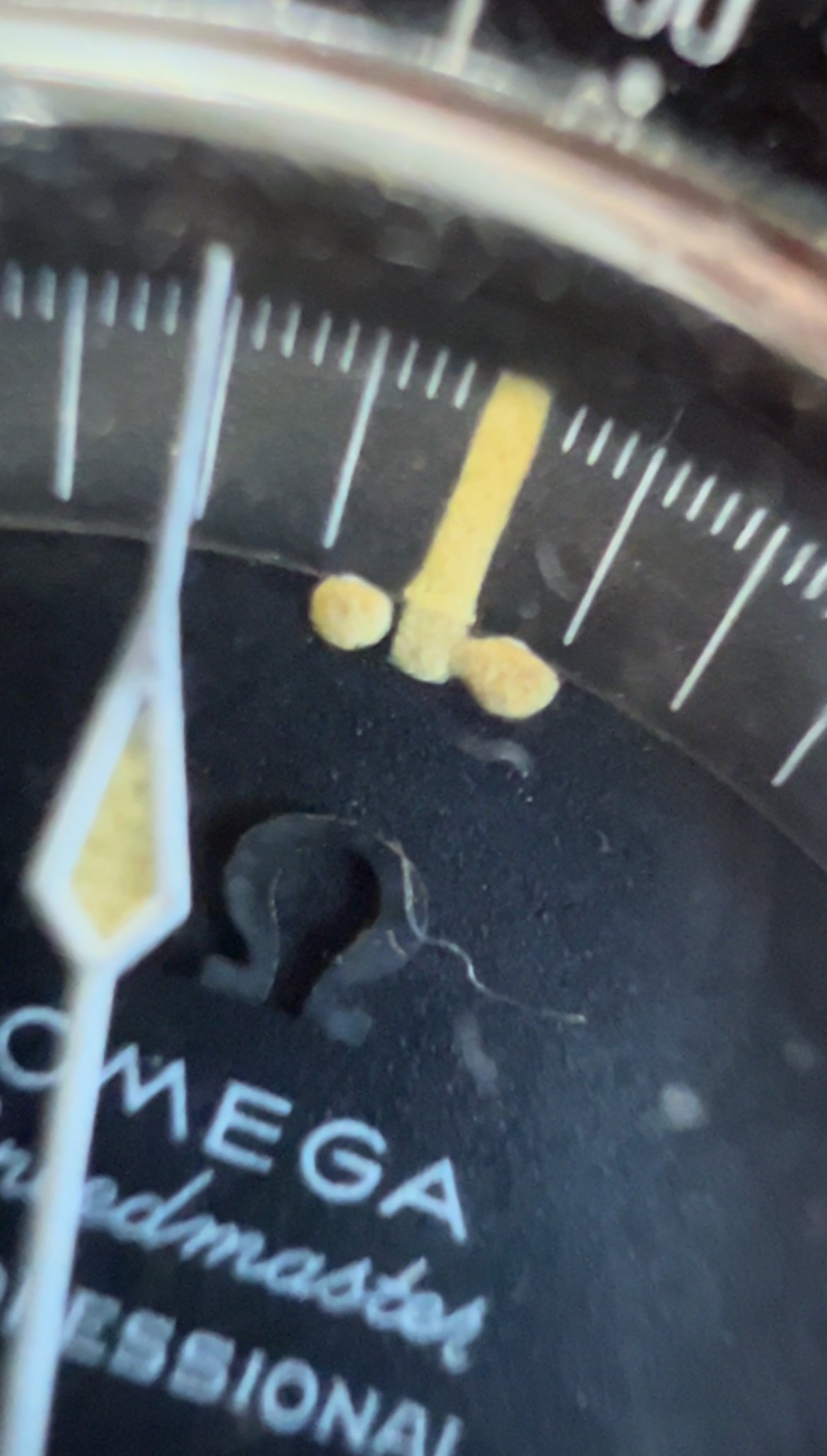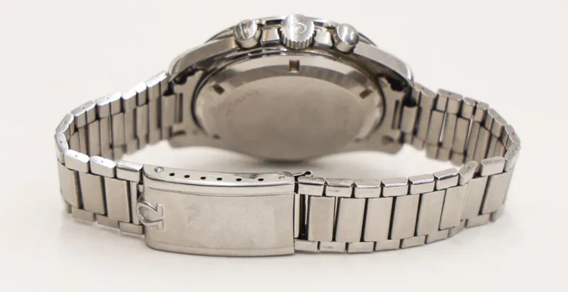 Based on my own due diligence with the auction house, there is no omega logo on the crystal and some stray fibres are present on the dial. This would lead one to assume that the watch has been opened up at some point during its life. This coupled with the lack of movement photos does introduce risk. The chronograph function was also not working when depressing the pushers.