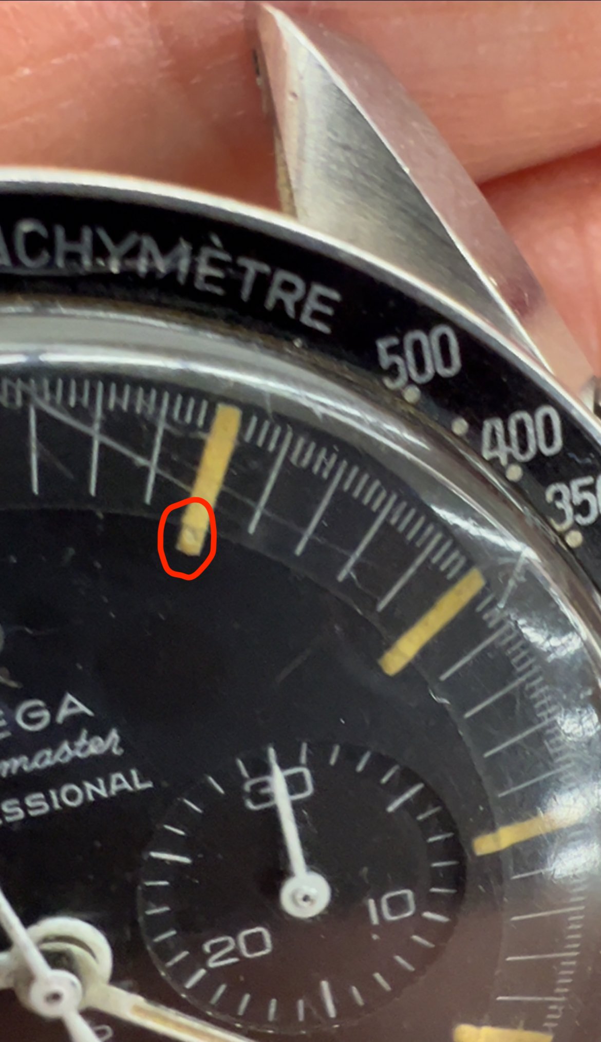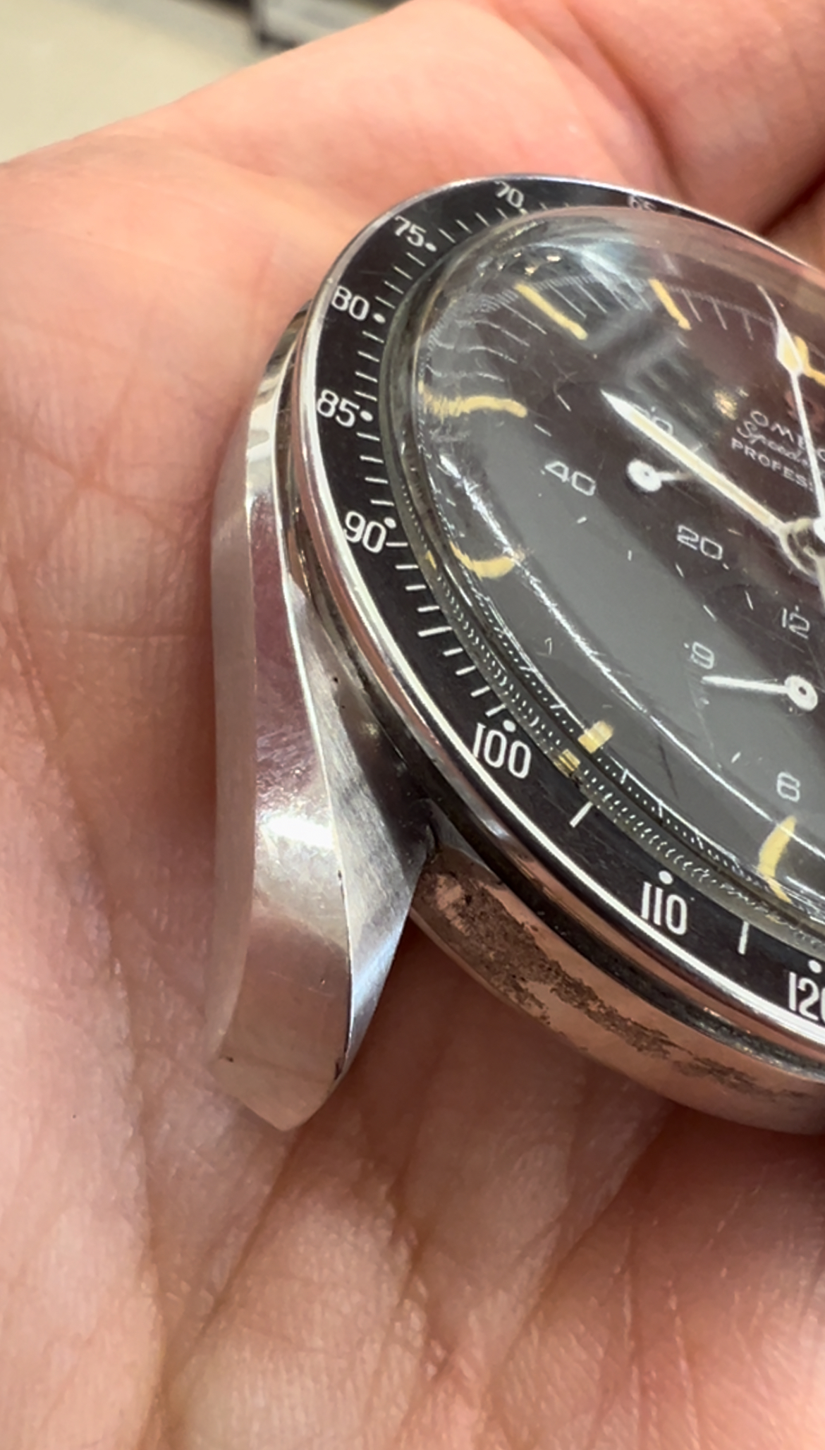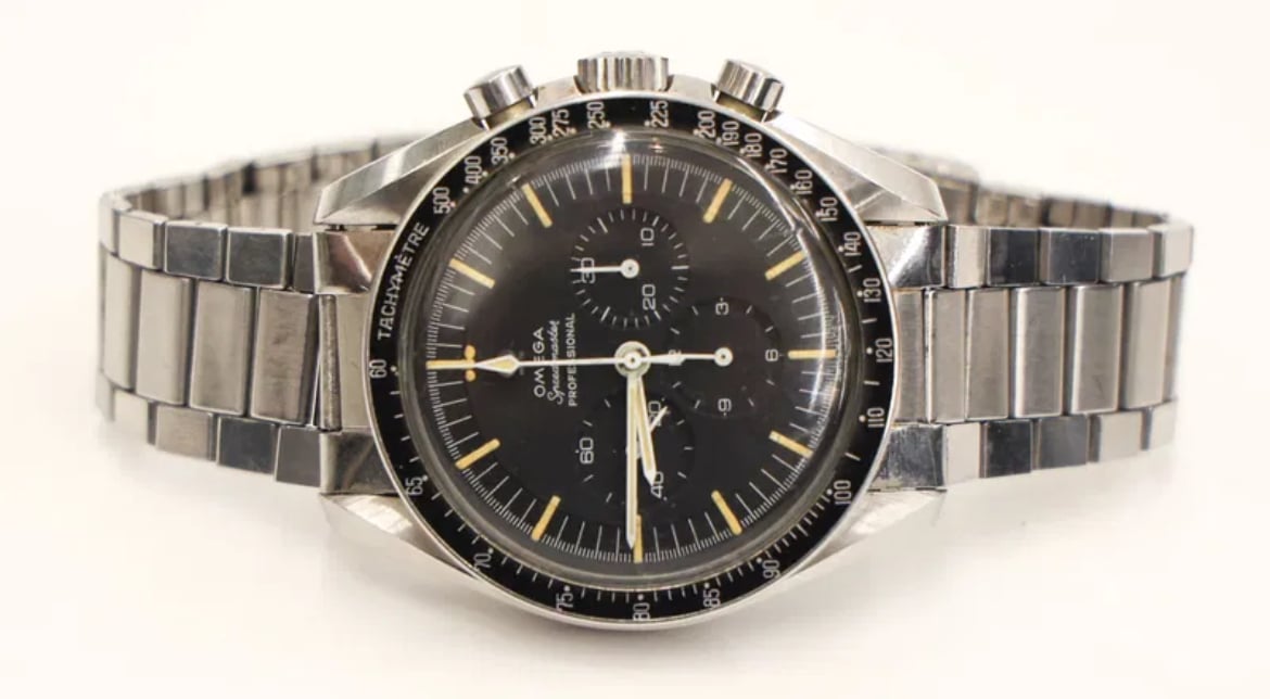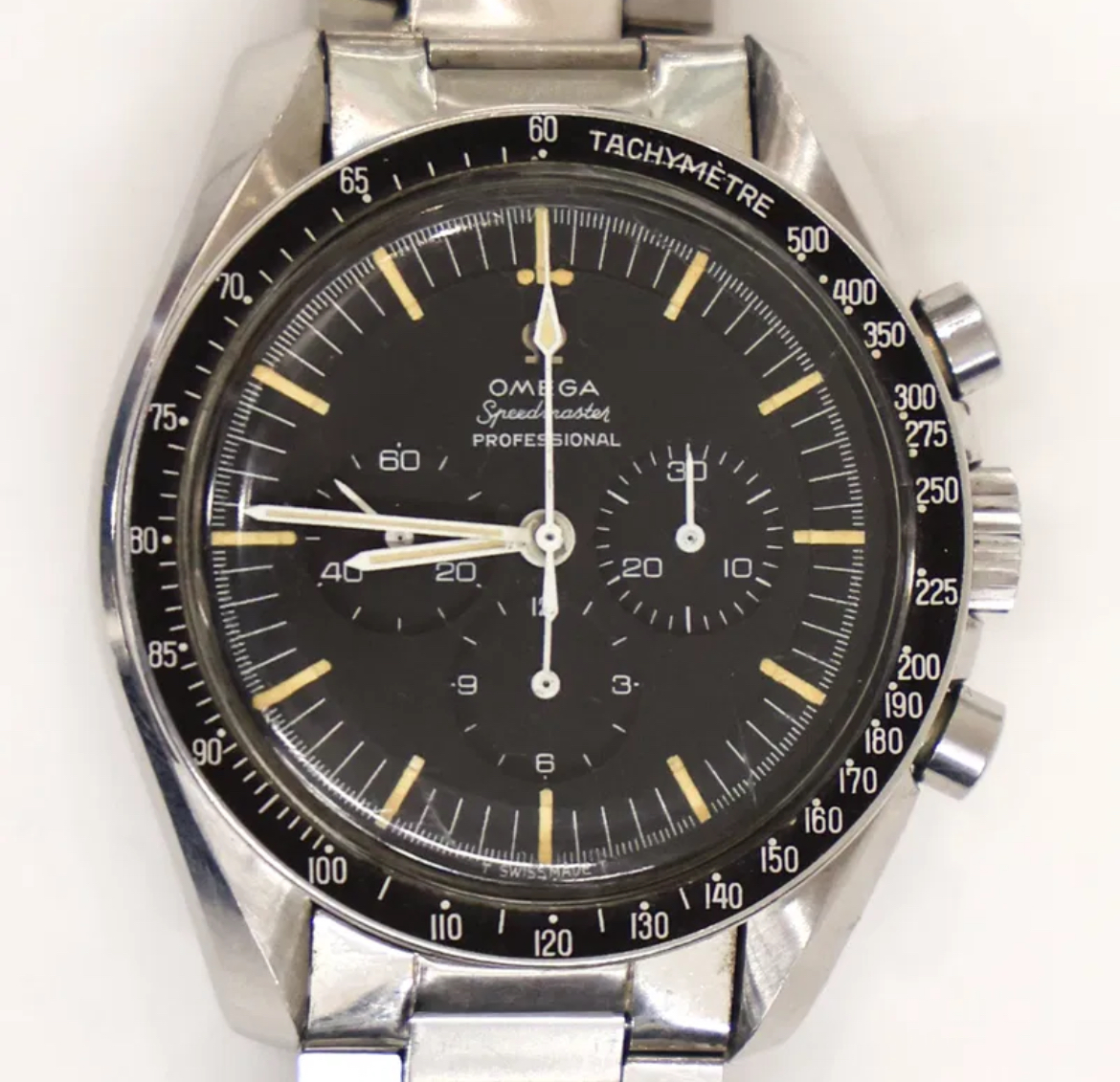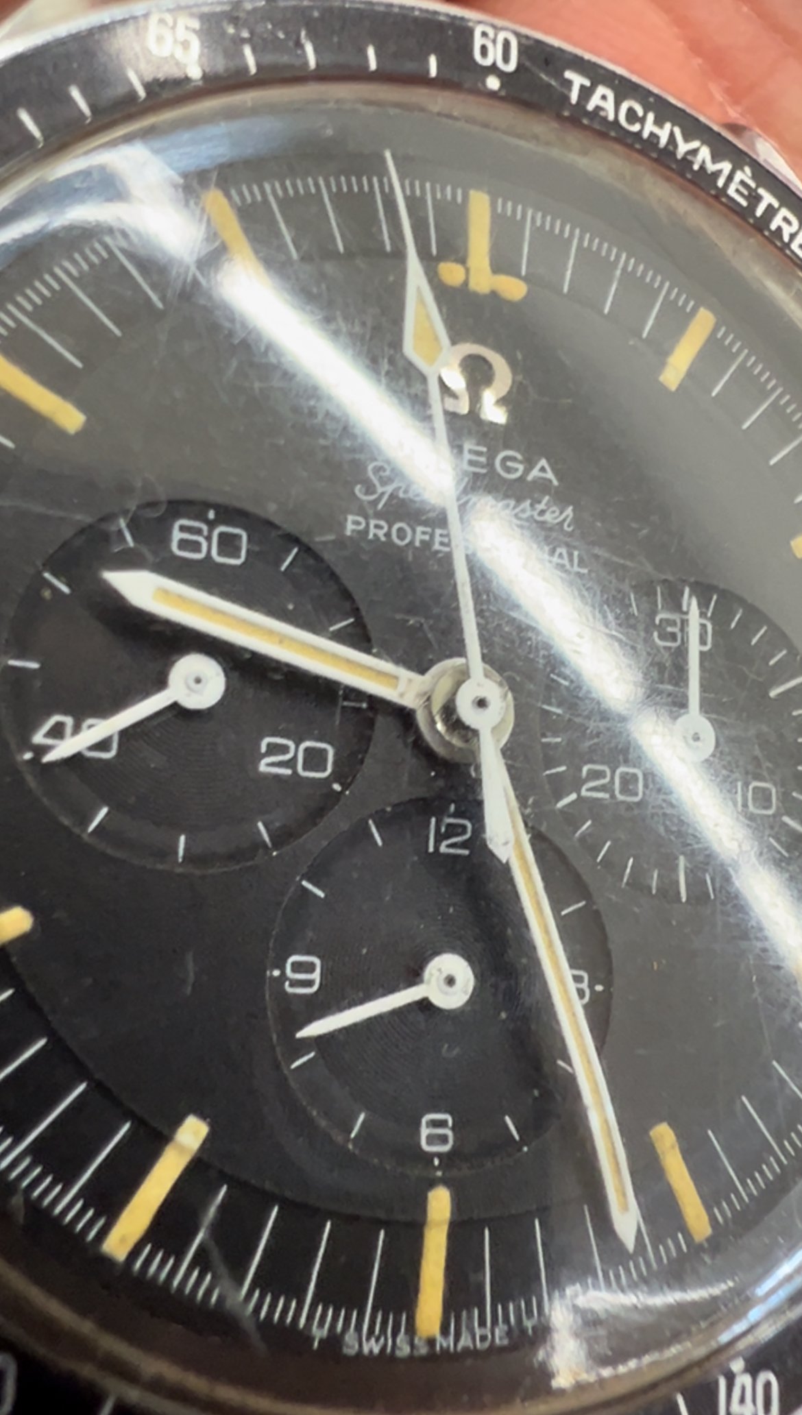 Based on my own due diligence with the auction house, there is no omega logo on the crystal and some stray fibres are present on the dial. This would lead one to assume that the watch has been opened up at some point during its life. This coupled with the lack of movement photos does introduce risk. The chronograph function was also not working when depressing the pushers.