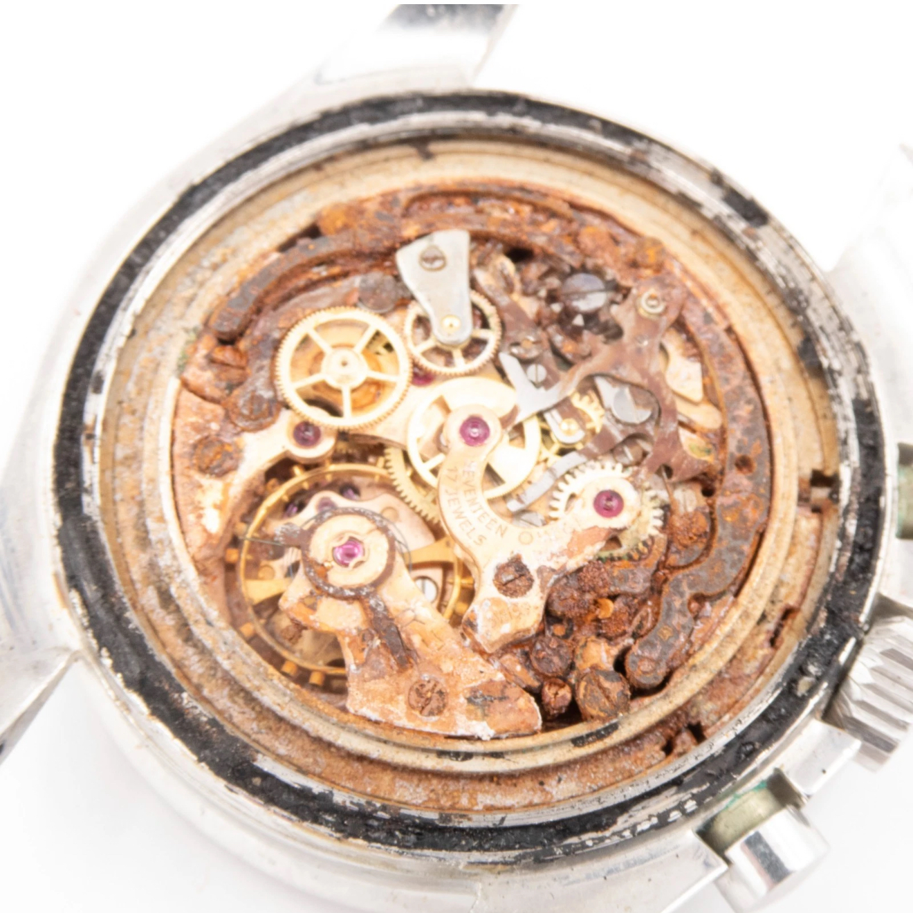 ·Stumbled across this 105.012-66CB on eBay last night. Beautiful sharp CB case with prominent facets, near perfect Don bezel, correct crown and pushers. One small detail - the movement has been destroyed by moisture ingress 😢. Dial is a crap shoot as it’s very difficult to tell if the moisture had an impact on it, but the lume plots and hands don’t look too bad.