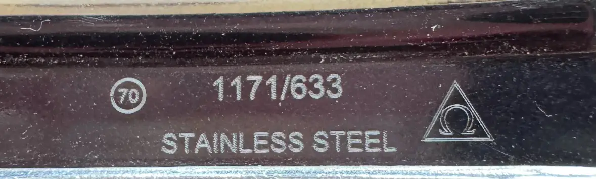 “Recent replacement (32) 1171/633 laser engraved, nothing on the endlink, Ω in a square, 33.6x16.8mm.”