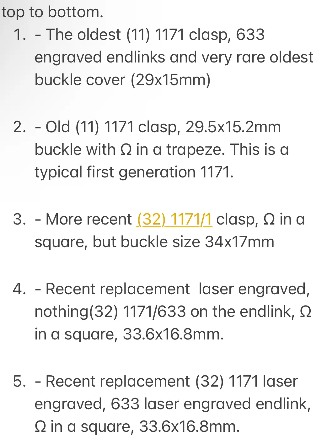 Once received, the bracelet purchased is most similar to example 4 except that the “32” is replaced with a “70”, “stainless steel” is below the 1171-663, there is no “Omega” stamped below the Triangle and was sent with 633 laser engraved endlink instead of nothing on the endlink.
