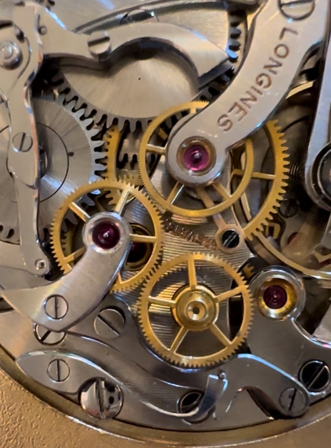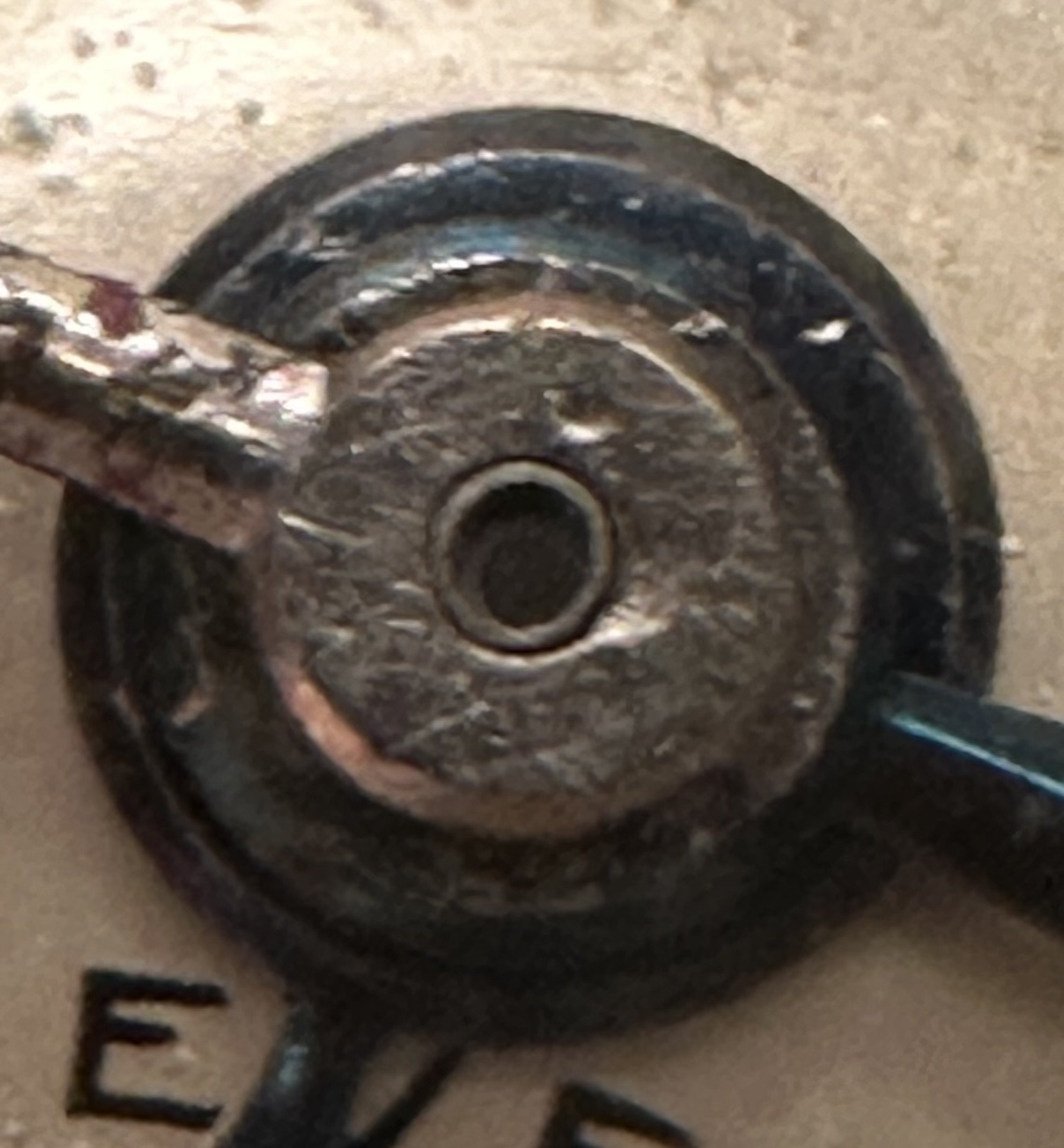 This watch is missing a central seconds hand. I also think the chrono minutes hand tip and tail both were damaged and it was patched back up. When I purchased it I was thinking the watch was originally sold without a seconds hand at the buyer's request, but the broken minutes hand makes me now think that is not the case. Also who wants a chrono with a minutes hand only?