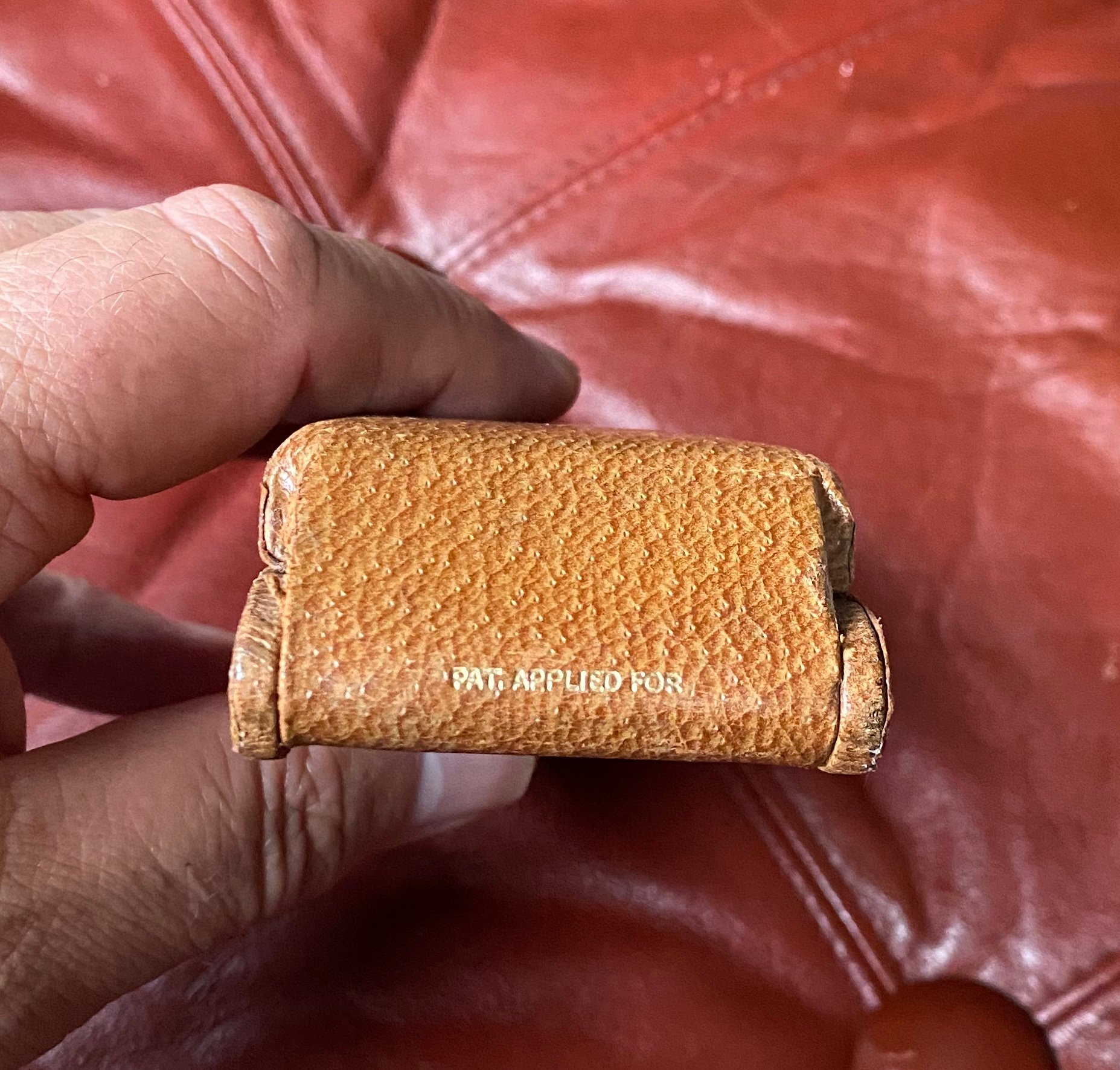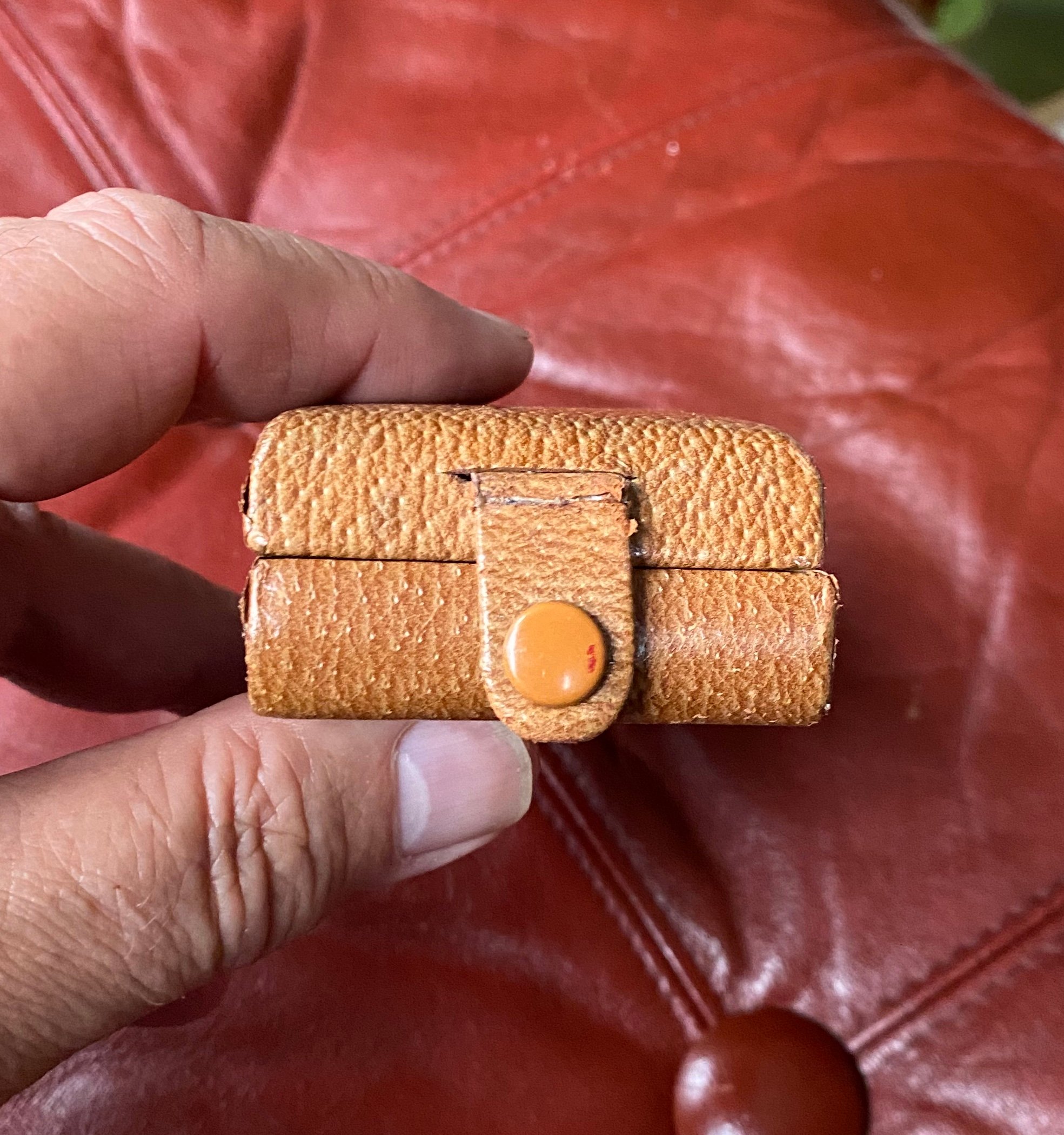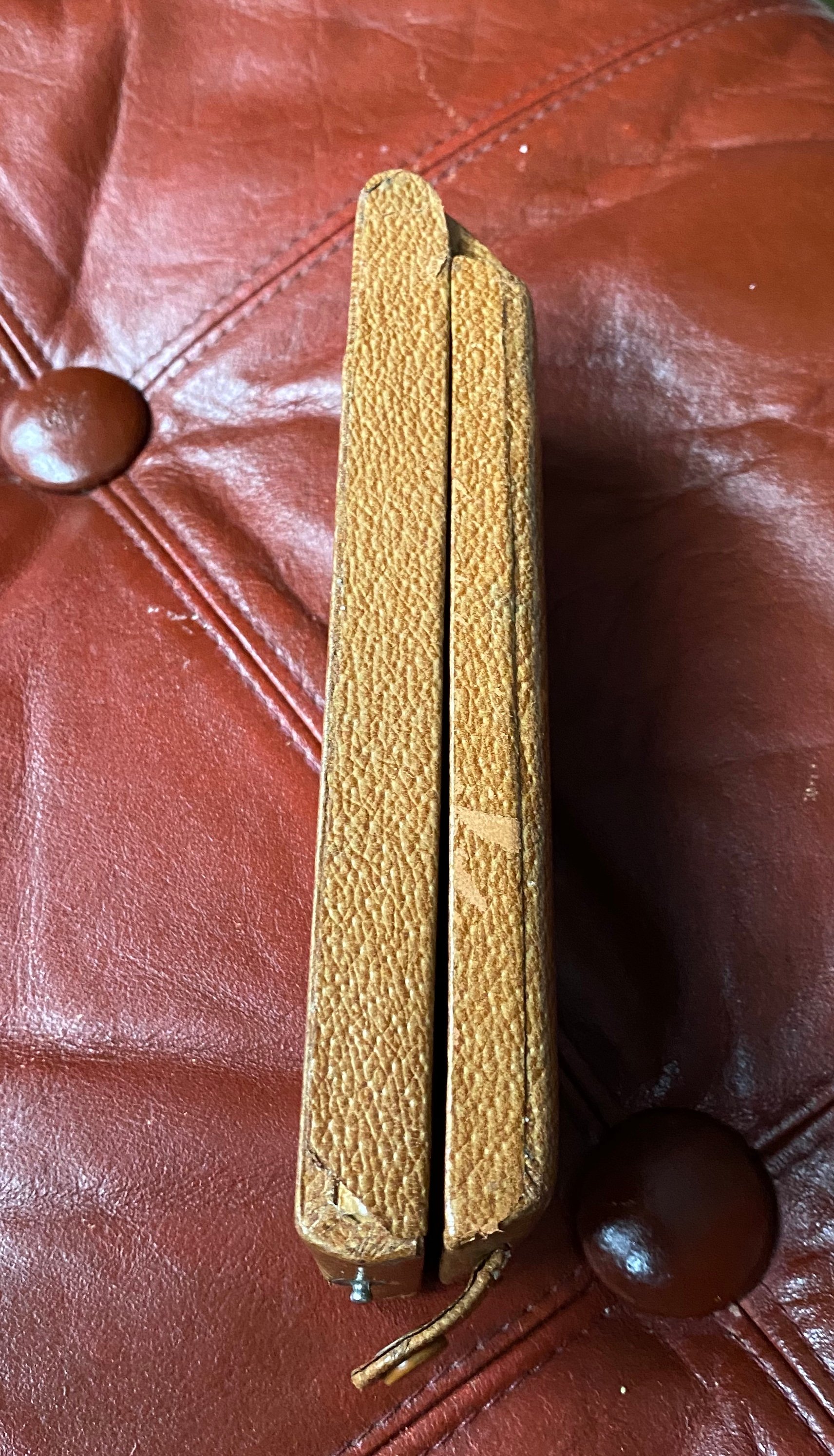 Tan textured leather finish to the outside with dark brown cloth inner lining, inner could do with a clean.