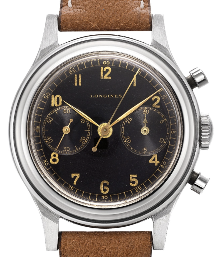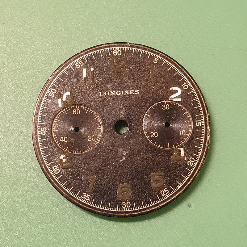 This watch is certainly a worthwhile project. Finding an operating lever should be possible. Locating a pusher and correct hands will be more challenging, I imagine. I say hands (plural) because the minute hand is not correct. Notice how the aperture for the luminous material on the hour hand is rectangular, whereas the aperture on the minute hand is pointed at one end. I also believe that the small, register hands were not originally white. Earlier, black-dial Longines could be found with white hands but I would expect an watch from 1948 to have polished steel hands.