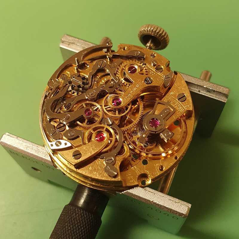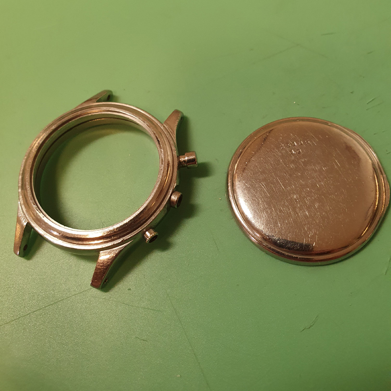 As you can see in the pictures it has seen better days and a few parts is missing. Movement have been serviced but as you can see, operating lever with its hook is missing. Also, chronorunner hand and one pusher is missing.