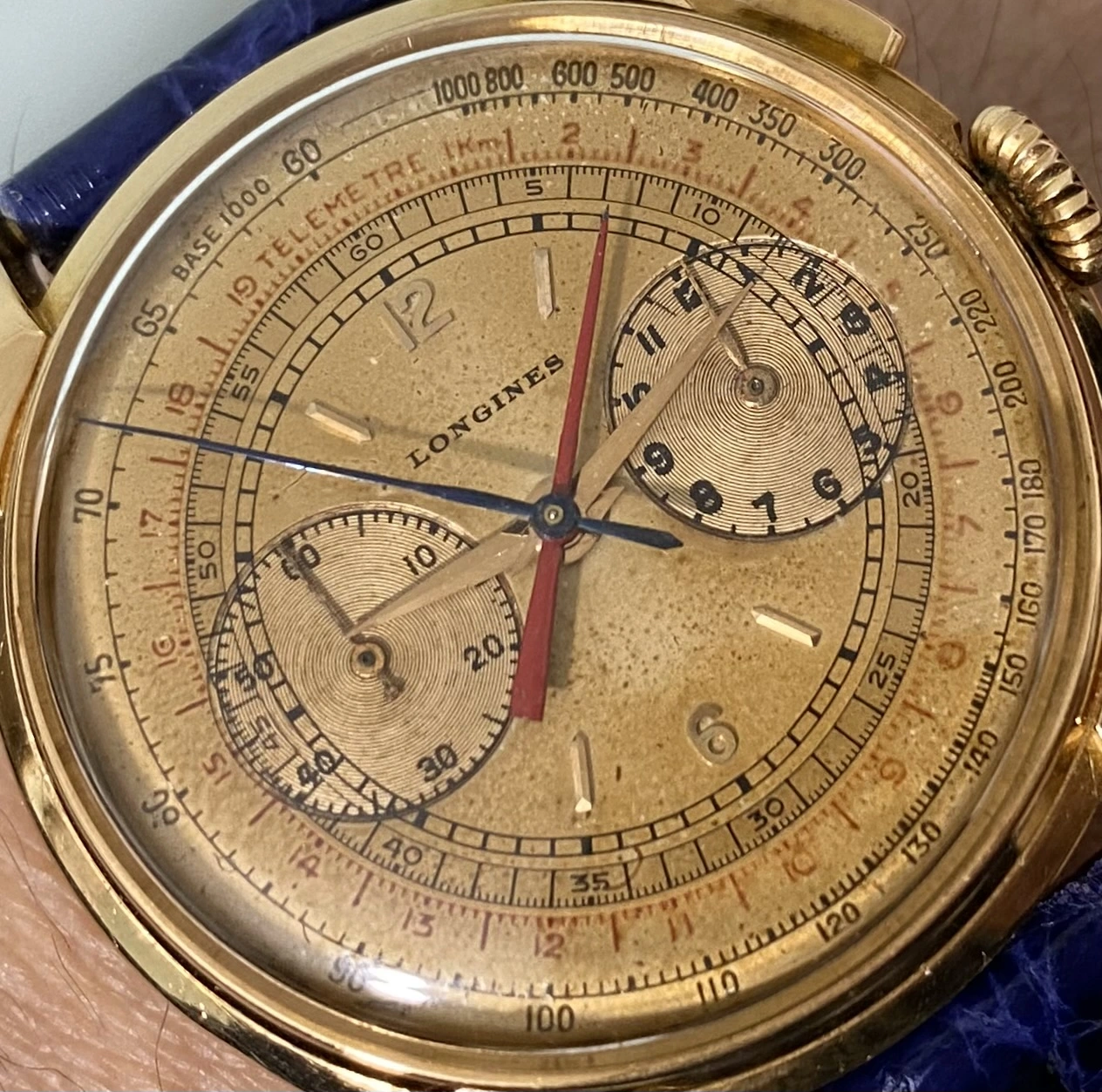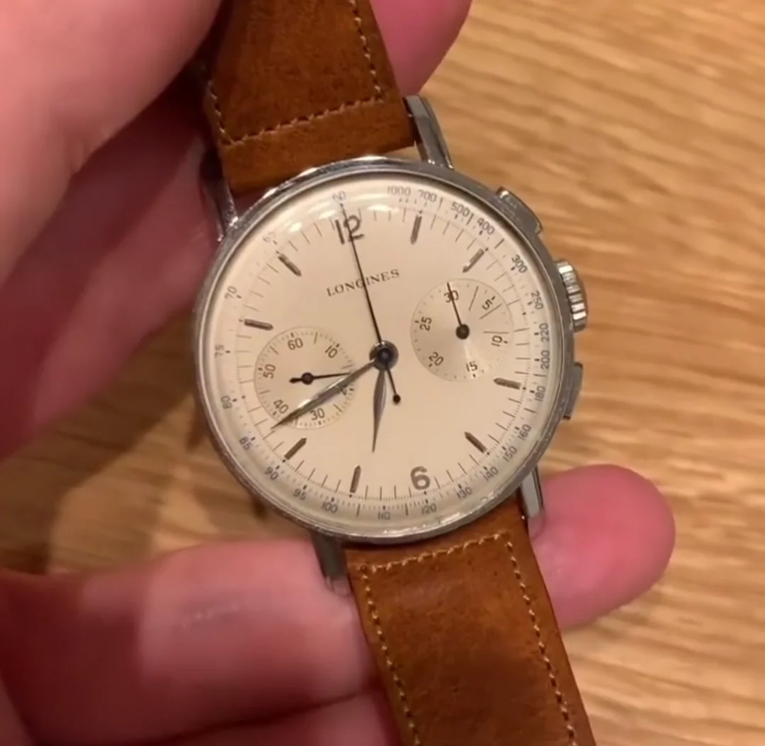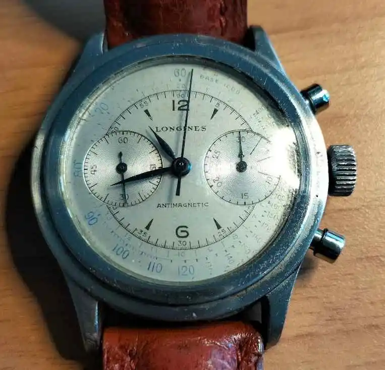 Complex dial/subdials, no obvious errors at first glance. Different fonts for the numerals (I could recognize at least one open six, some flat three, some round), logical arrangement, size of the LONGINES signature, edges of the subdials, length and style of the hands - everything seems in order (considering the quality of the photos).