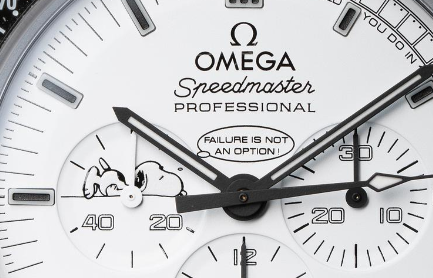 You have undoubtedly noticed sleepy Snoopy's thought balloon phrase "Failure is not an option" on the dial.
