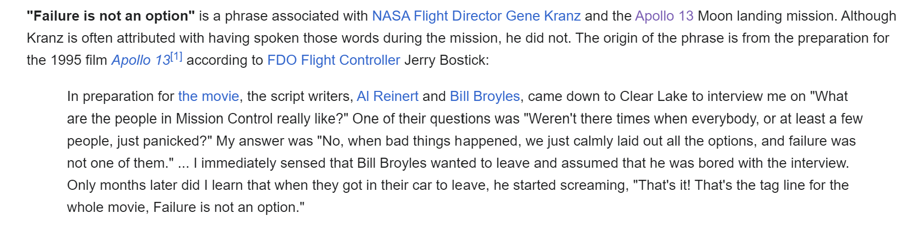 Well it turns out this phrase is attributed to flight director Gene Kranz, but guess what.....he didn't say that back in 1970! He only kind of said something similar in 1995 while being interviewed by the screenwriters for the Apollo 13 film. According to the keeper of internet knowledge, https://en.wikipedia.org/wiki/Failure_is_not_an_option ,