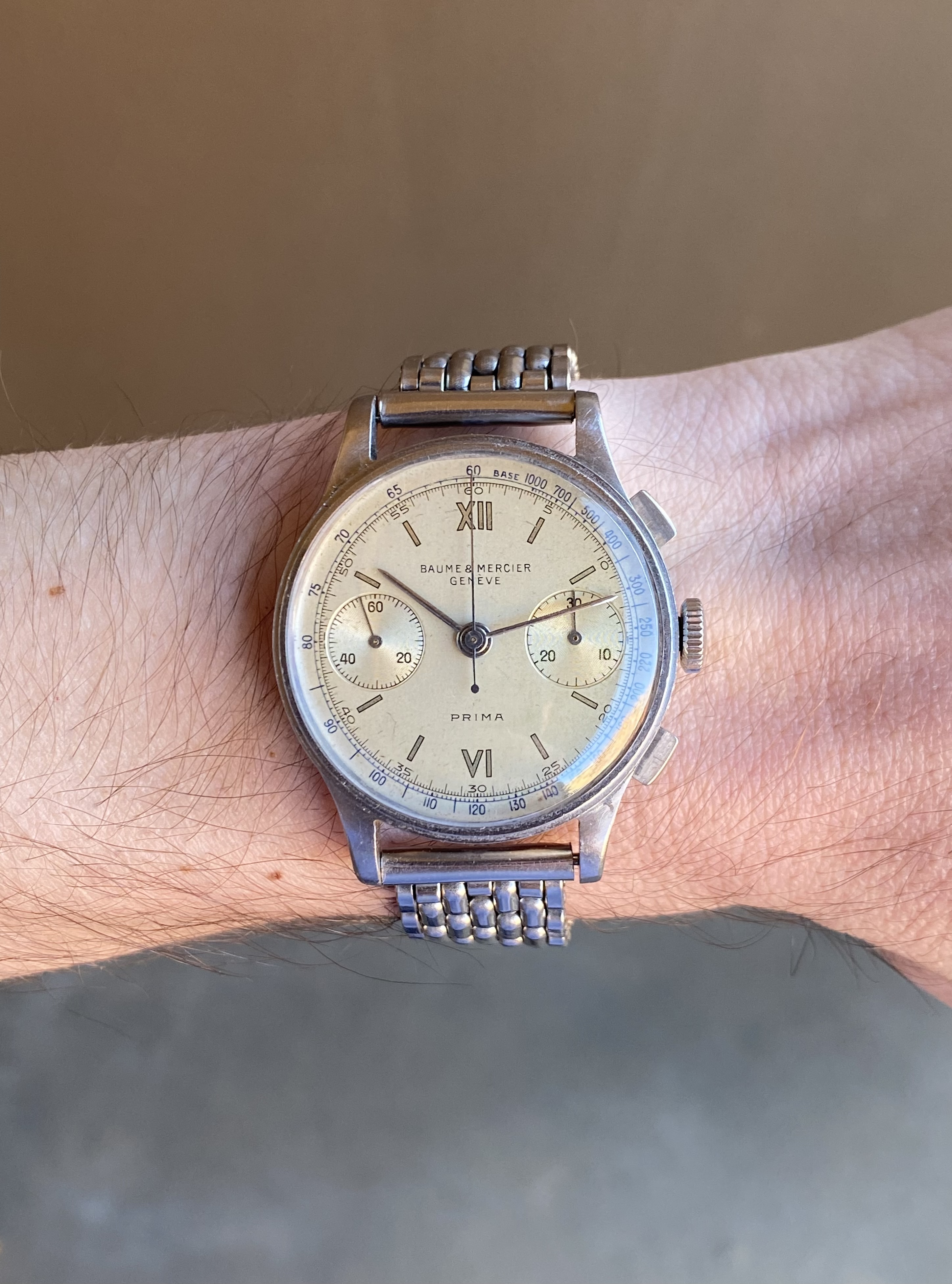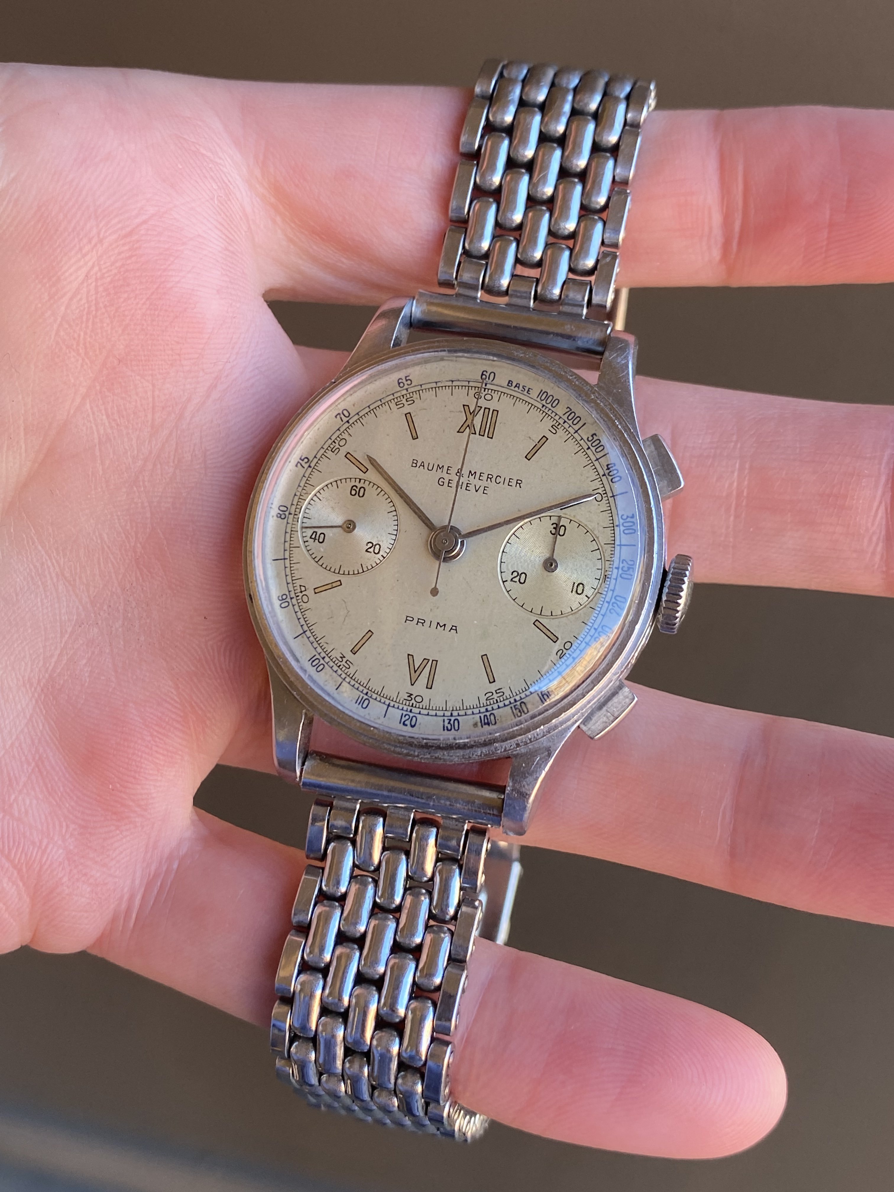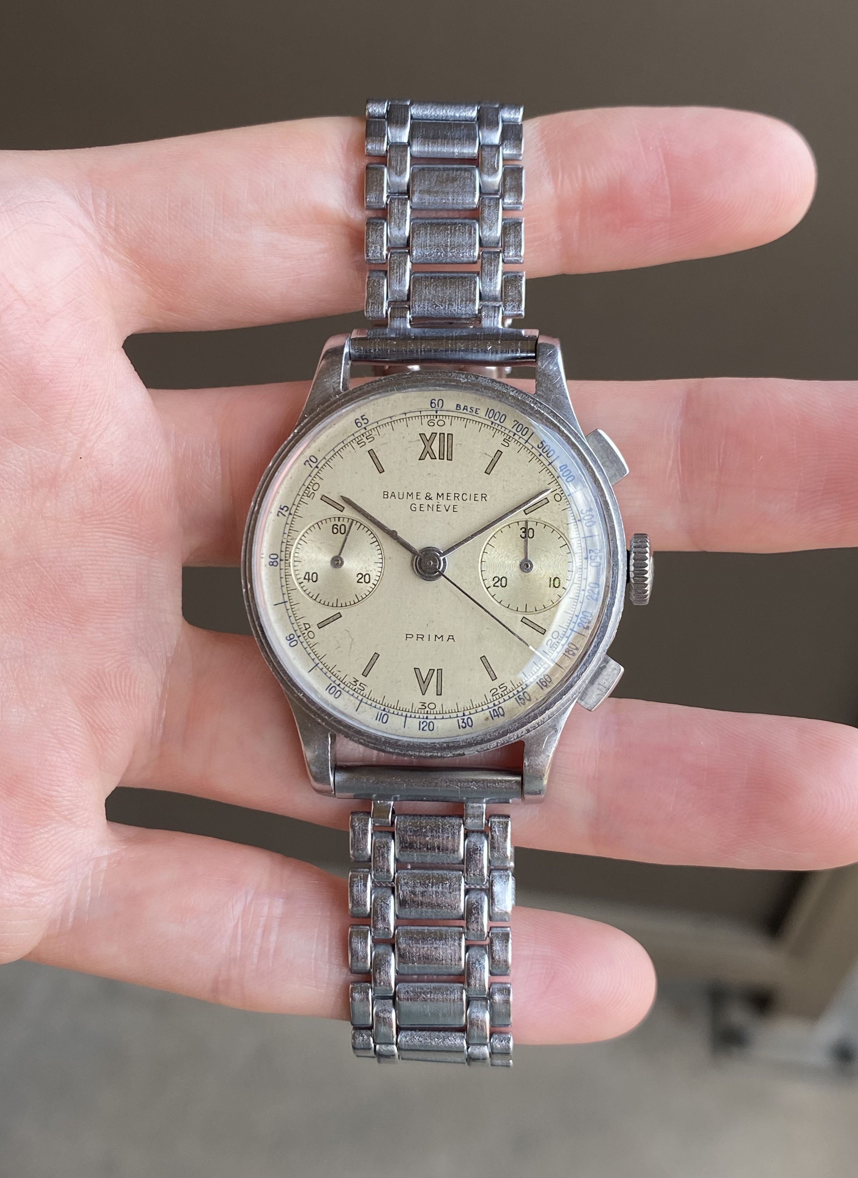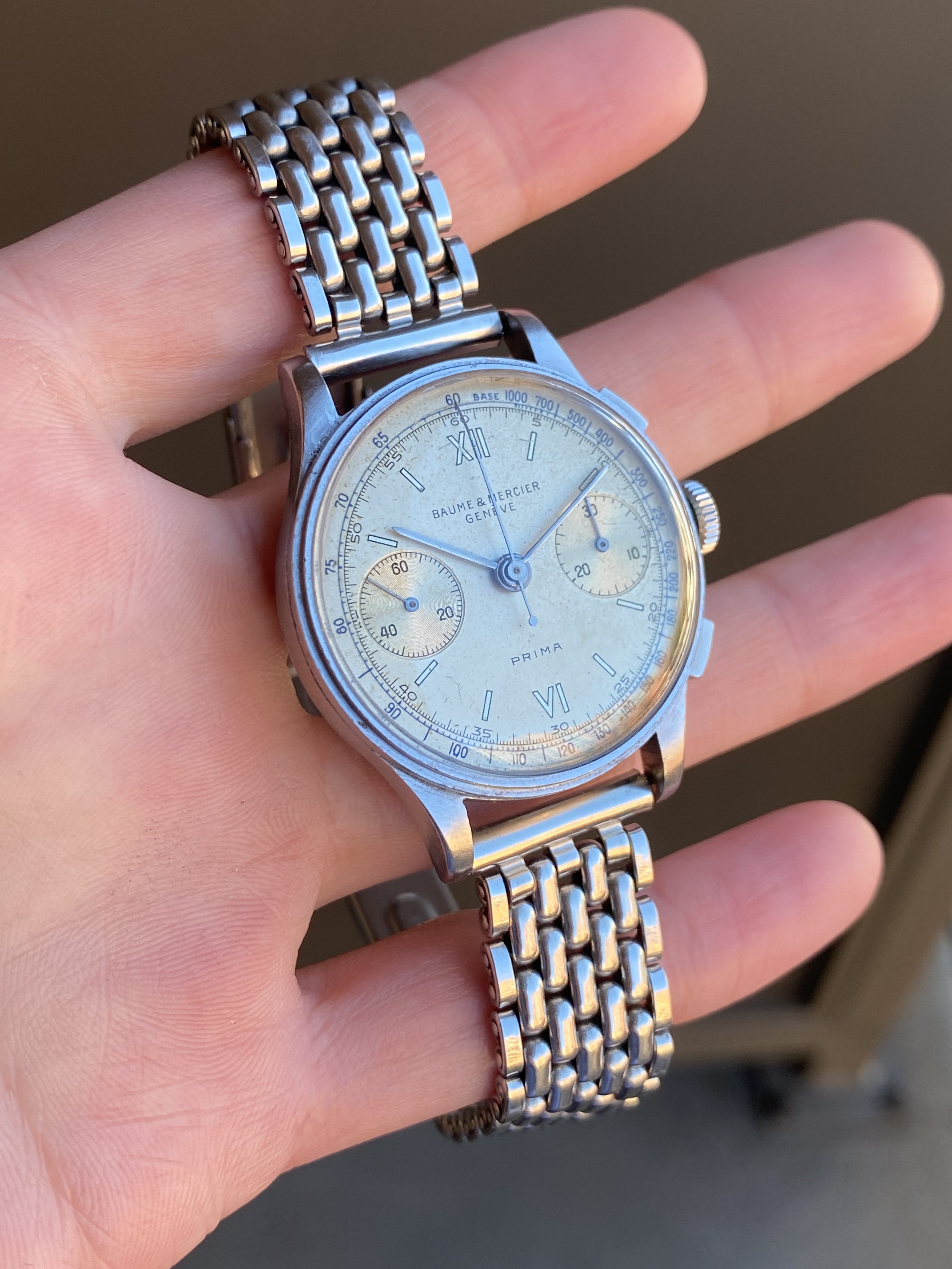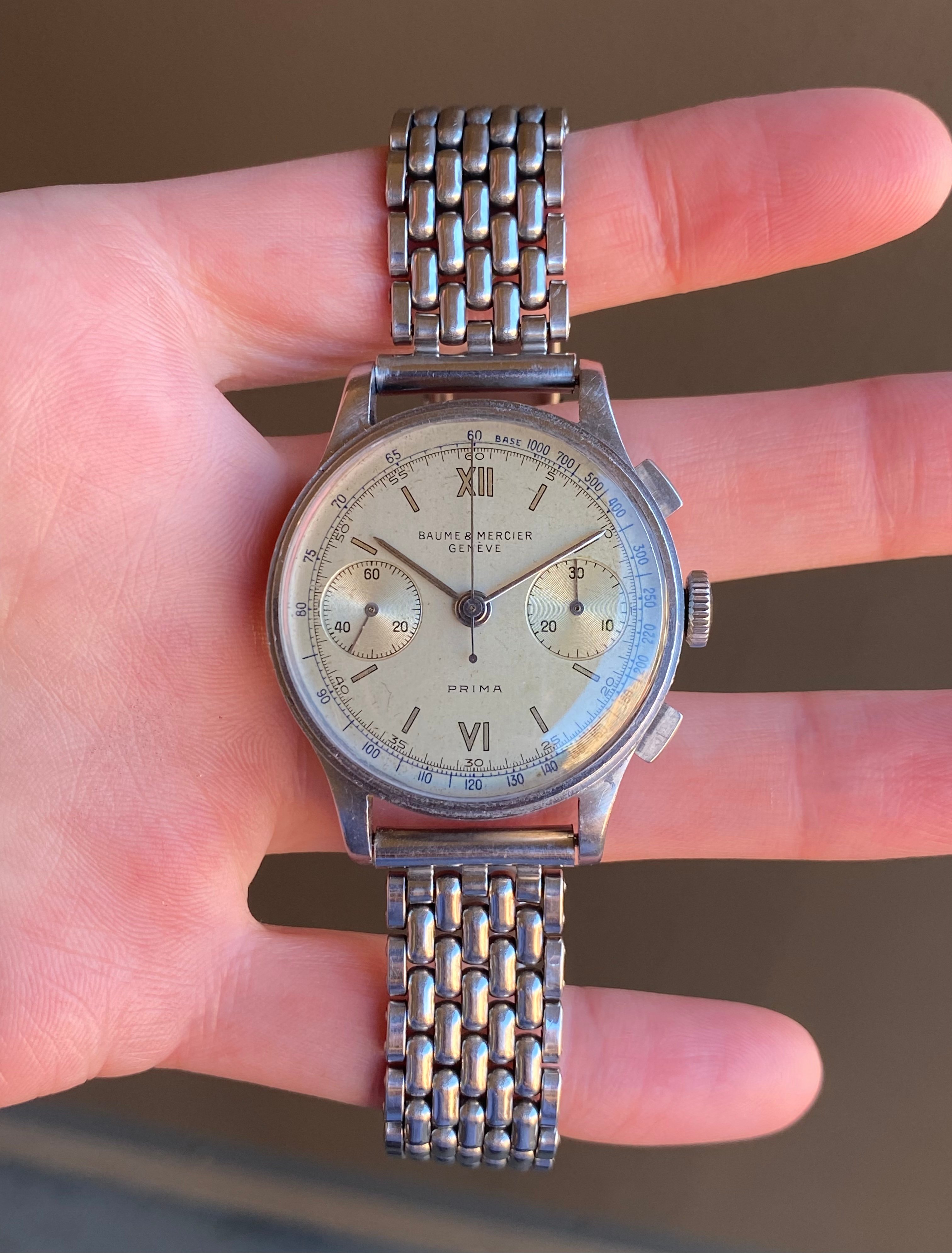 ·Up for sale is a very nice and uncommon 1940s 35mm steel, step case Baume & Mercier chronograph powered by a Valjoux 22 movement. From my research, it seems the Prima branding was reserved for models with the higher grade Valjoux movements and steel or solid gold cases. Please see below for full info, and feel free to message me with questions.