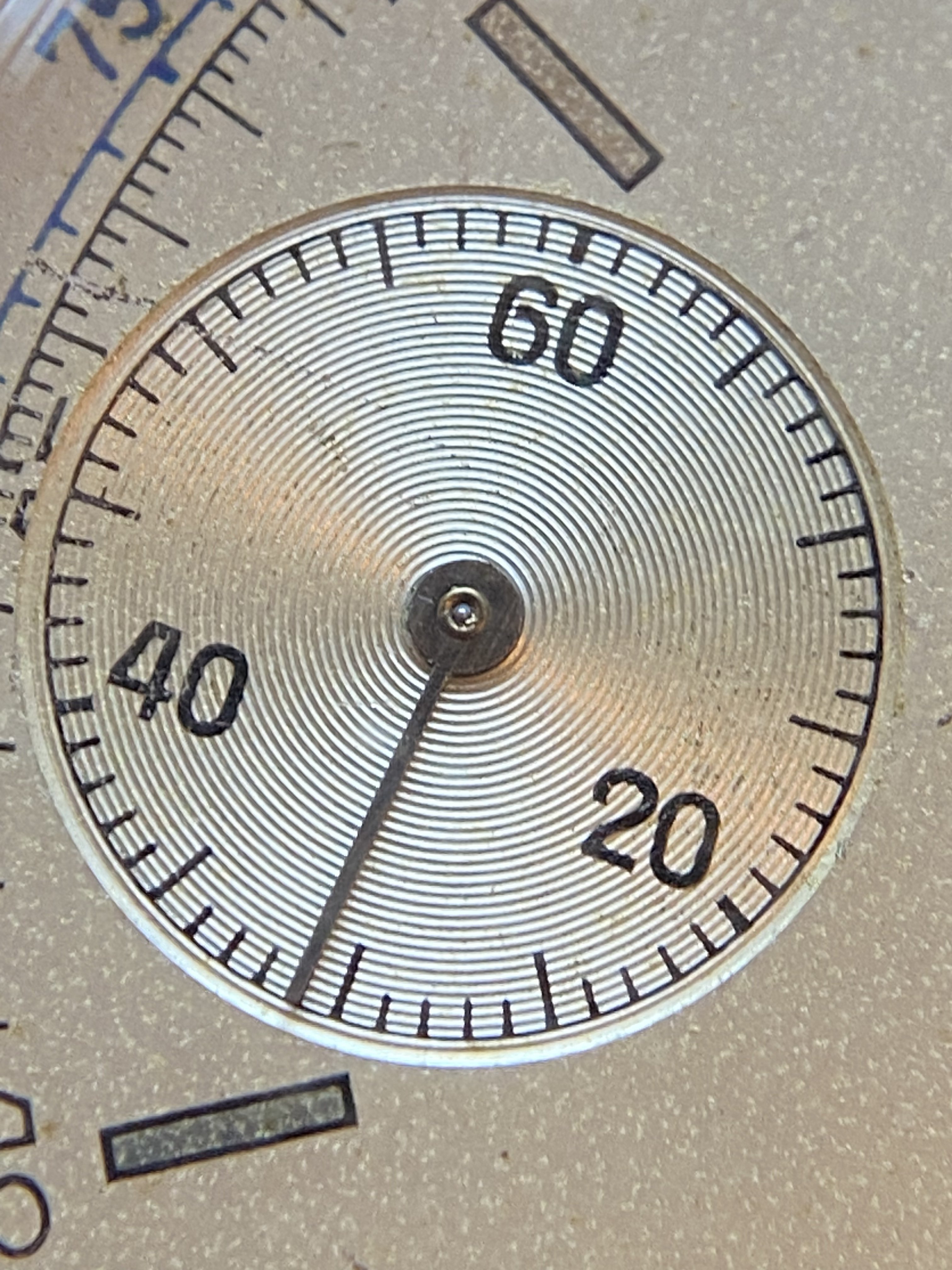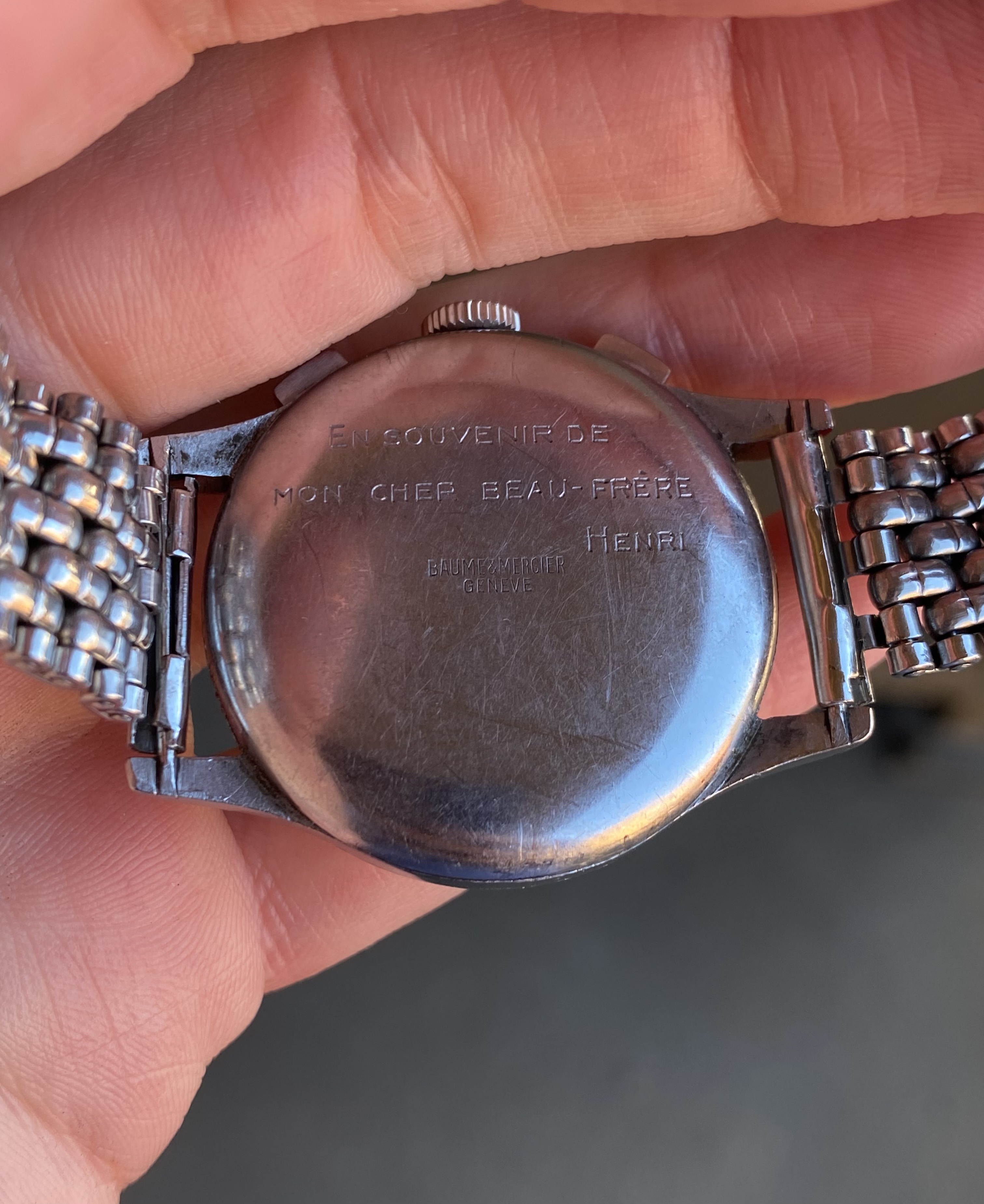 Case: Original, unpolished 35mm stainless steel case features an attractive stepped bezel and wears very well on the wrist. The case is in nice condition. It has an engraving on the caseback that reads (in French): “in memory of my dear brother in law Henri”. Case has 18mm fixed bar lugs.