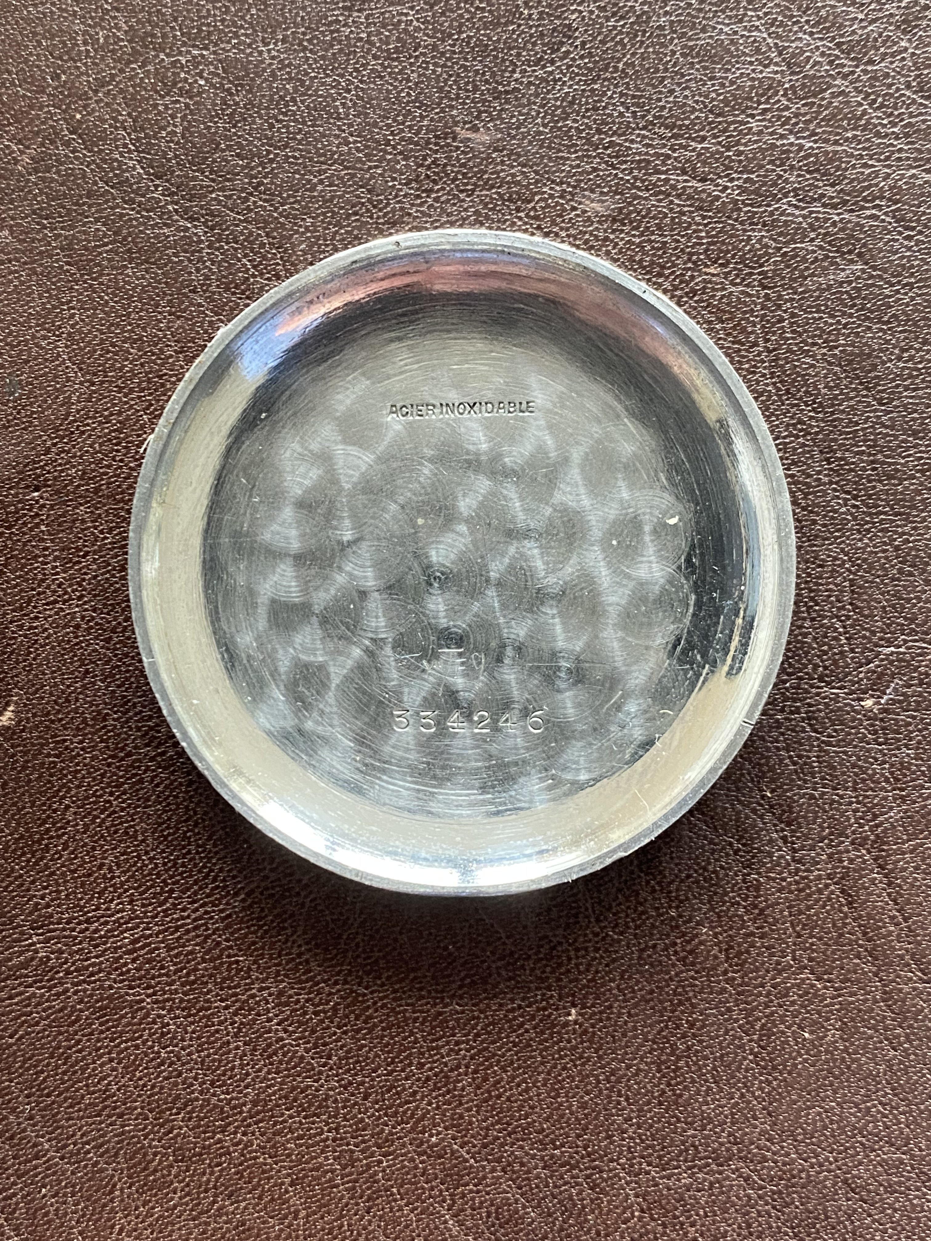 Case: Original, unpolished 35mm stainless steel case features an attractive stepped bezel and wears very well on the wrist. The case is in nice condition. It has an engraving on the caseback that reads (in French): “in memory of my dear brother in law Henri”. Case has 18mm fixed bar lugs.