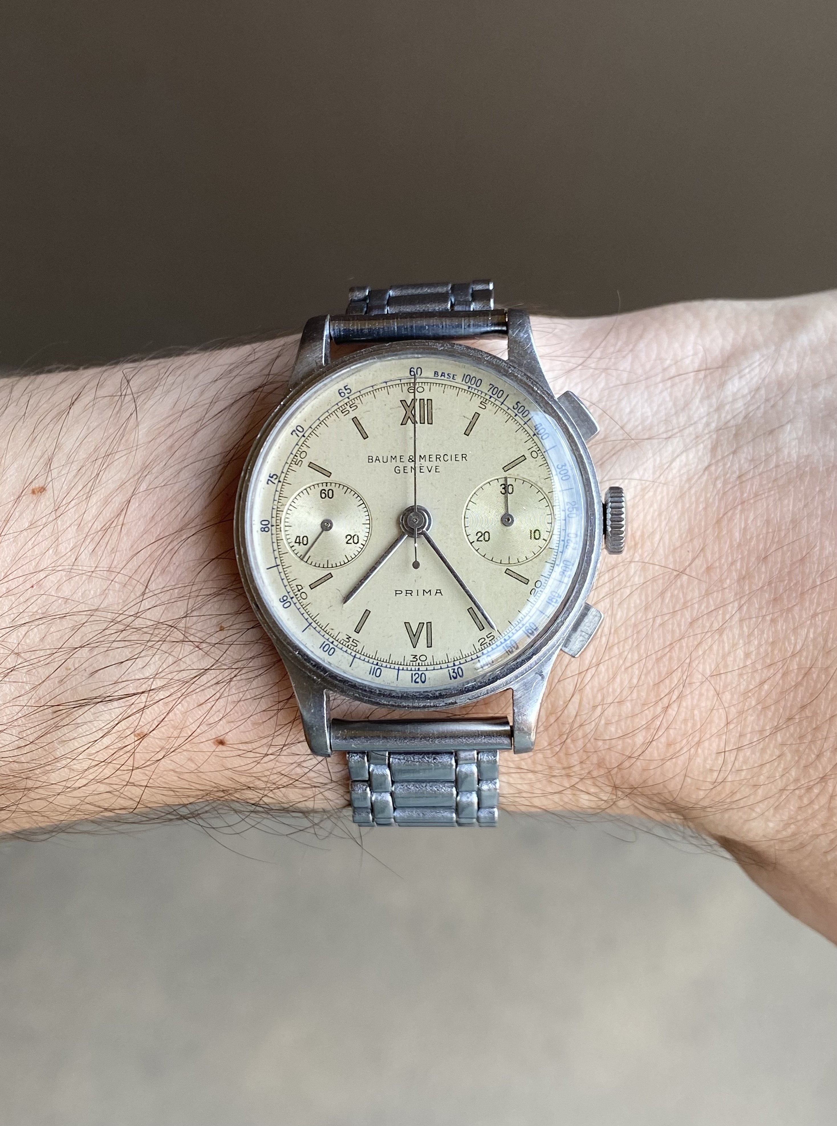 ·Up for sale is a very nice and uncommon 1940s 35mm steel, step case Baume & Mercier chronograph powered by a Valjoux 22 movement. From my research, it seems the Prima branding was reserved for models with the higher grade Valjoux movements and steel or solid gold cases. Please see below for full info, and feel free to message me with questions.