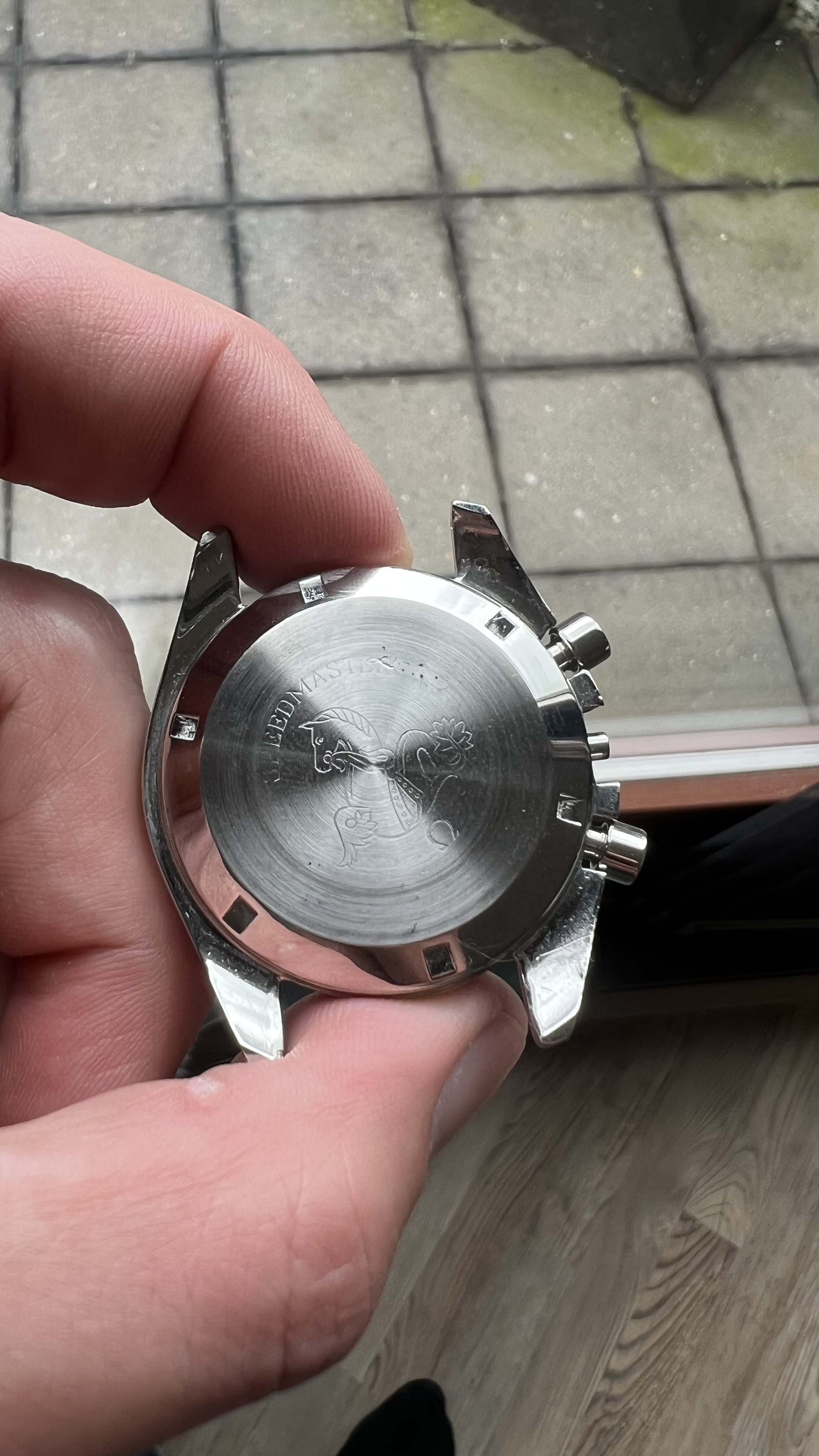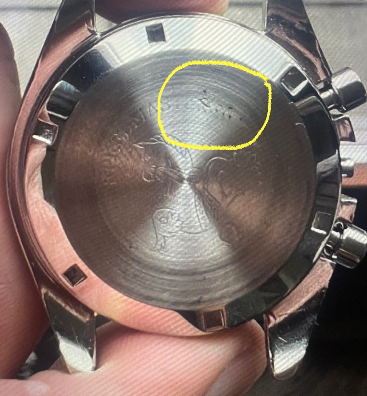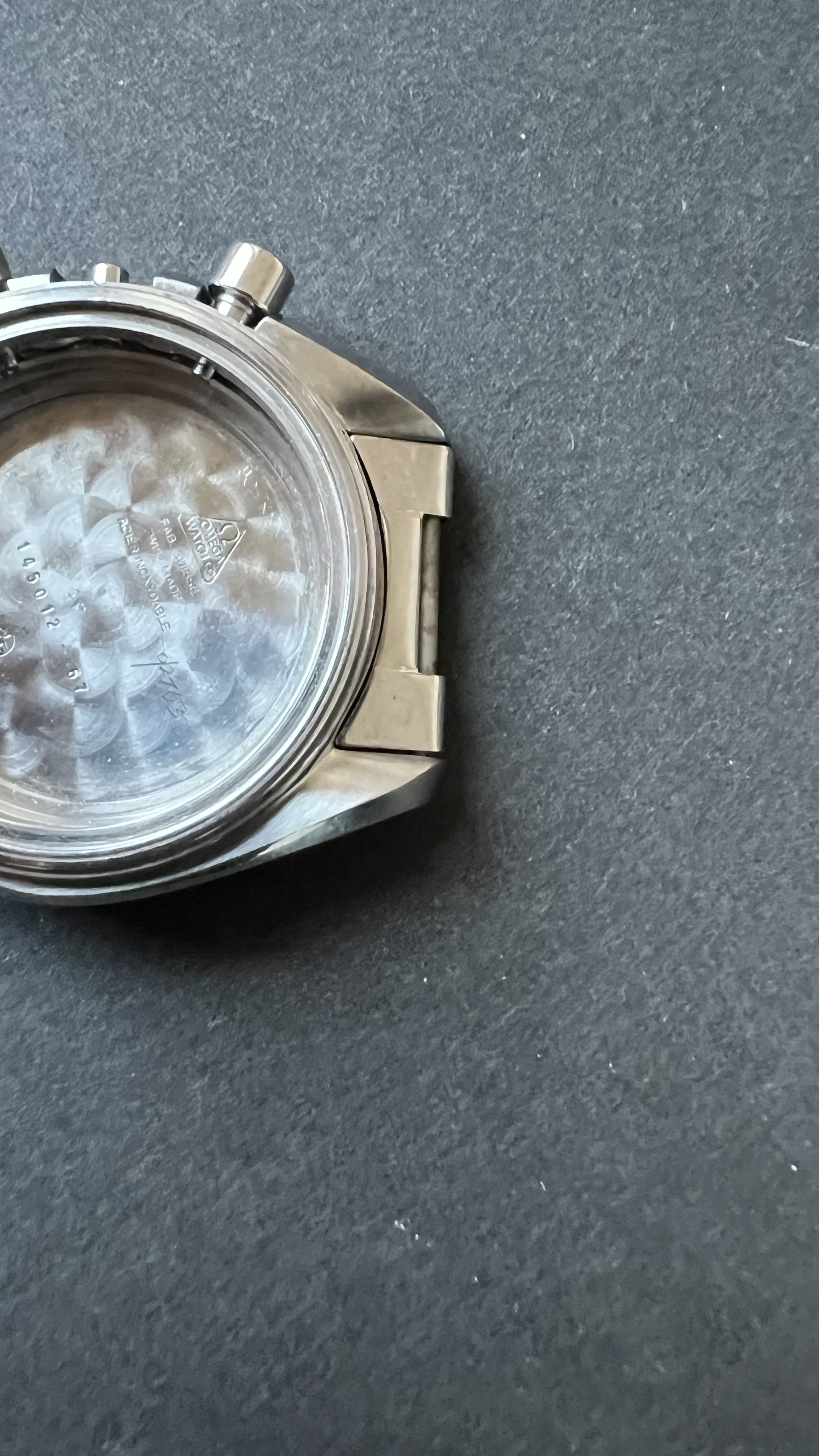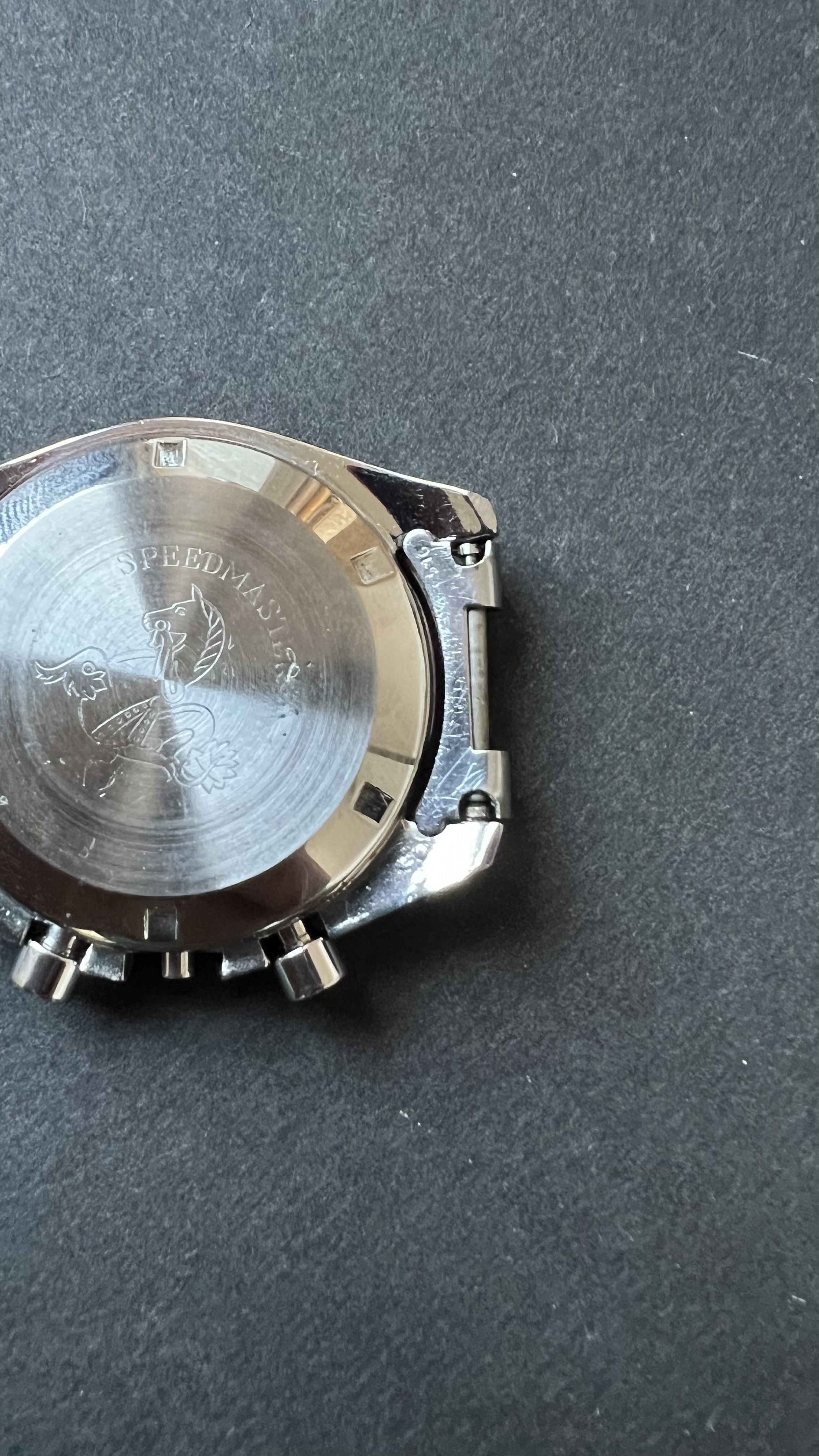 Caseback: Came with a replacement case which was in decent state. It carried an engraving which we had removed. The original seahorse engraving is still there. The removed engraving is almost gone without a trace, except for a tiny scratch near the R in Speedmaster. We have chosen not to attempt to remove that last trace in order to preserve the original engraving as it came from the factory. I have attempted to picture it at its worst in the last pictures attached below. Hope the pictures make the rest of the description above clear as well.