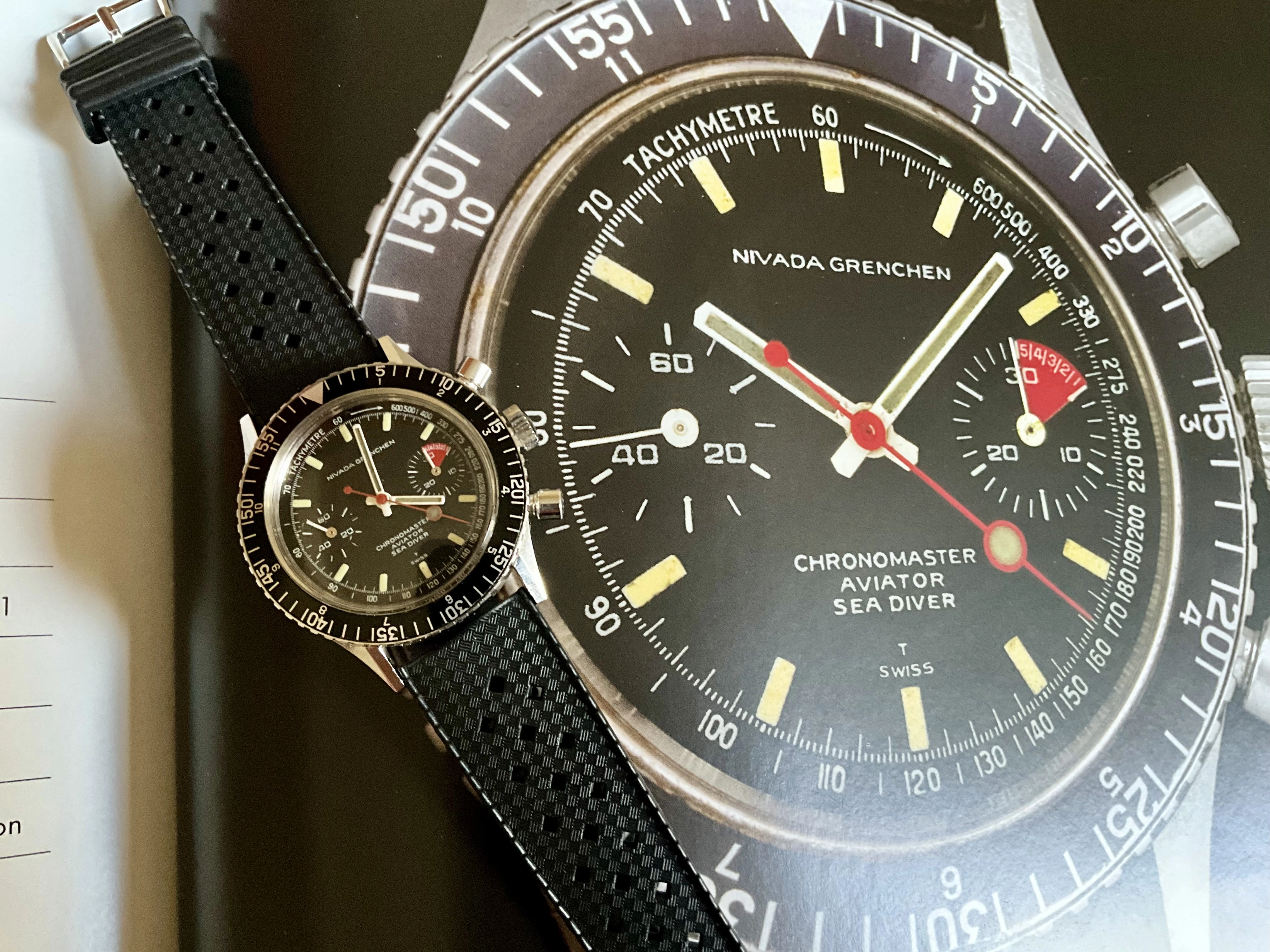 What I think I see as a beginner: Chrono movement does not engage, but the reset seems to work (can see the hands move a bit), watch runs strong and keeps fairly good time, bracelet appear to be 1175, end links are 47s, clasp is #12 but dates to mid-70s, lume isn’t thick and sandy like others I have seen but reacts like 1968 vintage lume under a black light (glows for 7sec after removing the light), crystal is not OEM, dial looks to only have one little freckle (above the 5 marker), paint on the hands looks pretty fragile and likely will need conservation when serviced, movement looks complete and corrosion free, crown looks correct.