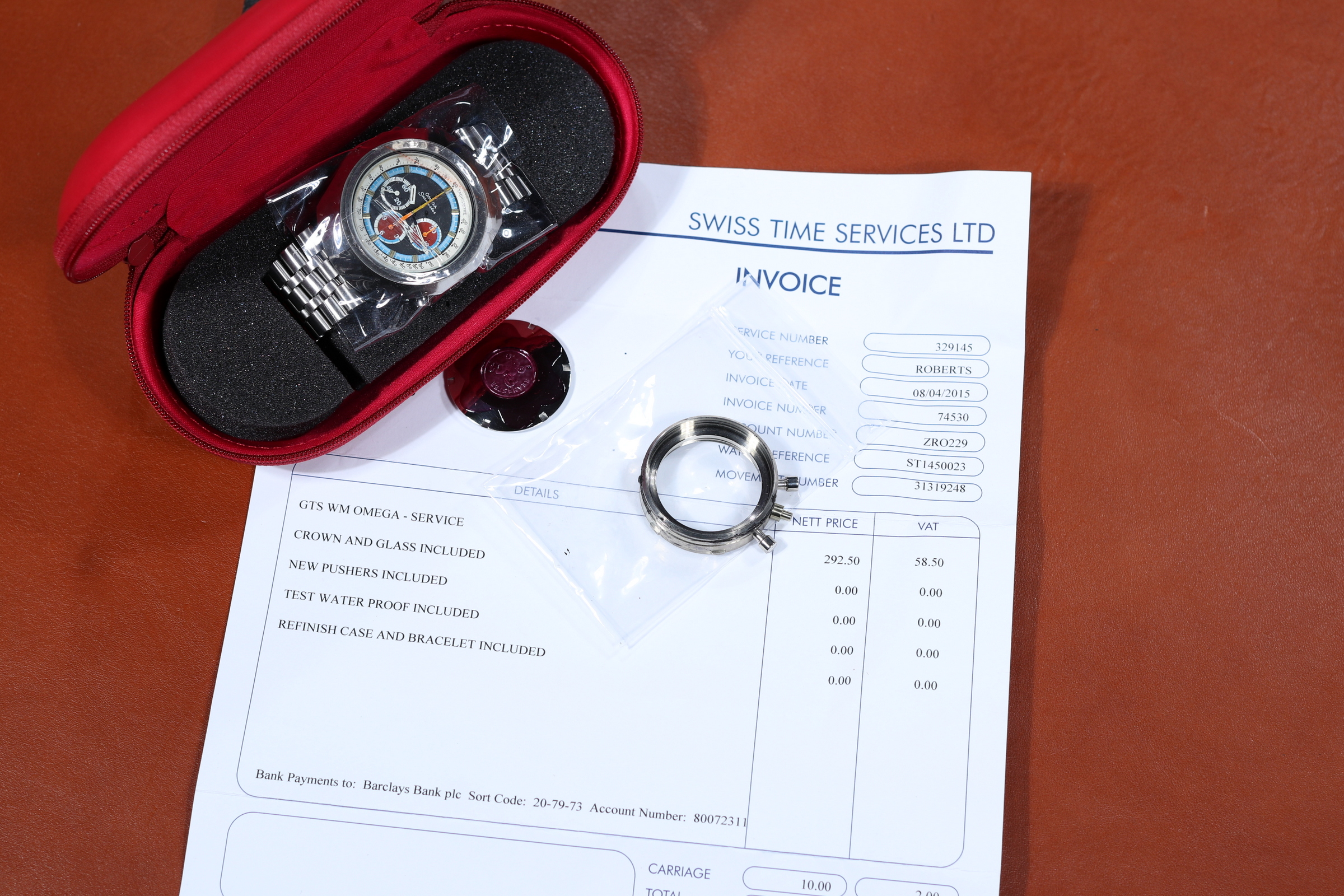 You will note the invoice states "Case Refinish". This obviously did not happen, as these Tungsten cases cannot be refinished due to the Vickers developed coating. In fact, finding an Anakin without case damage is rare. While it is very hard (resists scratching) it is a little brittle. So if you smash it against a steel door, as it will chip, rather than dent.