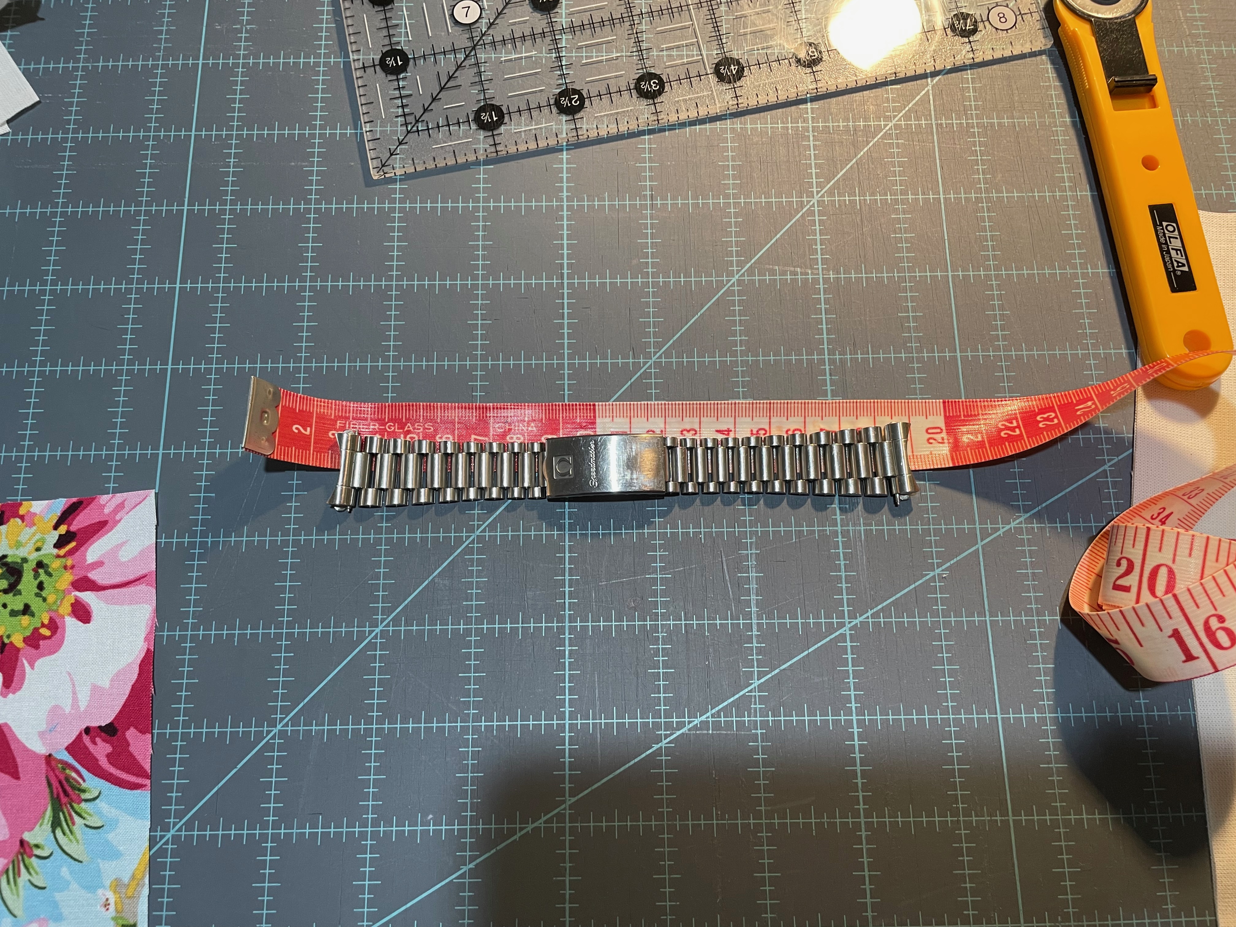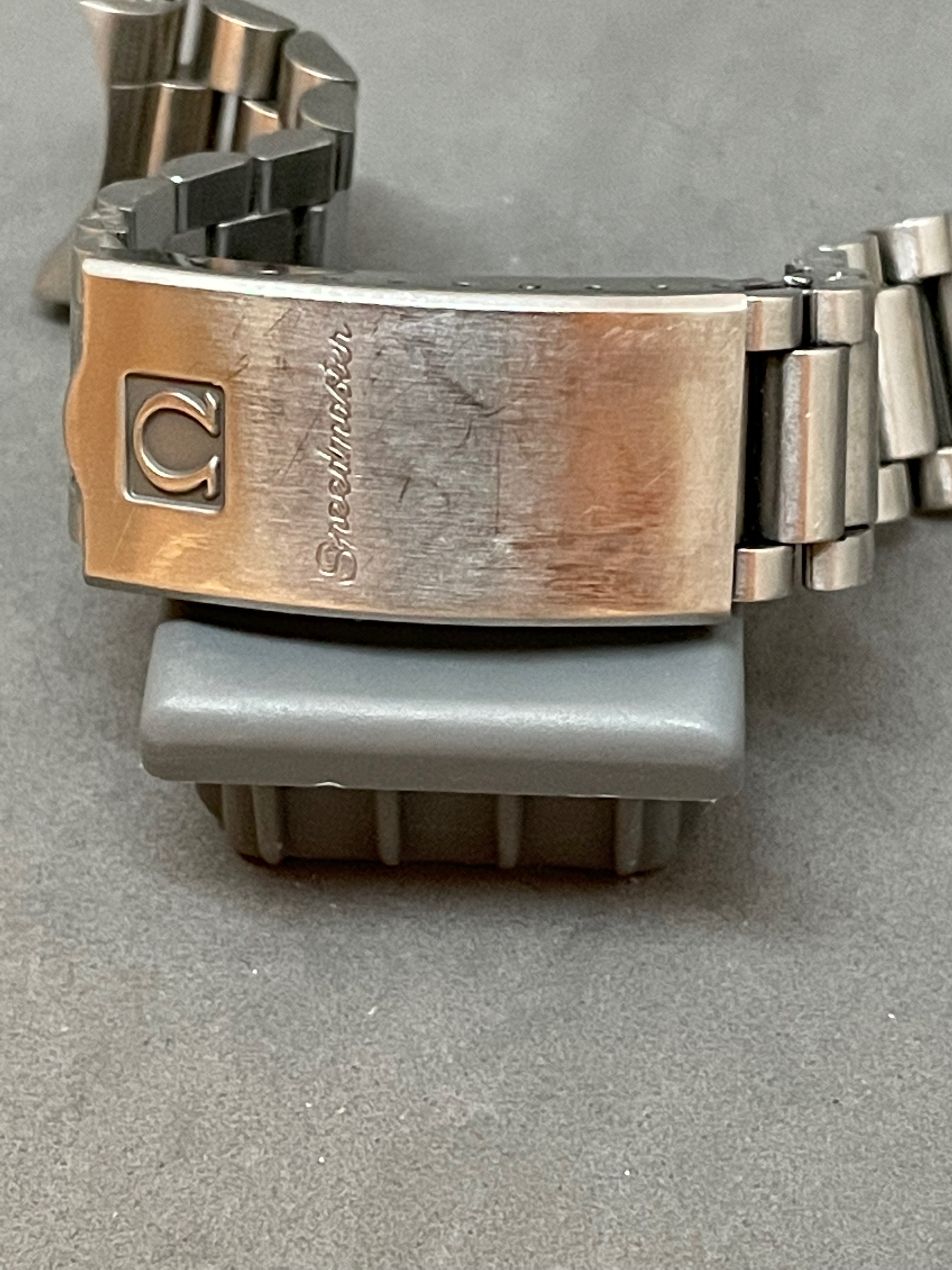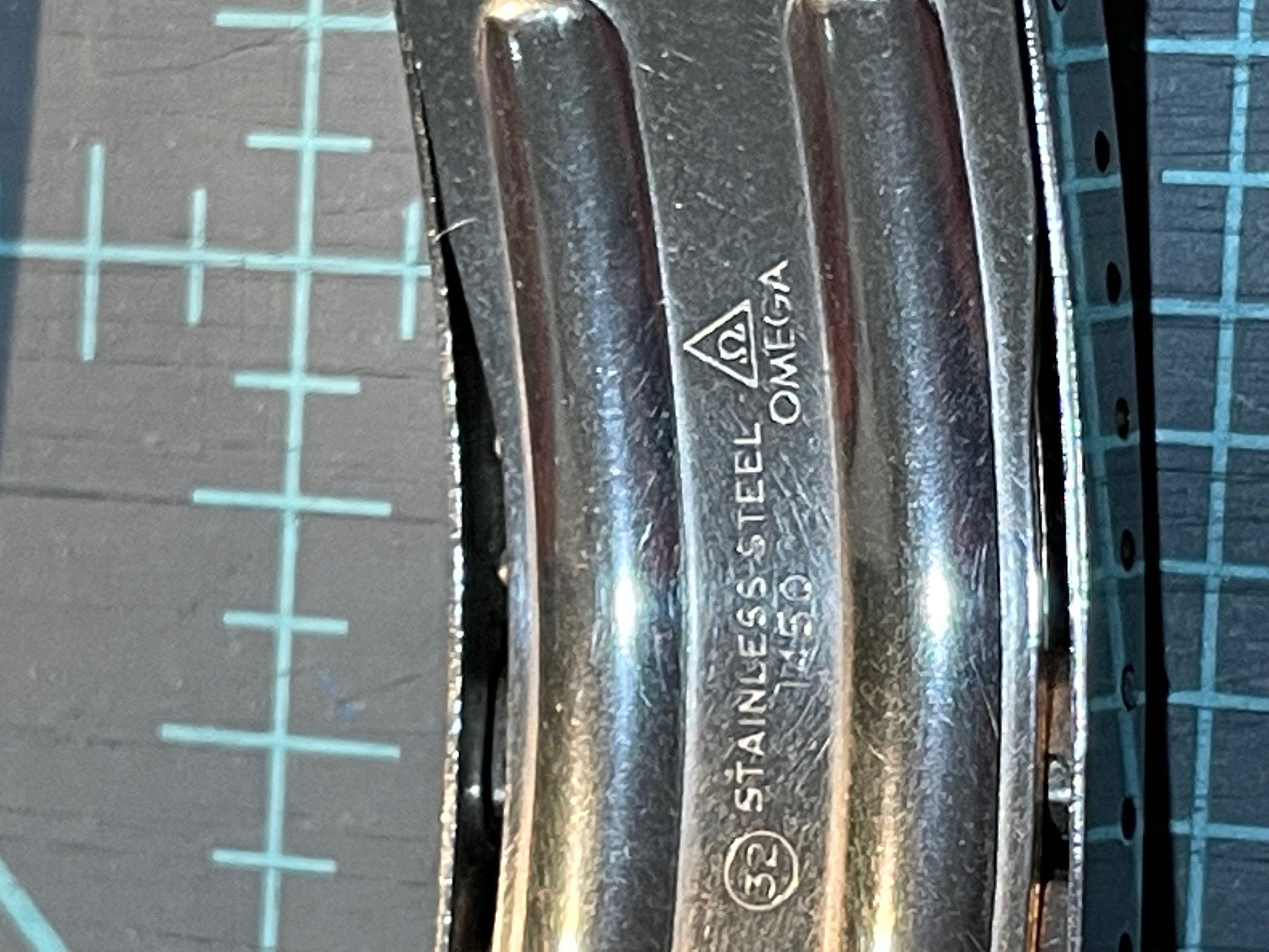 ·On offer is this Omega 1450 bracelet with 808 endlinks. Clasp is scuffed from desk diving. Measured as shown laid flat at 15.25 cm from spring bar to spring bar. There are three more adjustment holes, so another cm available. Quick release pin in place.