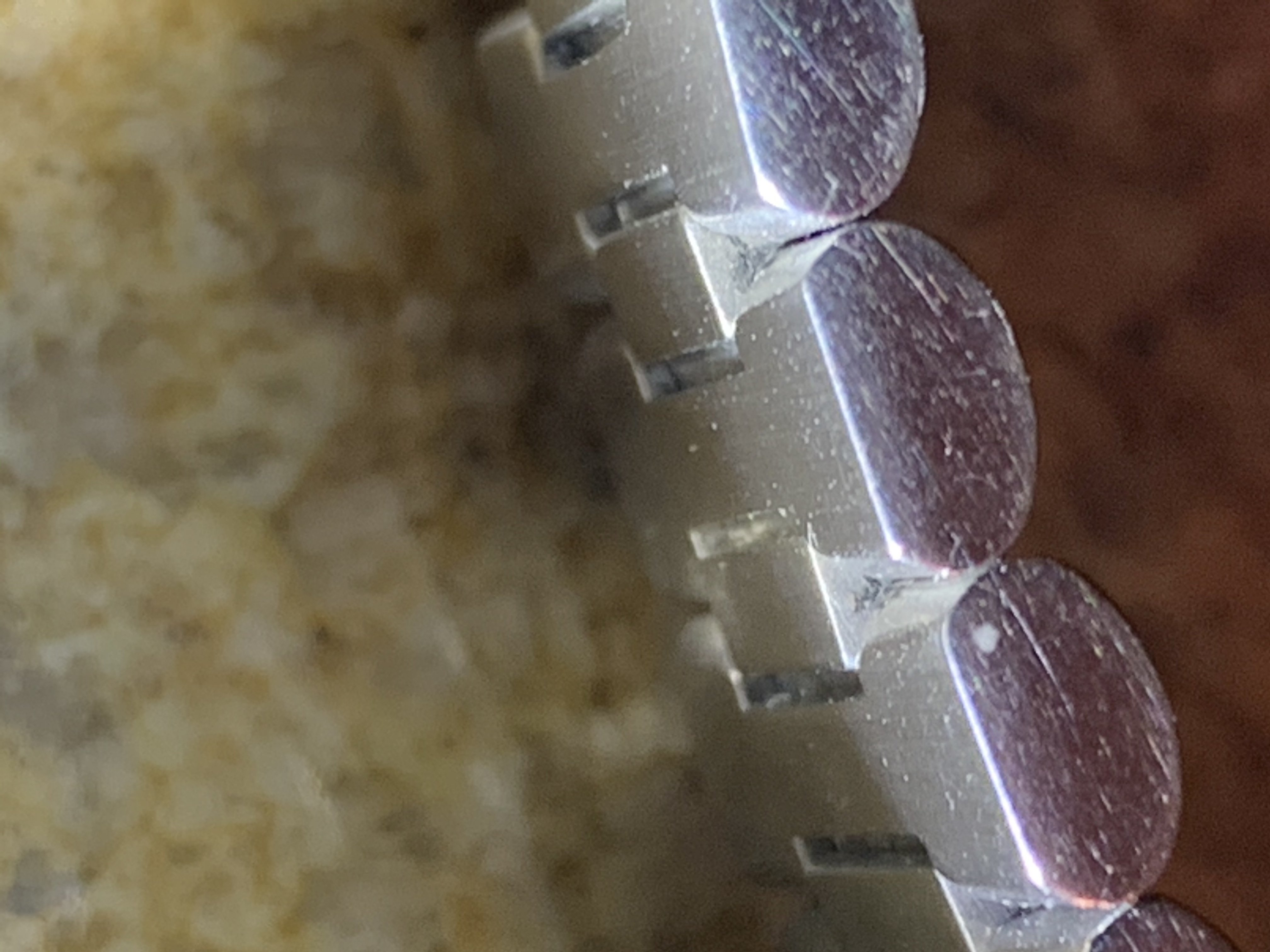 That's really interesting, never noticed this before. I just checked my 1479 and it has the same marks - although they appear to be notches in the links, rather than any actual joining wires? Could be a leftover mark from the steel folding / joining process?