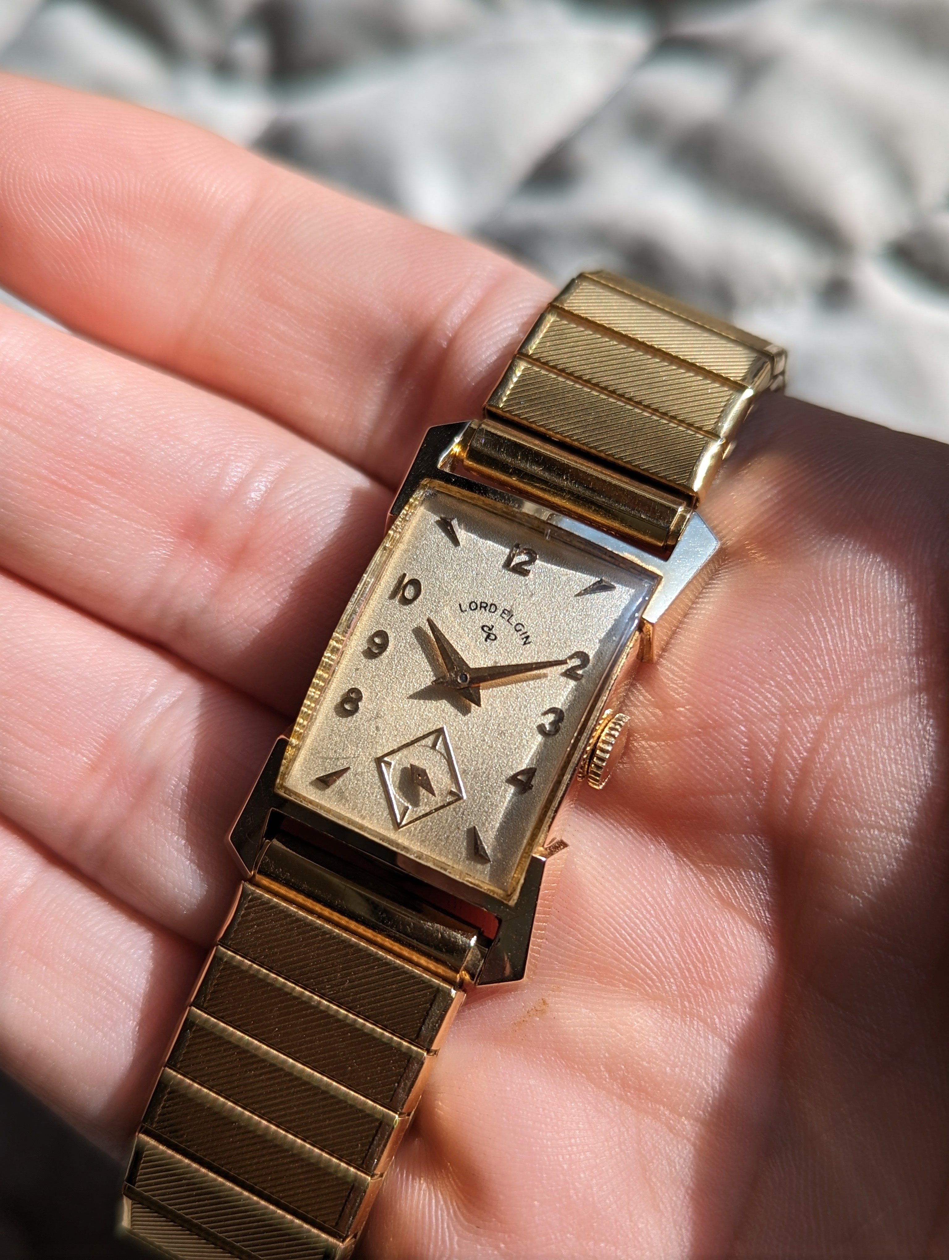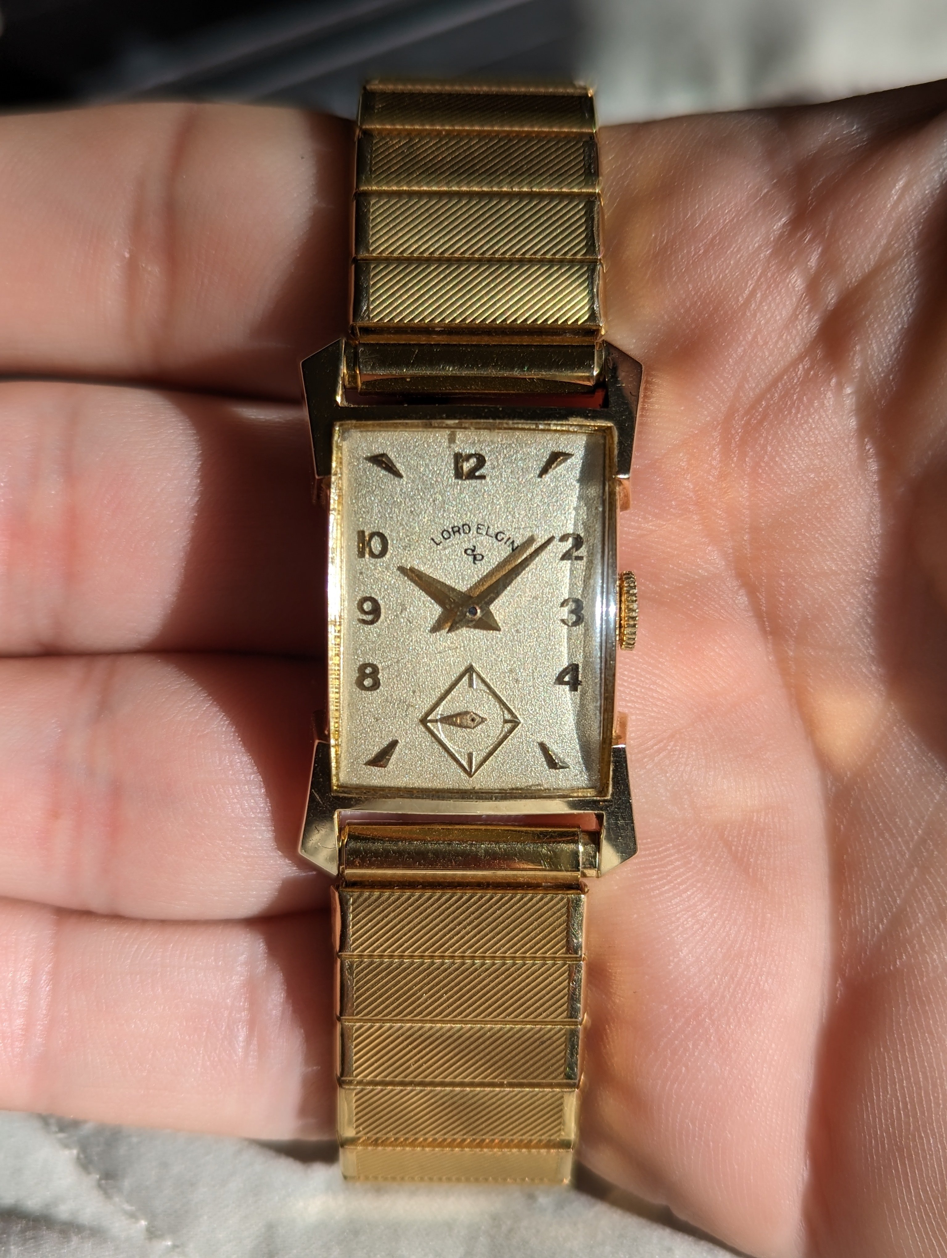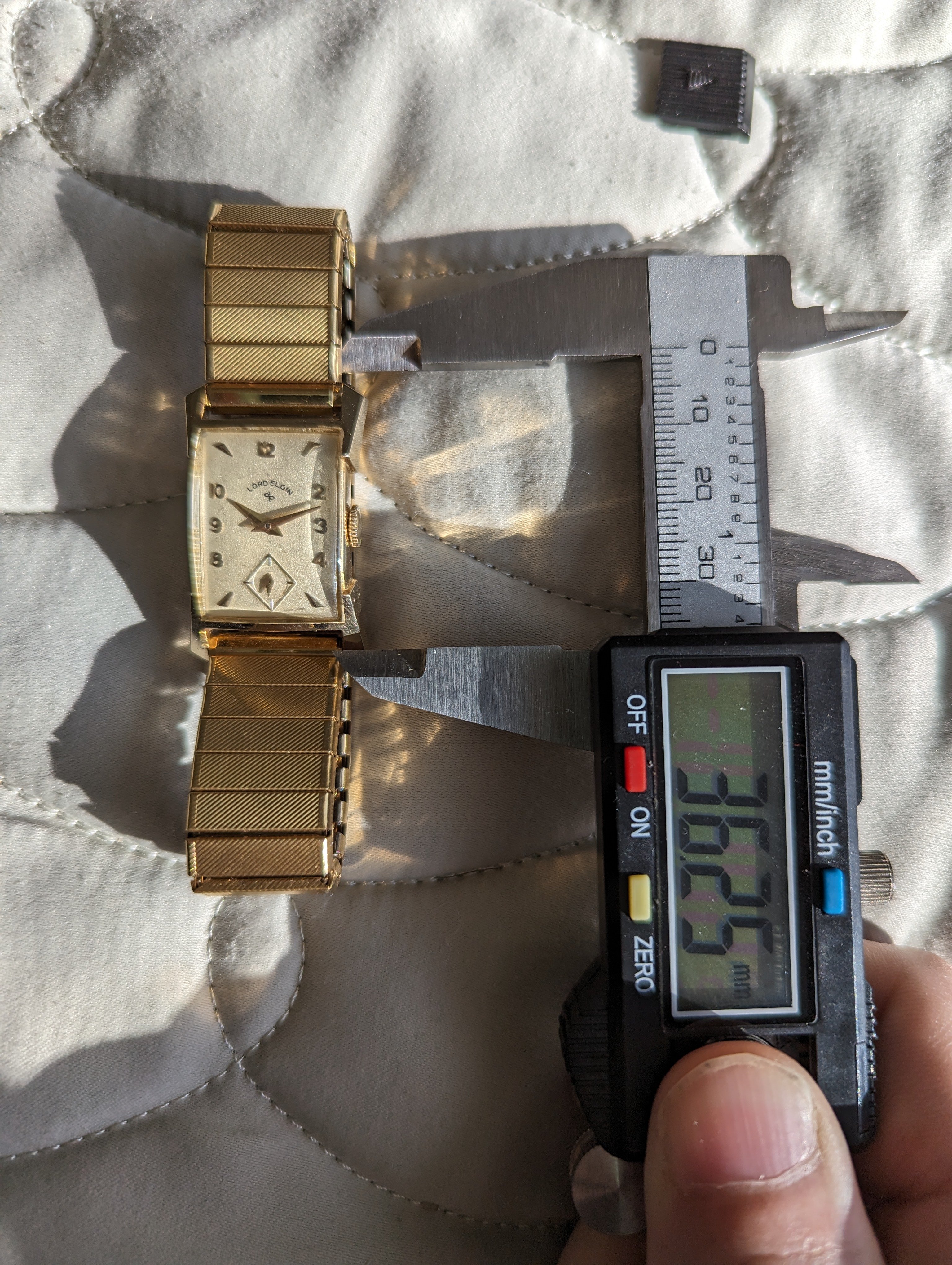 ·Here we have a beautiful condition Lord Elgin from 1956. American made, and solid 14k gold. I'm selling this for roughly it's scrap value! When I bought the watch, about a year ago, the seller claimed it was serviced. So it keeps great time. Dimensions are shown in the pictures below on the caliper. The lug width is 18mm. I have it on a gold plated Speidel. I'm asking $350. Ask me anything and check my references. Thanks for looking.