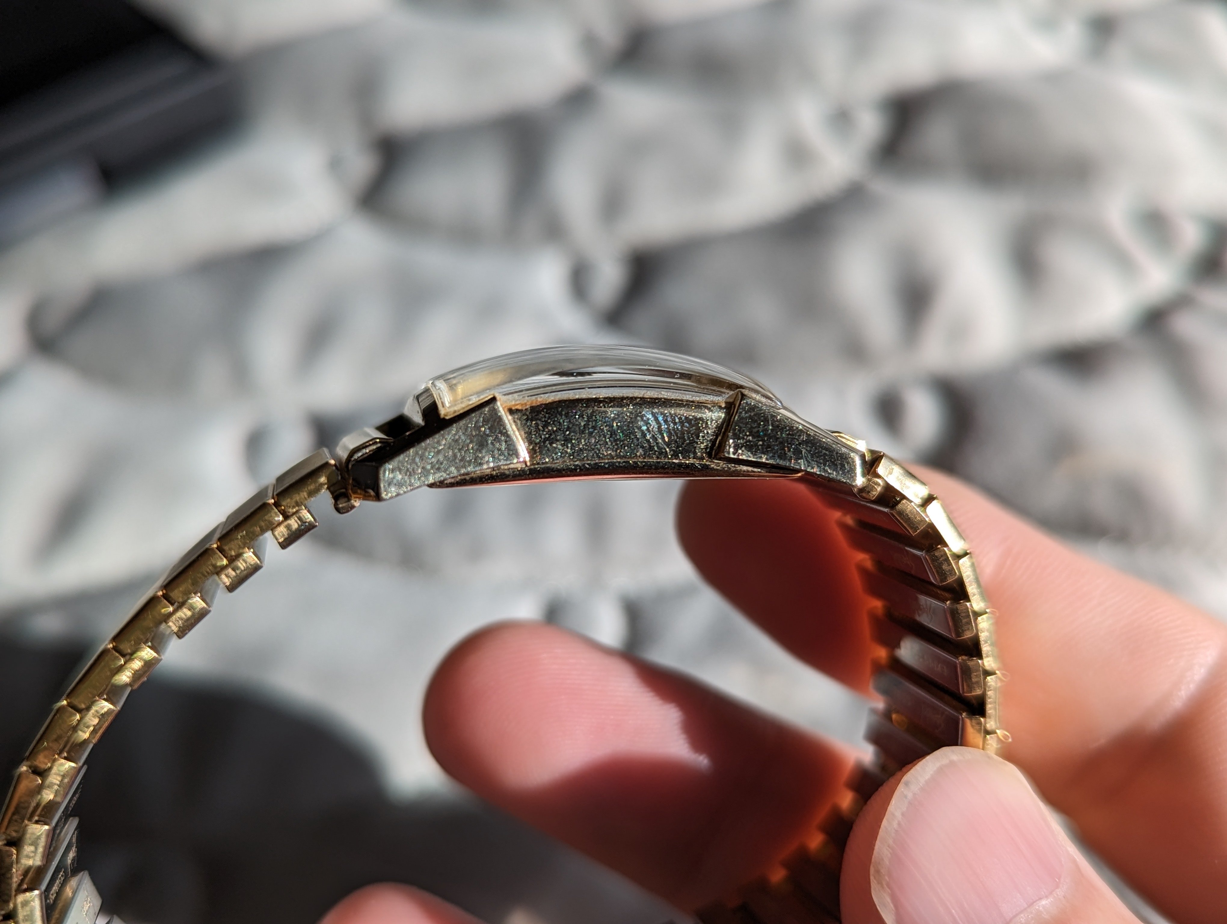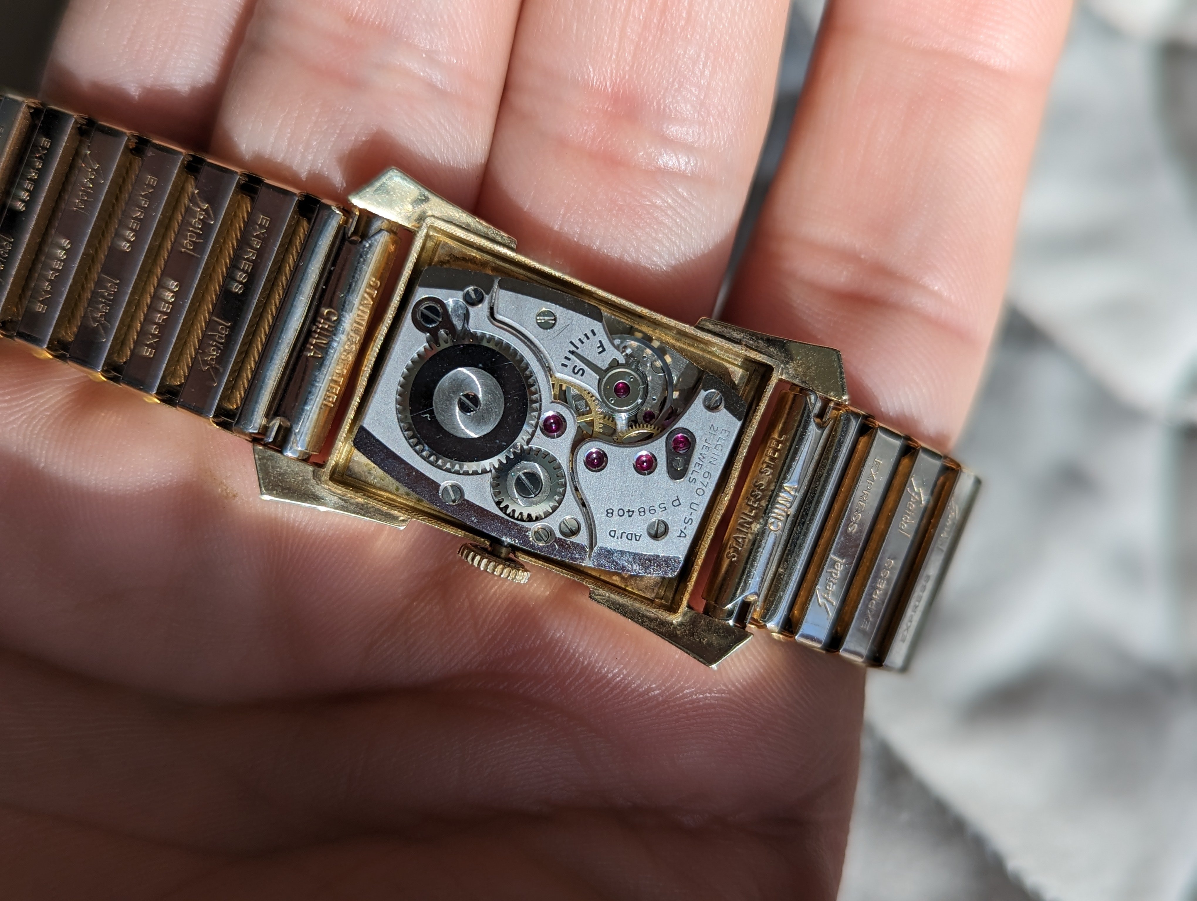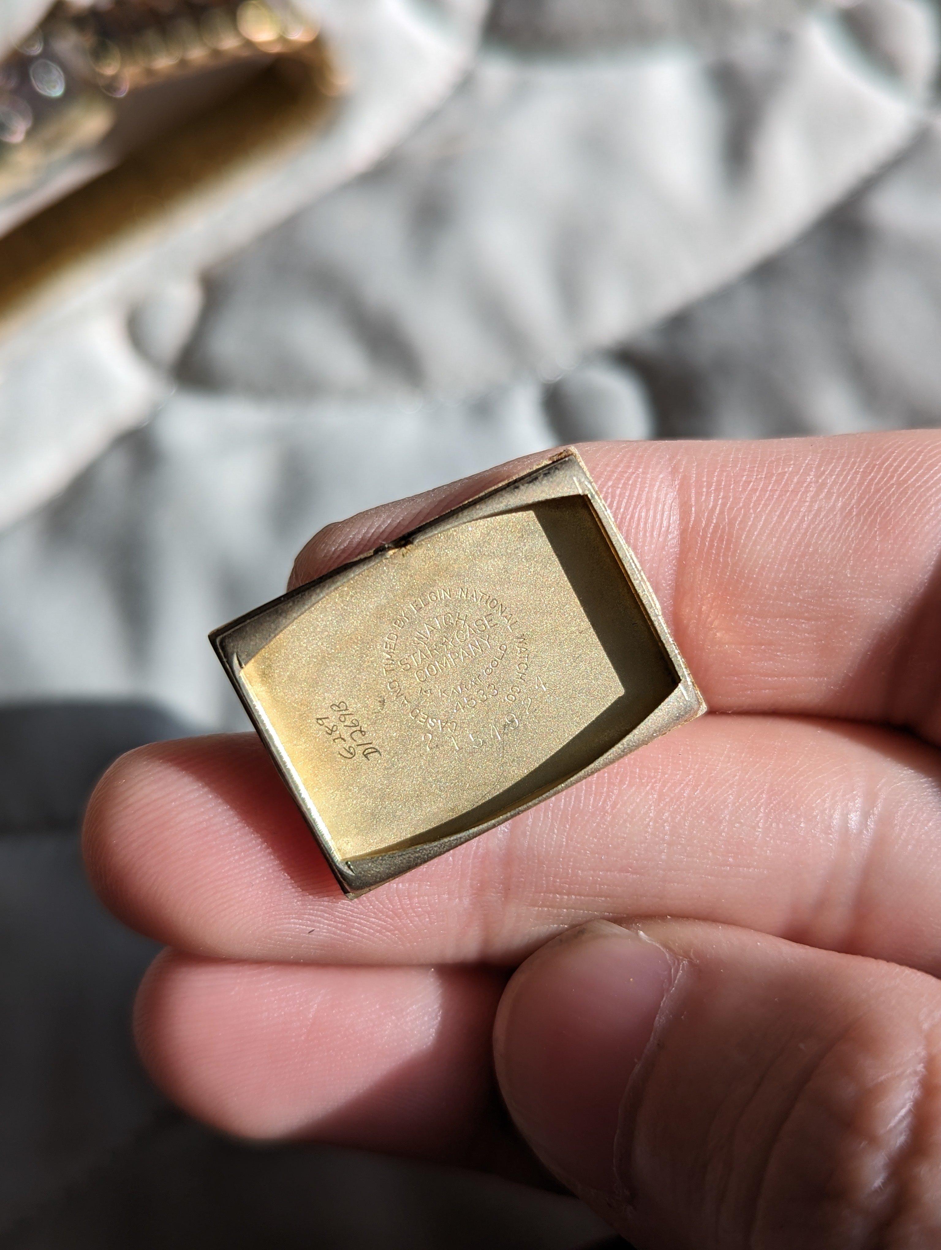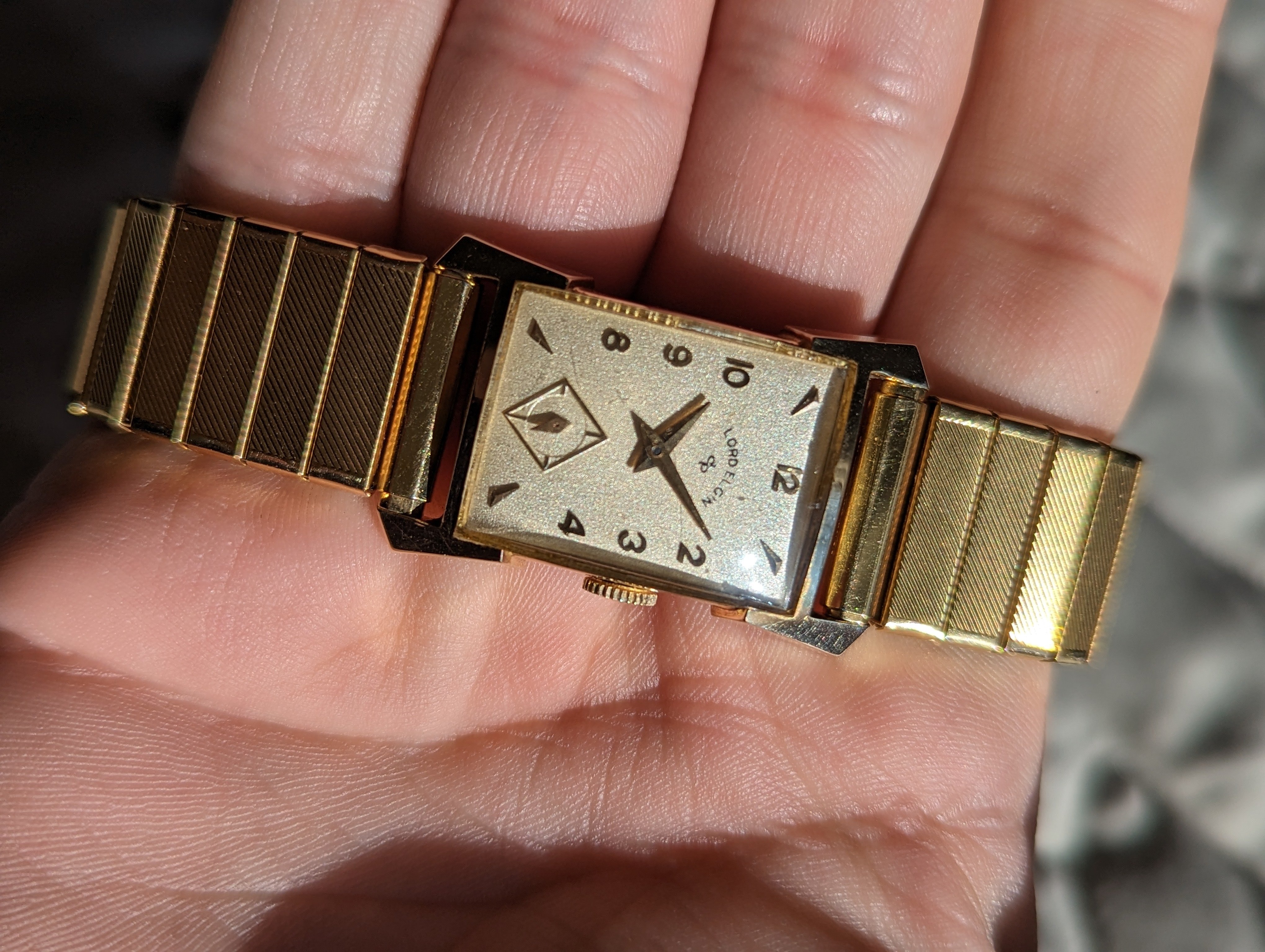 ·Here we have a beautiful condition Lord Elgin from 1956. American made, and solid 14k gold. I'm selling this for roughly it's scrap value! When I bought the watch, about a year ago, the seller claimed it was serviced. So it keeps great time. Dimensions are shown in the pictures below on the caliper. The lug width is 18mm. I have it on a gold plated Speidel. I'm asking $350. Ask me anything and check my references. Thanks for looking.
