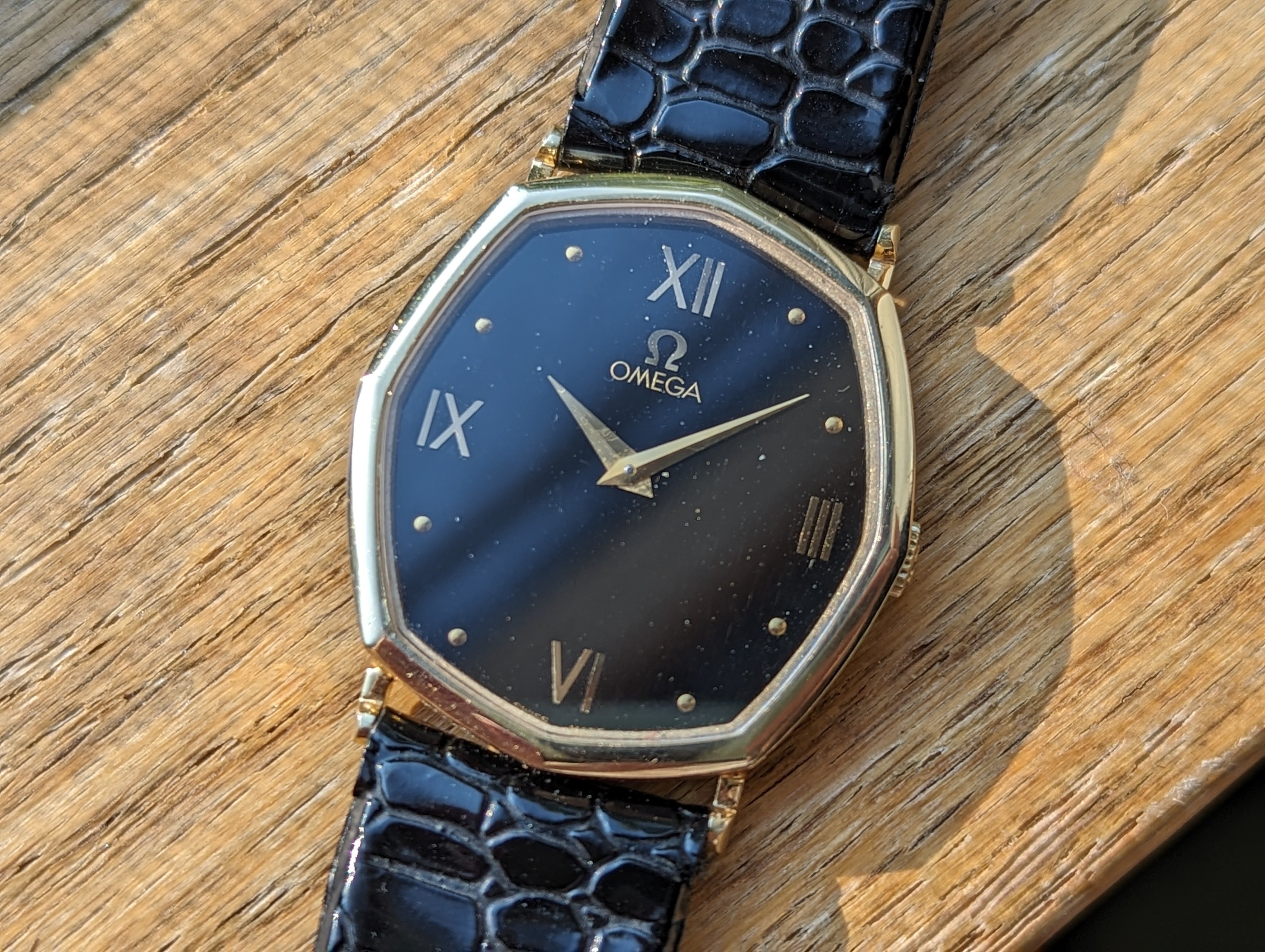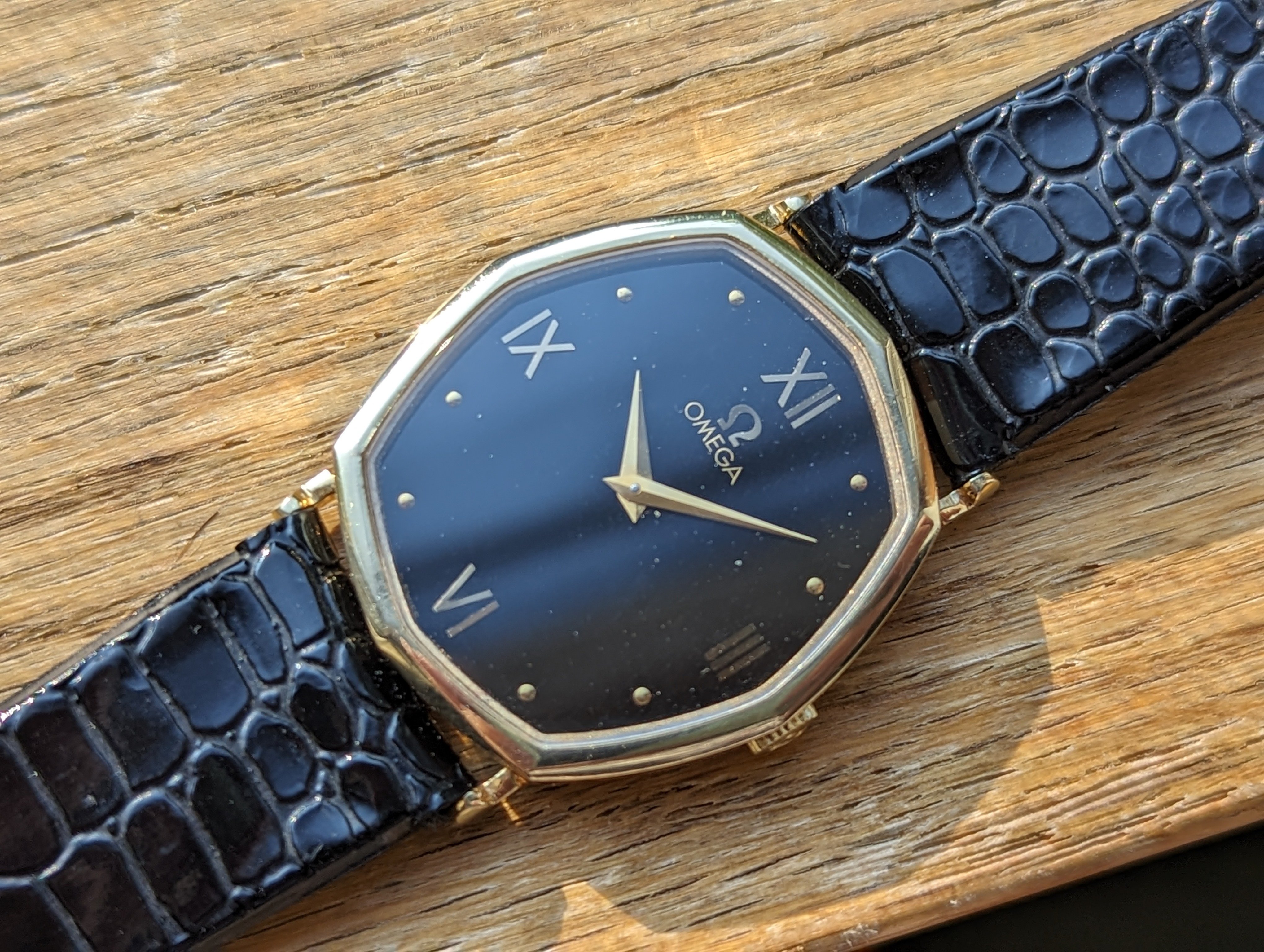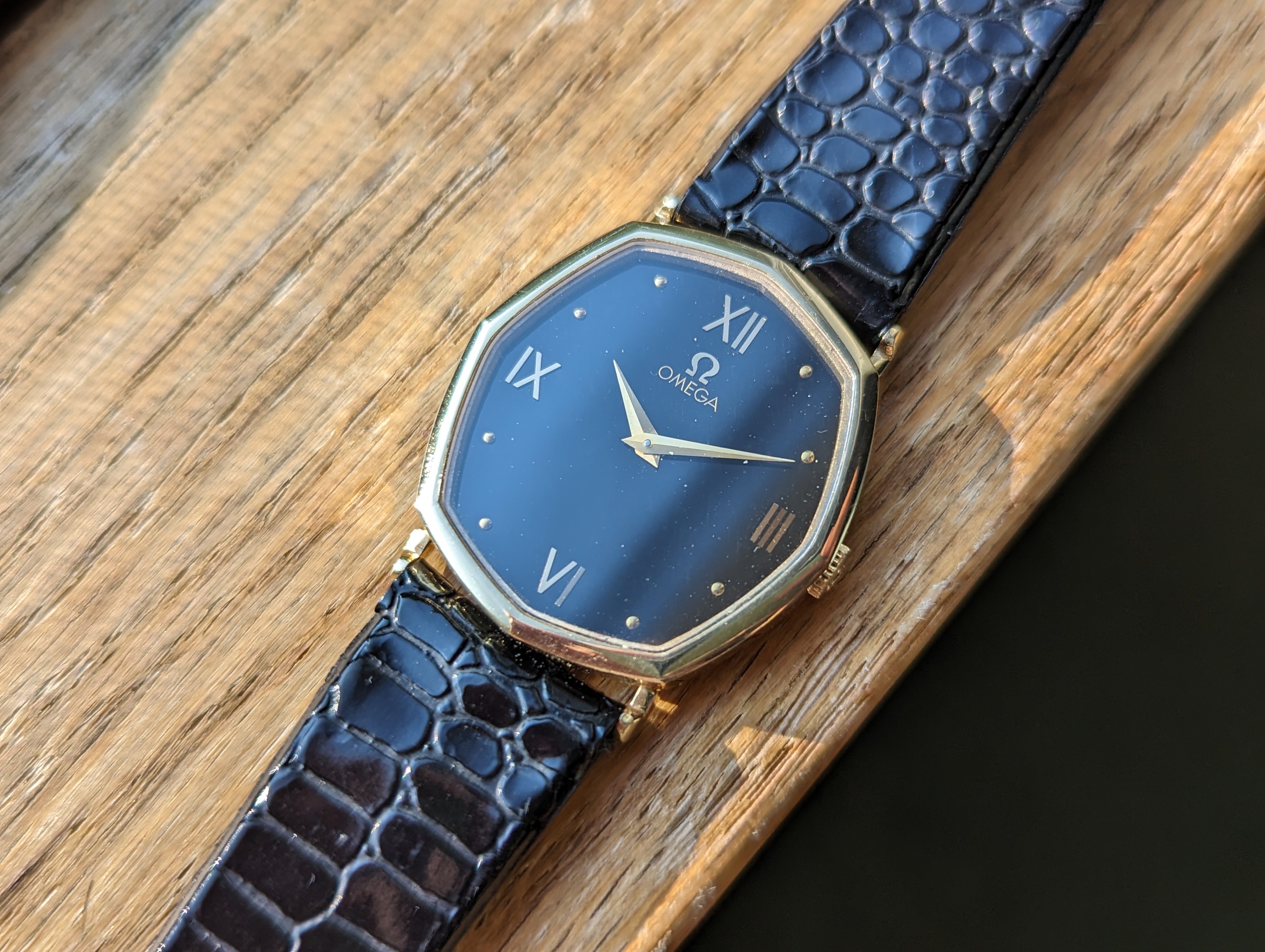 ·Here we have a solid 14k gold Omega from about 1978. This looks like it could be from the DeVille collection, although it's not marked so. The case measures 29.5mm wide by 32mm top to bottom (not considering the lugs). Lug width is 18mm. Movement is a caliber 625 manual wind, running strong and keeping great time. No blemishes on the glossy black dial. Overall, the watch has no major blemishes, excellent condition. It does have a name engraved on the back. I'm not exactly sure if the crystal is mineral or sapphire, but it has no scratches whatsoever. The watch is located in Ohio. I'm asking $525. Let me know if you have any questions.