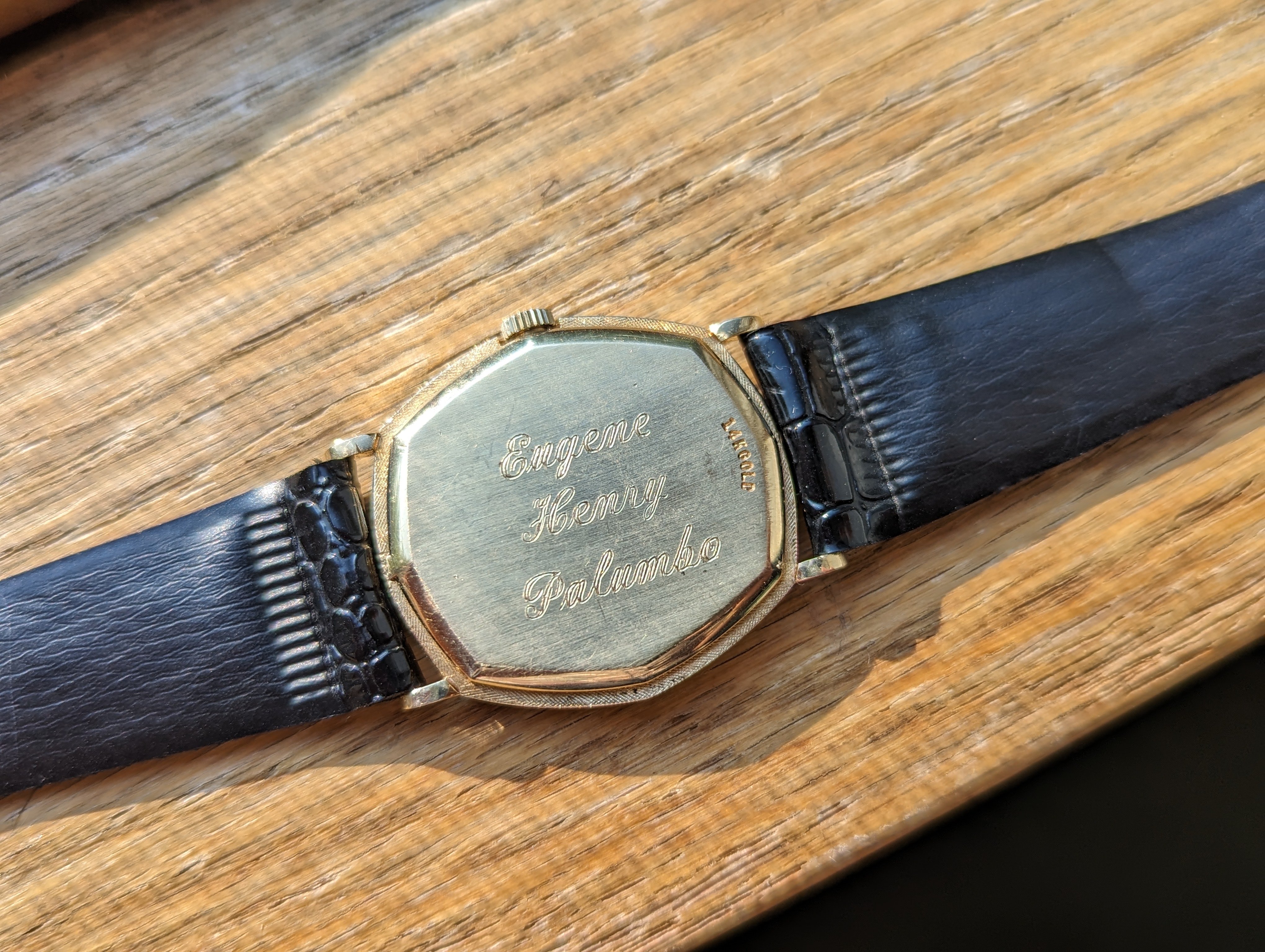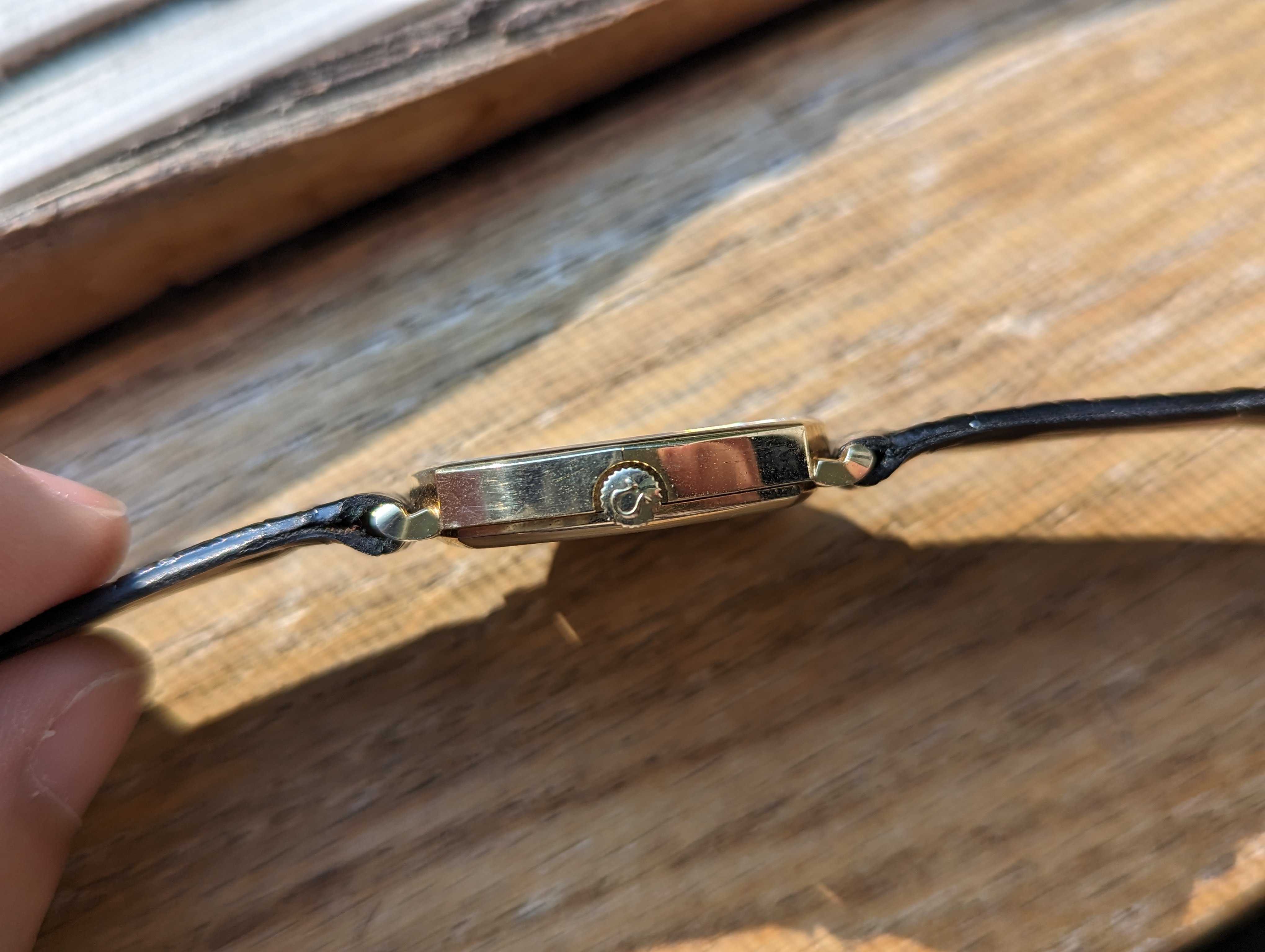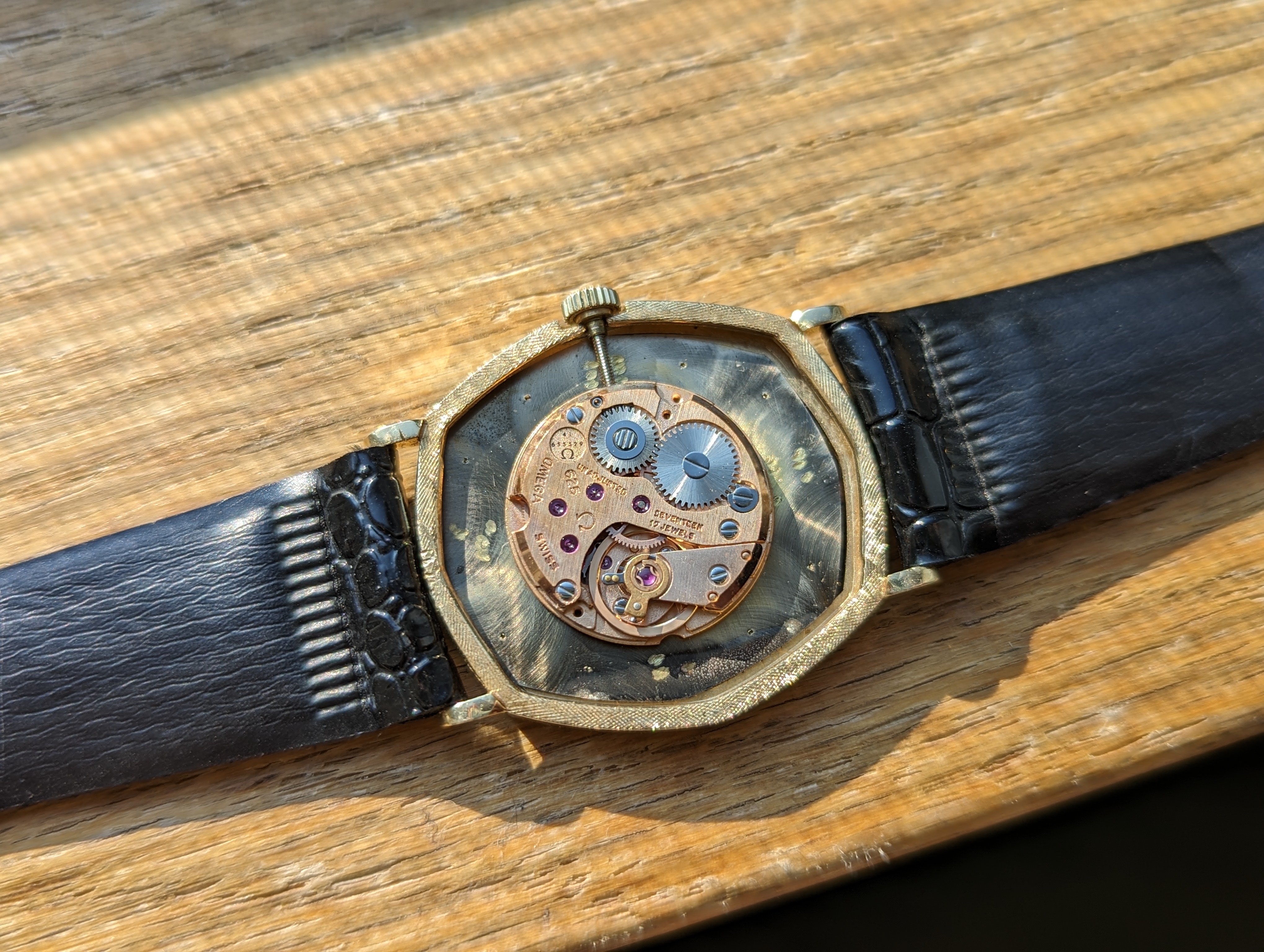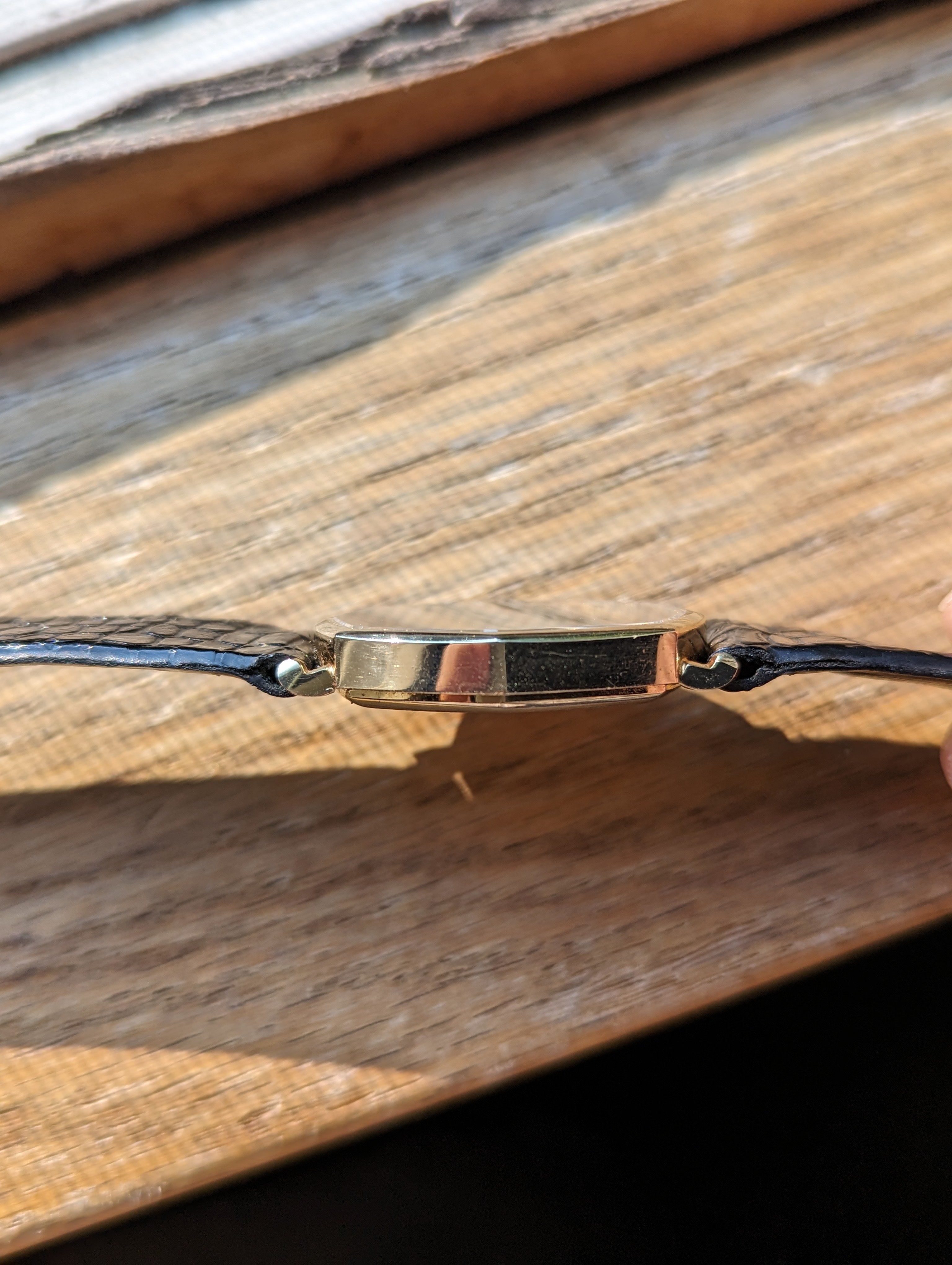 ·Here we have a solid 14k gold Omega from about 1978. This looks like it could be from the DeVille collection, although it's not marked so. The case measures 29.5mm wide by 32mm top to bottom (not considering the lugs). Lug width is 18mm. Movement is a caliber 625 manual wind, running strong and keeping great time. No blemishes on the glossy black dial. Overall, the watch has no major blemishes, excellent condition. It does have a name engraved on the back. I'm not exactly sure if the crystal is mineral or sapphire, but it has no scratches whatsoever. The watch is located in Ohio. I'm asking $525. Let me know if you have any questions.