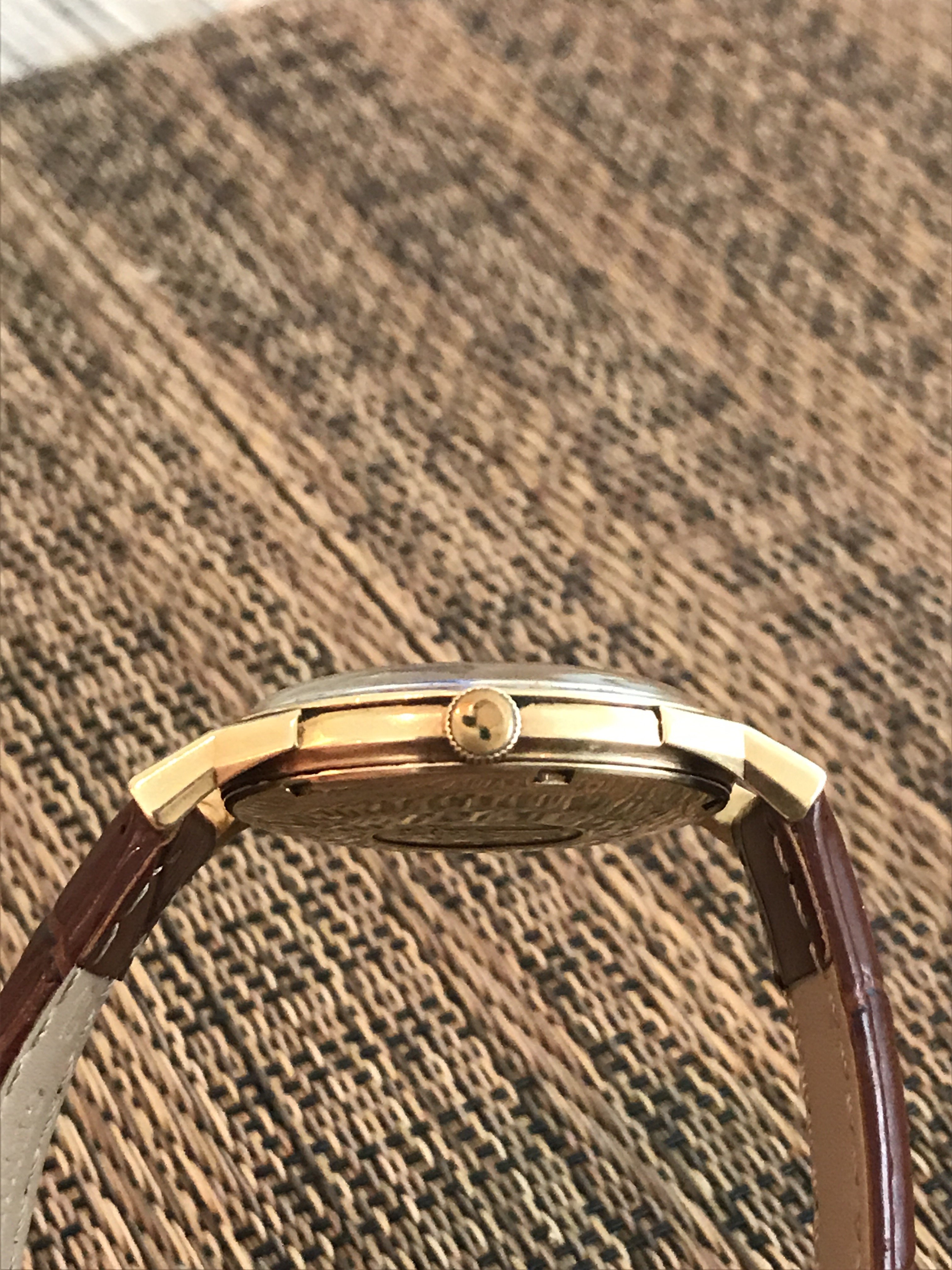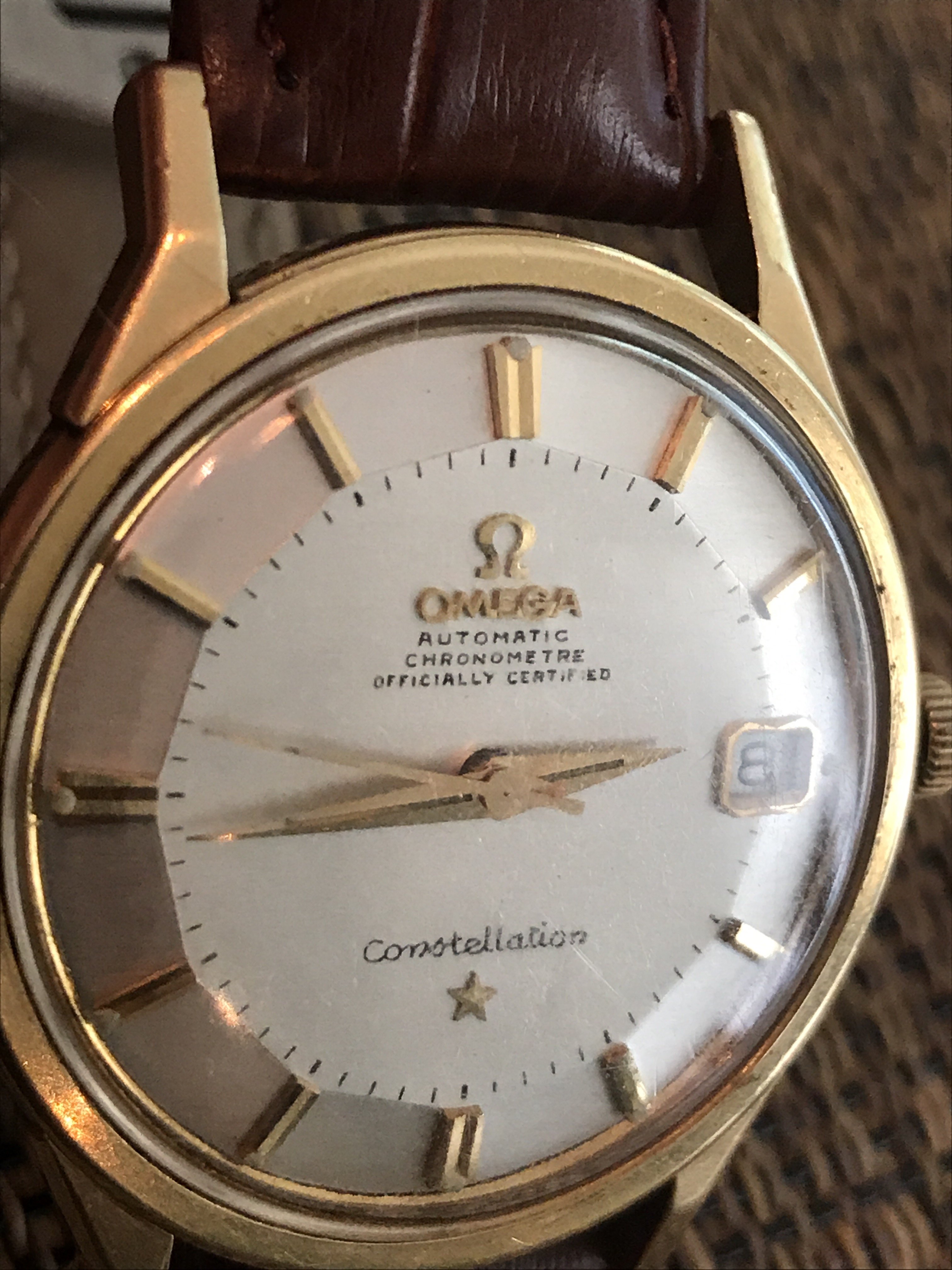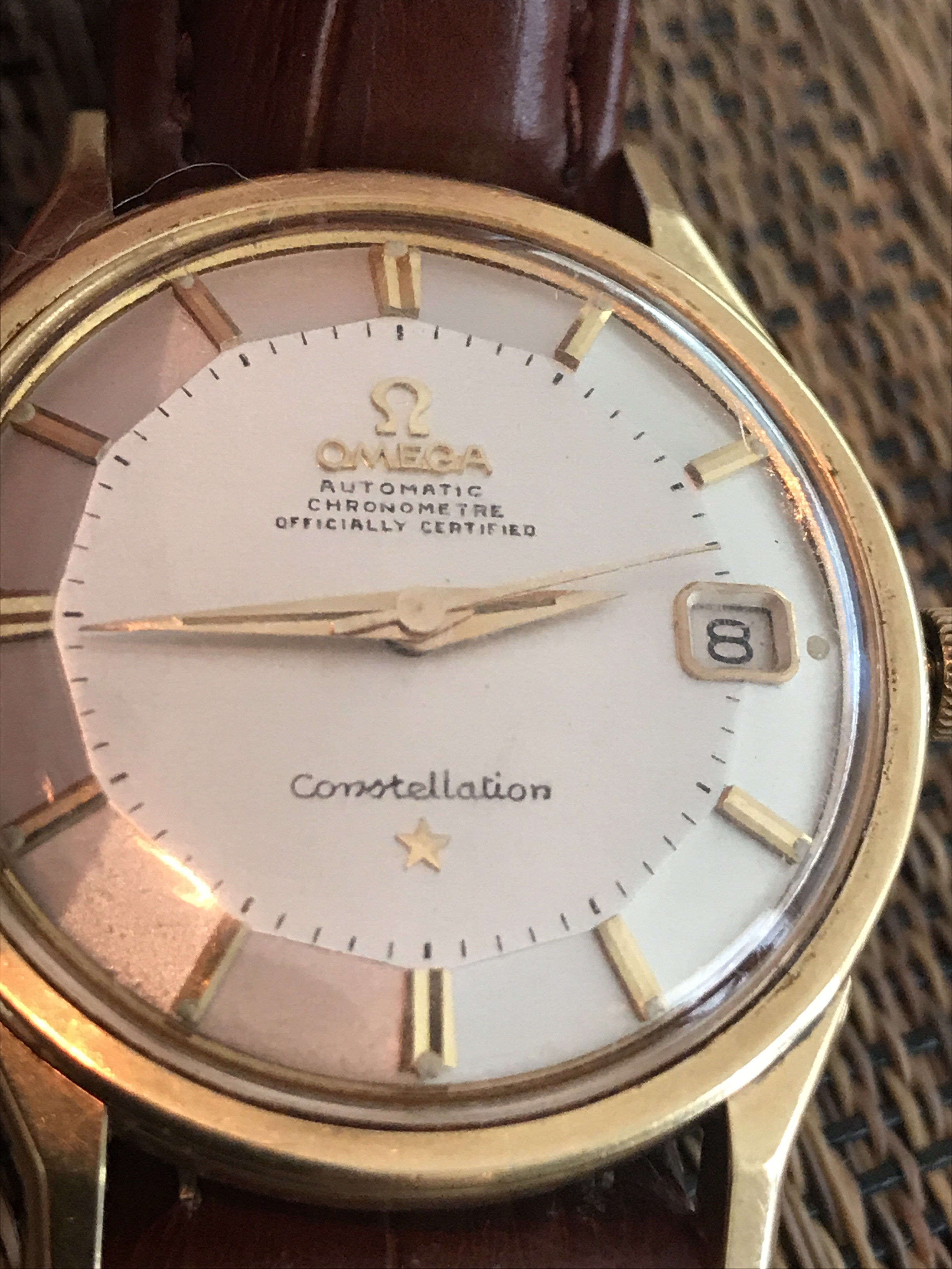 I picked up this 1966 14 karat gold Connie from a local seller in the Los Angeles area. It is a nice watch overall, but certainly needs to be cleaned. My main question is about the dial. It seems to me that it was either repainted, or someone decided to try to trace the original script, and did not do a great job. Am I correct in my assessment regarding the dial? I have two other watches, one of which is gold capped and has a white with gold markers dial with original script, but it is not a pie pan. All three watches that I own have 564 cal movement. Therefore, my other question is whether the white with gold markers dial will fit the 14k gold watch, or if I'm better off waiting and looking for a pie pan dial? I will add some pictures and hope my questions make sense.