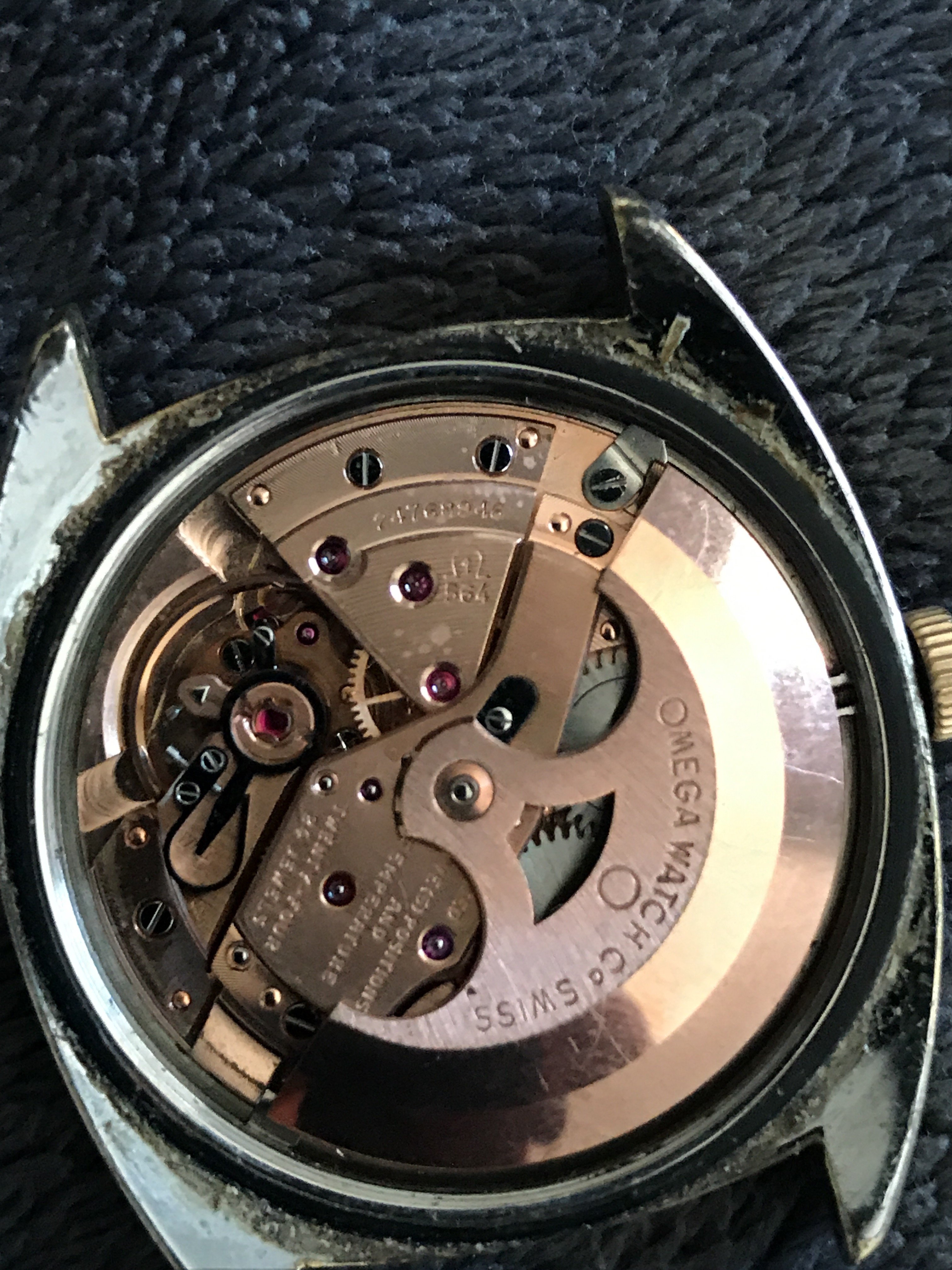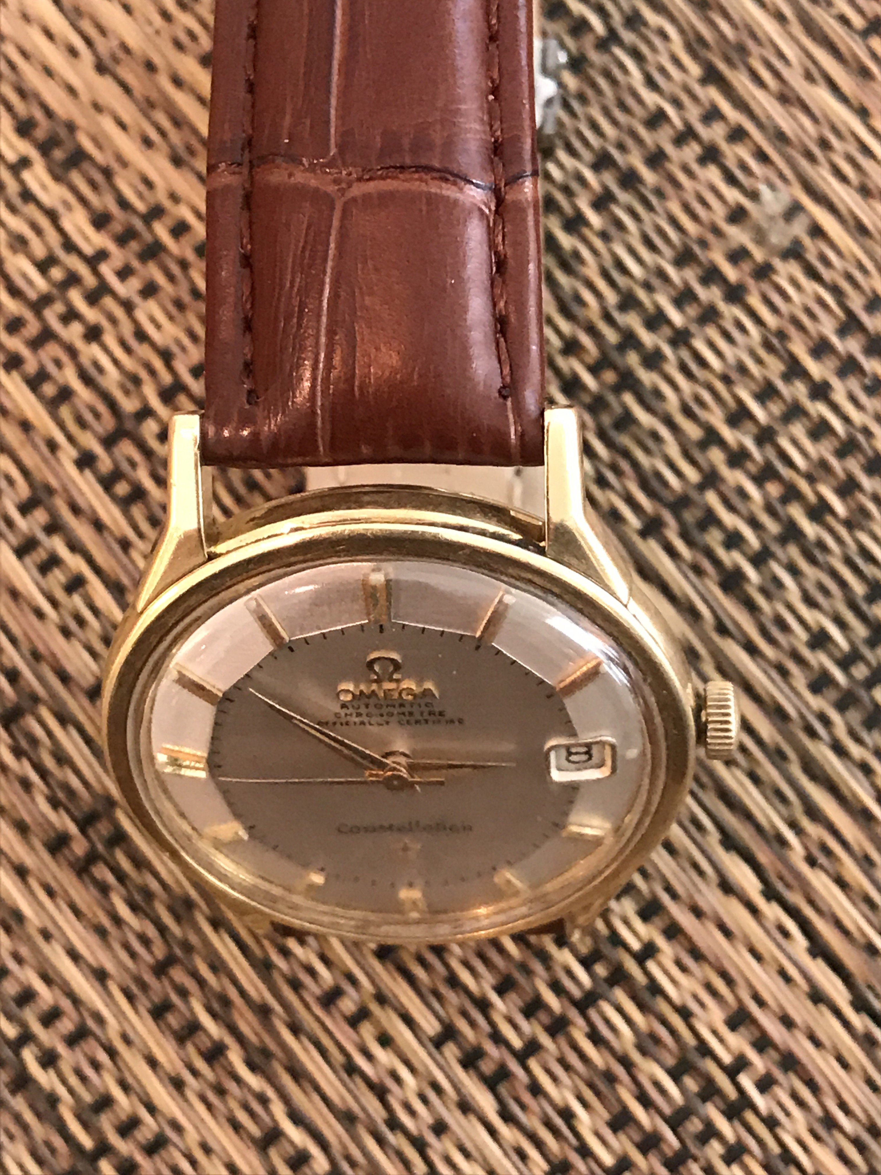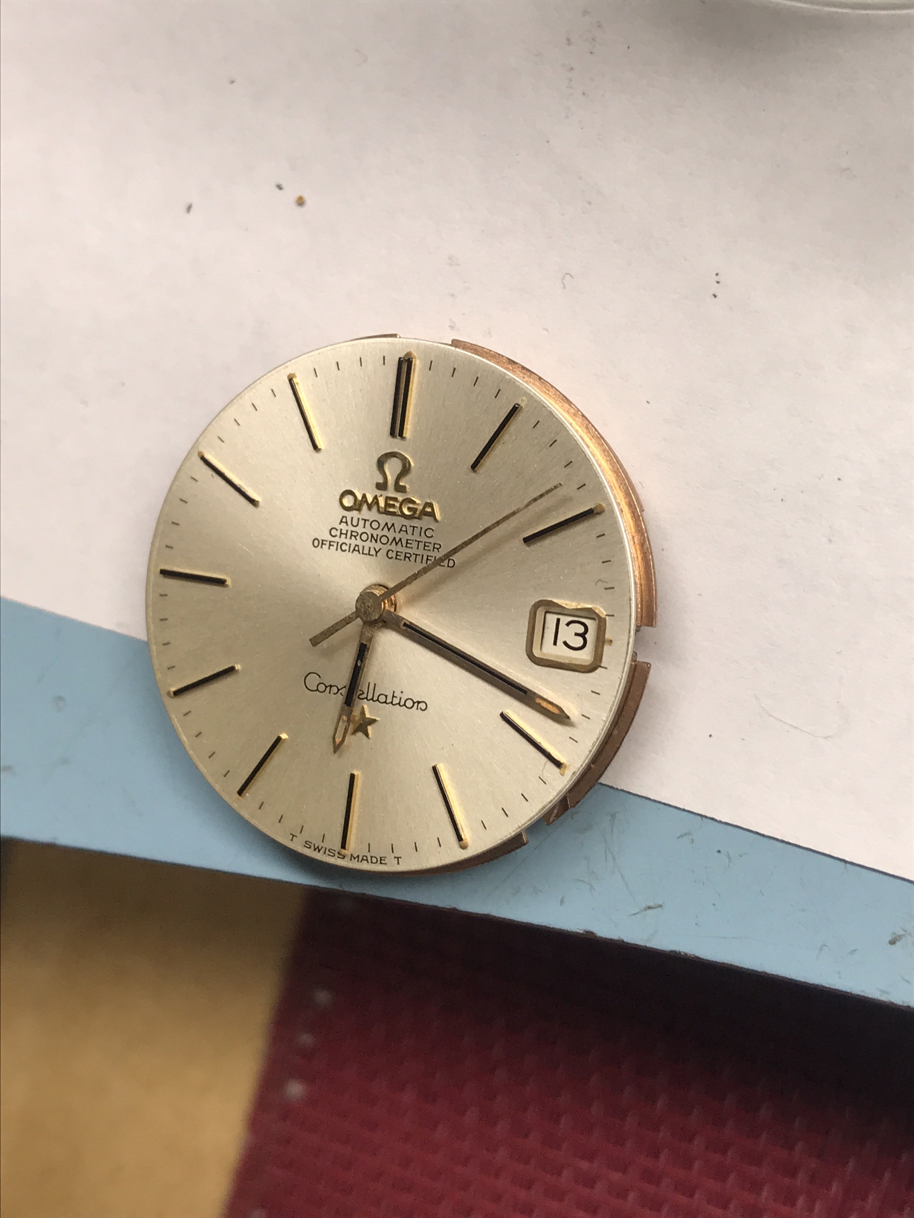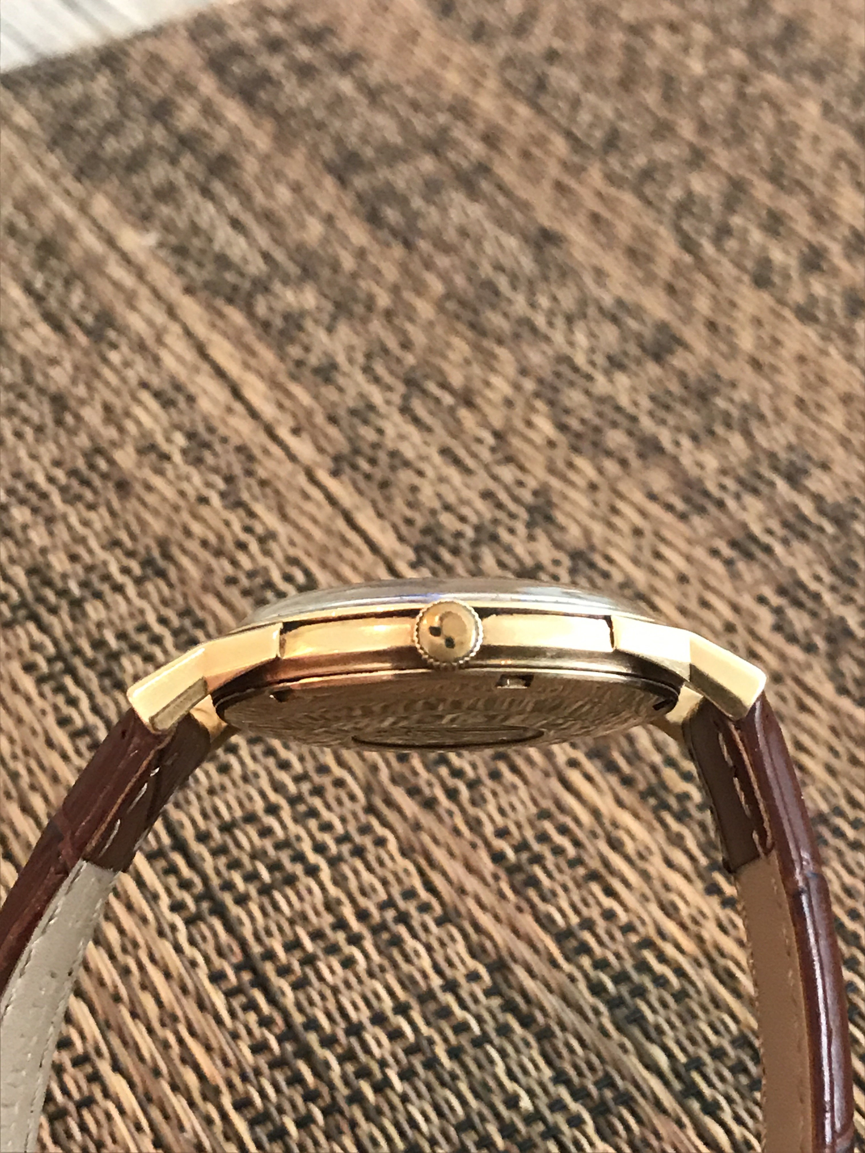 I picked up this 1966 14 karat gold Connie from a local seller in the Los Angeles area. It is a nice watch overall, but certainly needs to be cleaned. My main question is about the dial. It seems to me that it was either repainted, or someone decided to try to trace the original script, and did not do a great job. Am I correct in my assessment regarding the dial? I have two other watches, one of which is gold capped and has a white with gold markers dial with original script, but it is not a pie pan. All three watches that I own have 564 cal movement. Therefore, my other question is whether the white with gold markers dial will fit the 14k gold watch, or if I'm better off waiting and looking for a pie pan dial? I will add some pictures and hope my questions make sense.