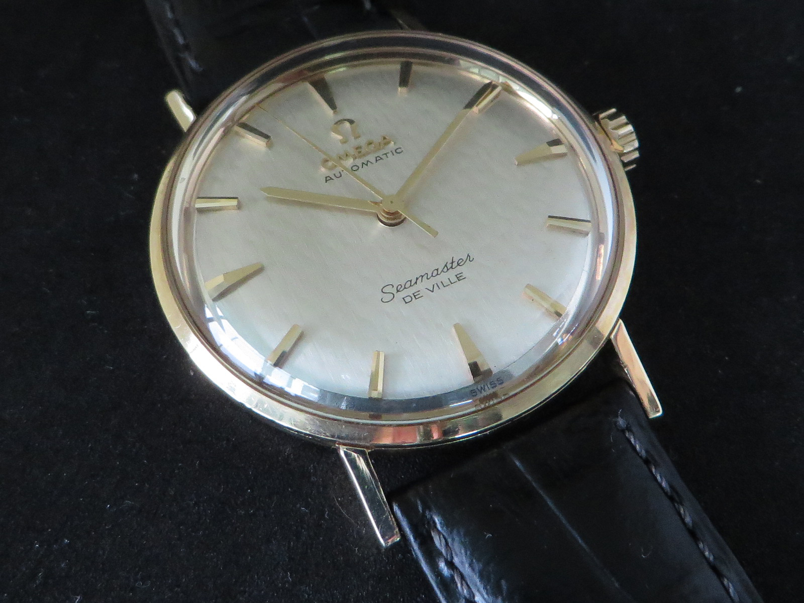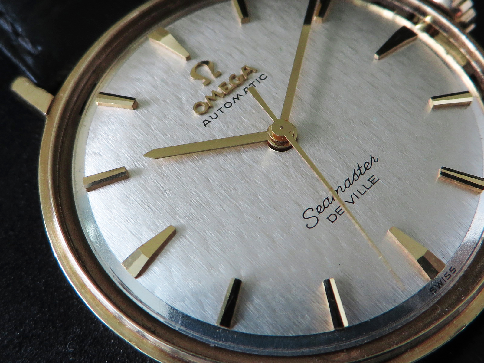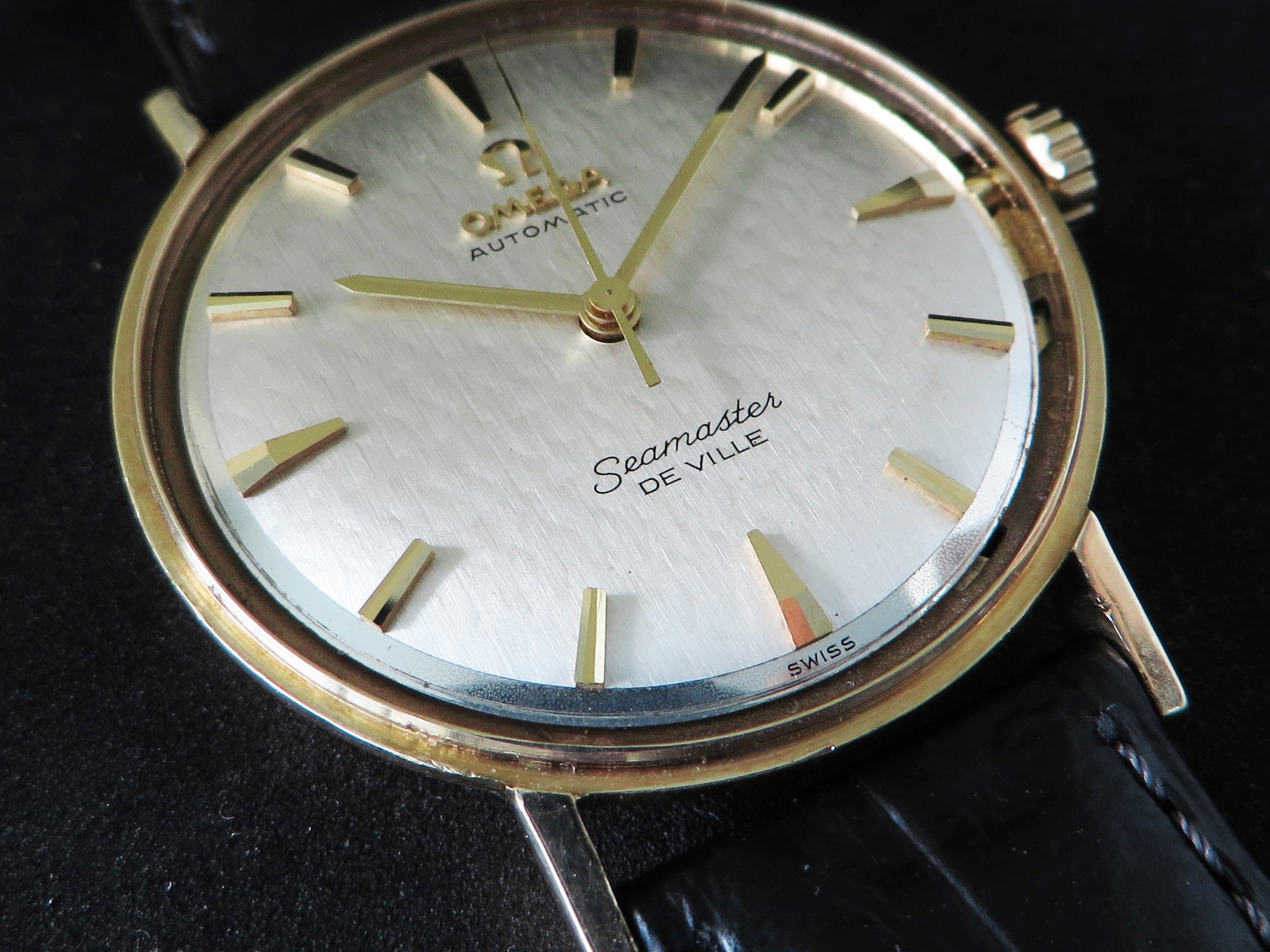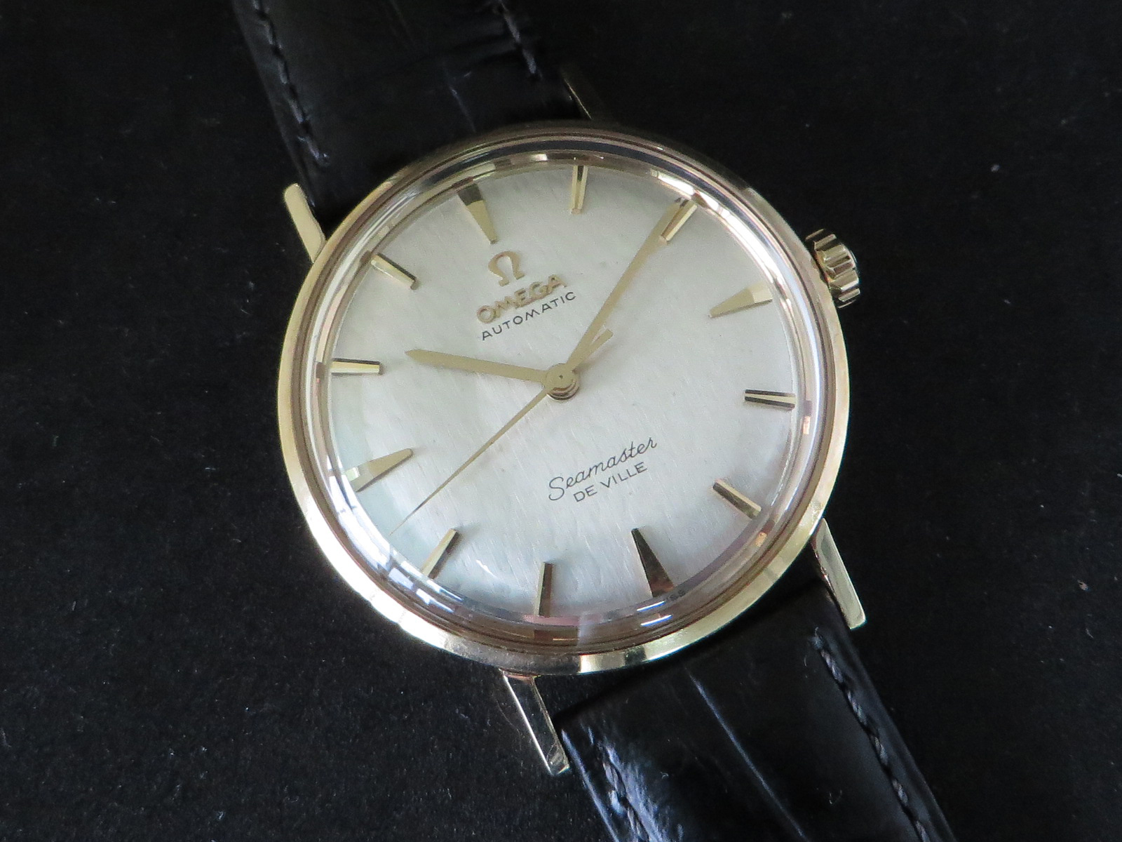 ··Vintage Omega AficionadoOriginal lightly textured shimmering silver dial with mirror finish outer band, applied faceted gold figures and Omega symbol and script. This is the only one like it I can recall seeing in over twenty years of collecting Omega watches. Something dreamed up by Norman Morris no doubt.