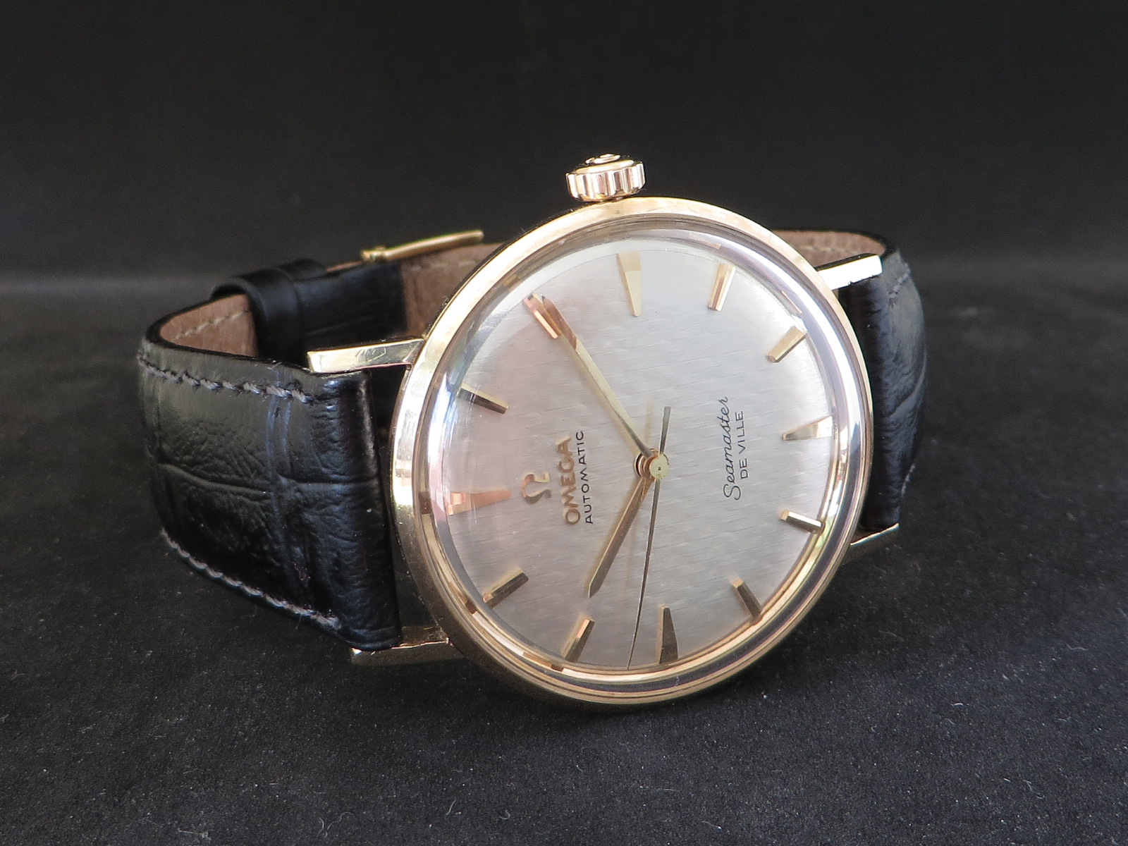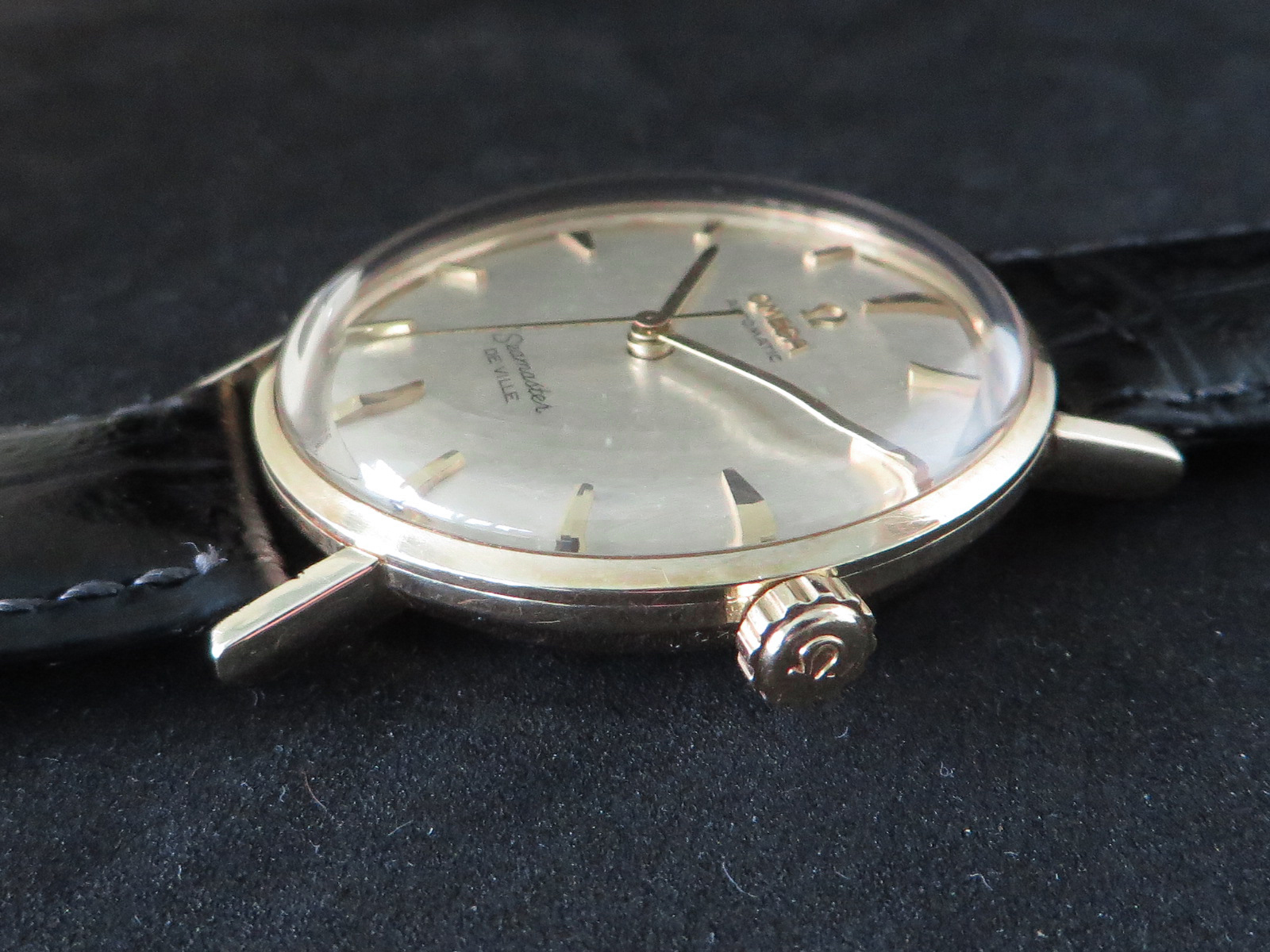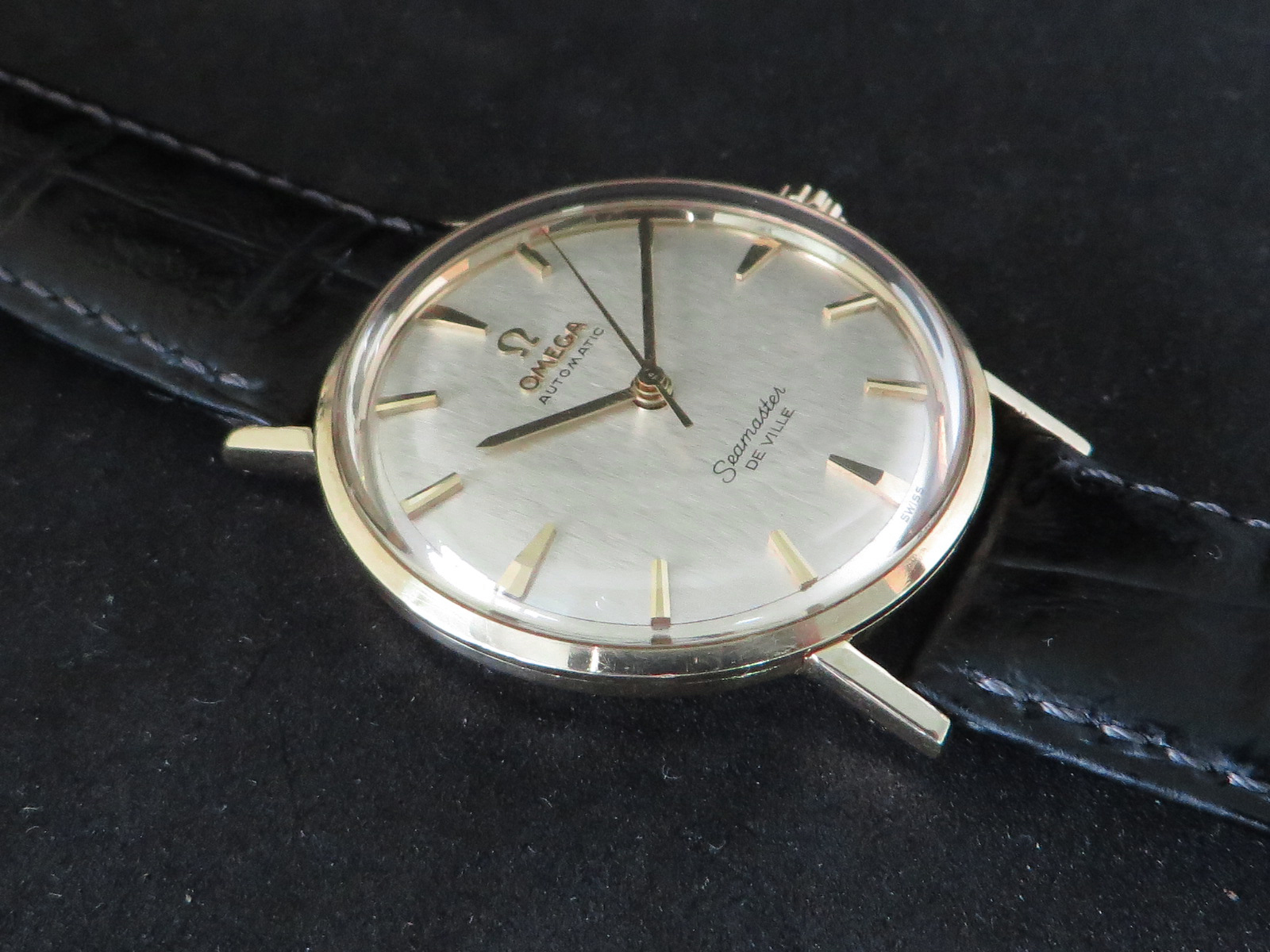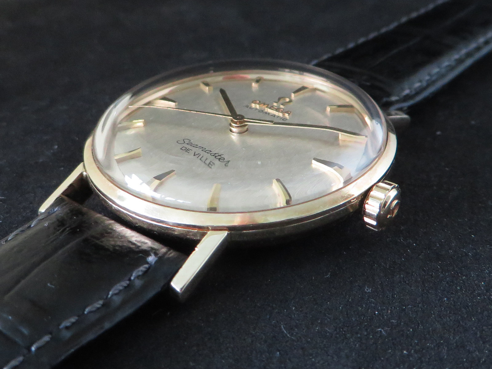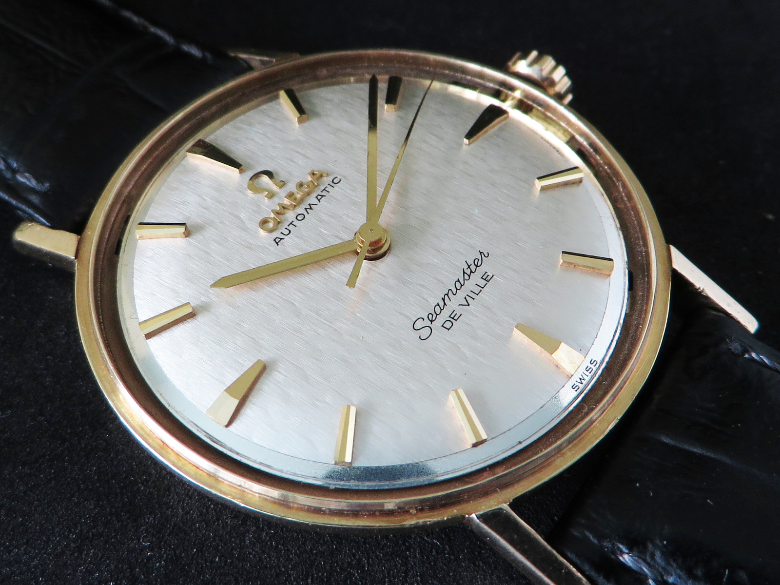 ··Vintage Omega AficionadoOriginal lightly textured shimmering silver dial with mirror finish outer band, applied faceted gold figures and Omega symbol and script. This is the only one like it I can recall seeing in over twenty years of collecting Omega watches. Something dreamed up by Norman Morris no doubt.
