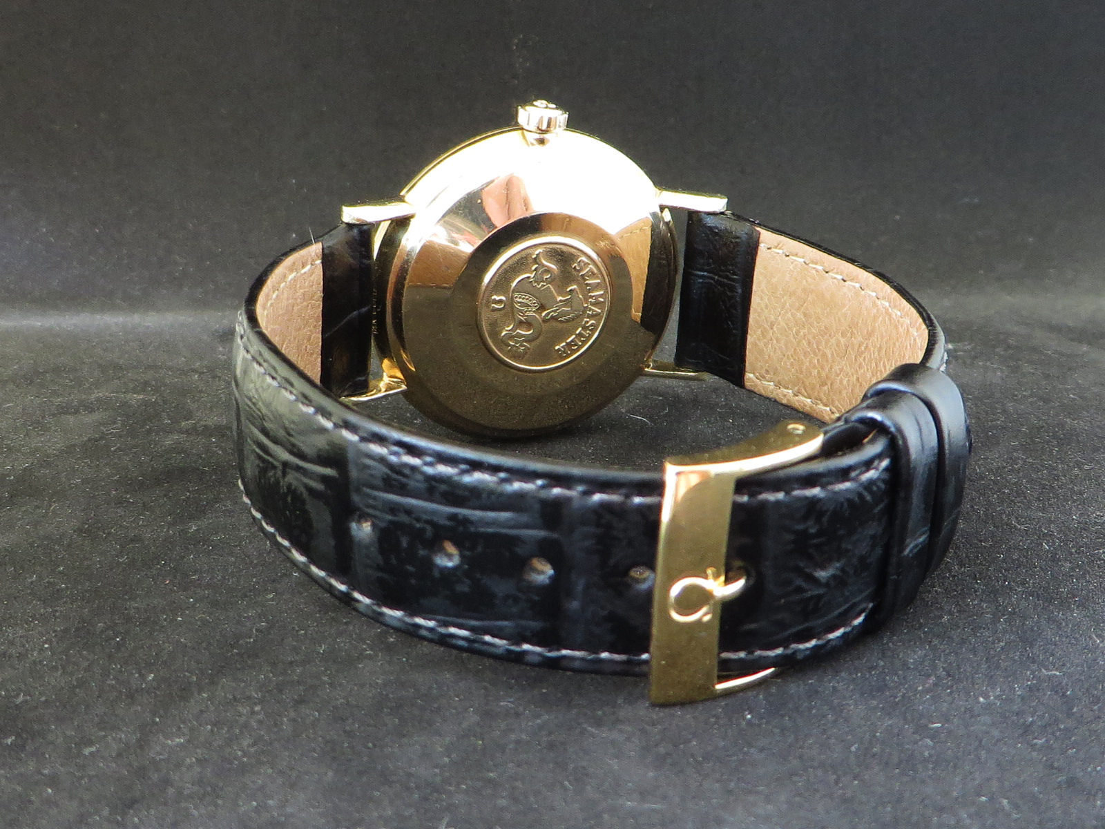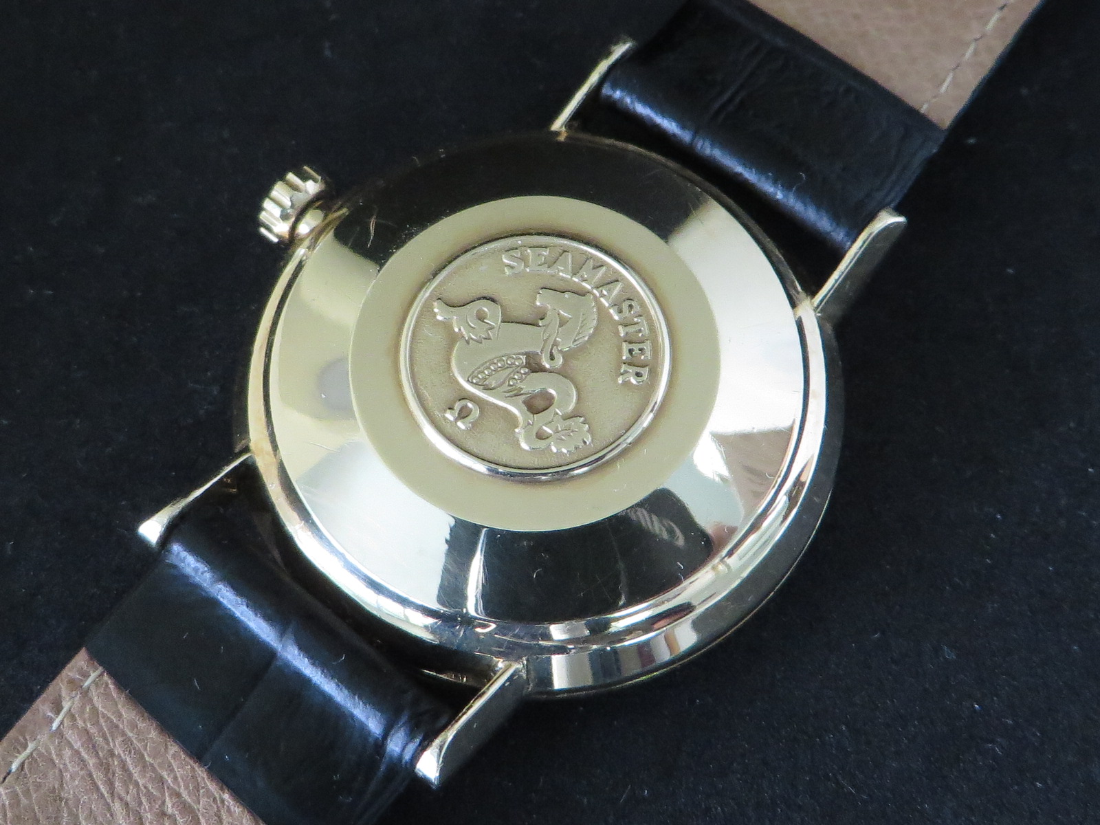 14 karat solid gold front load "Unishell" Seamaster KL6590 with crisp Hippocampus back, signed crystal and crown. Fitted with a new Hirsch "Duke" strap and modern Omega gold-plated buckle.