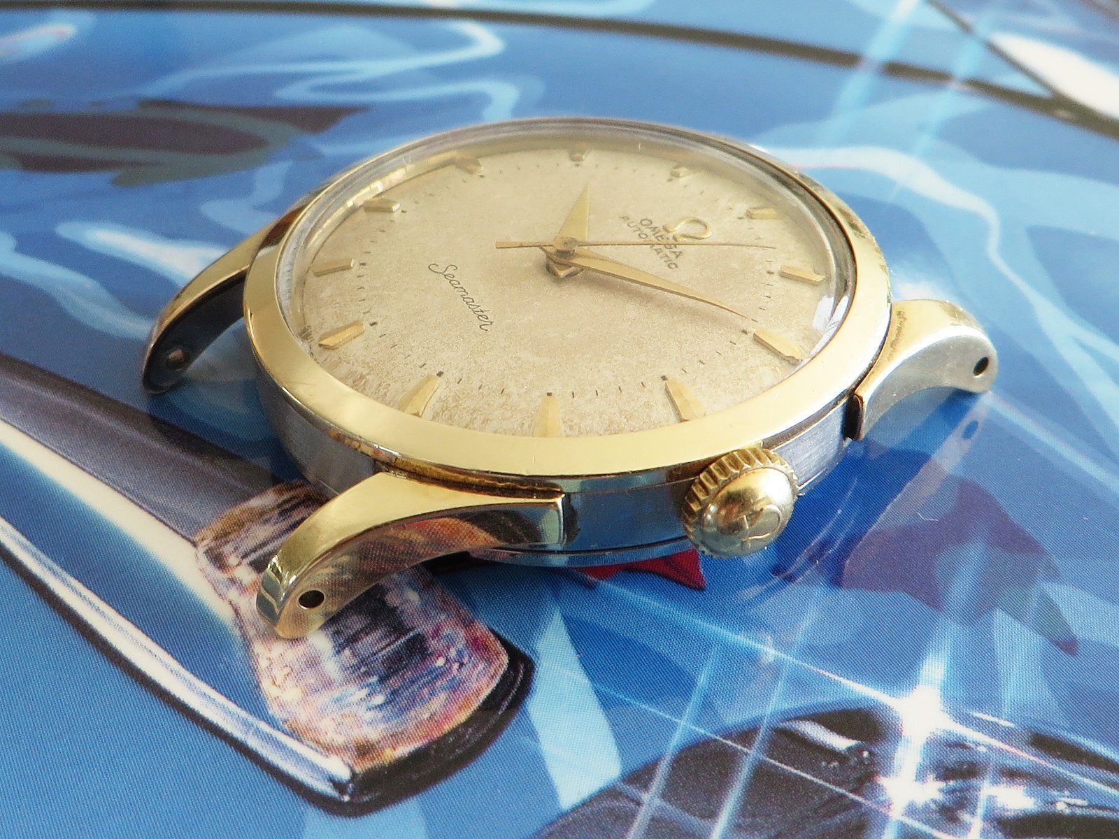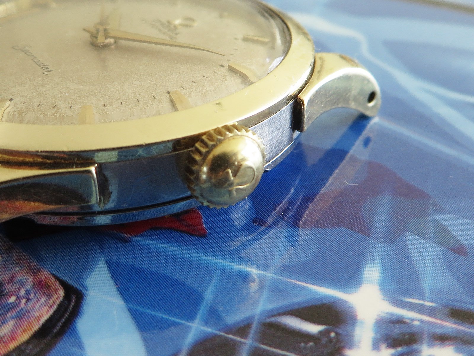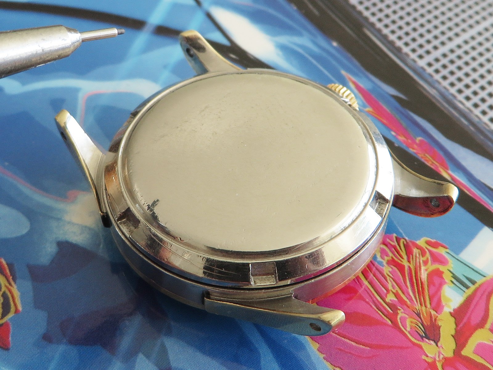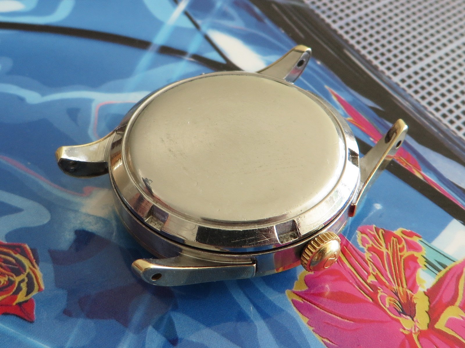 14K gold bezel and stainless steel body screw back case with distinctive tapered 14K gold capped lugs, in beautiful condition for a seventy-two year old watch. Nice original signed low dome crystal with a NOS vintage gold crown.