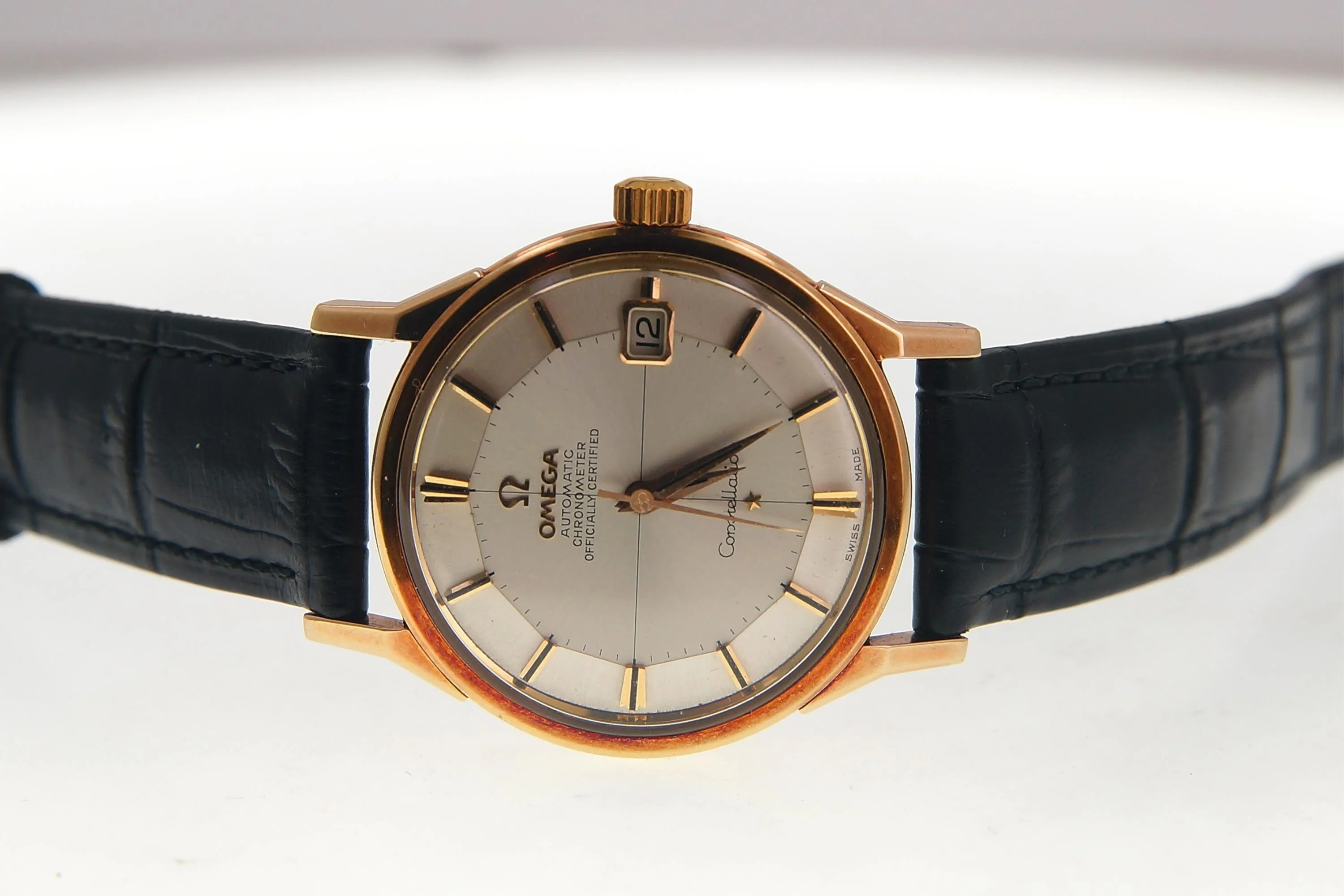 ·Hi, this just came up for sale at a local auction. Not much information beyond the below photos and: "Automatic Omega Chronometer 'officially certified' Swiss Made, Pie Pan dial with gold markers, date, gold hands watch with like new Omega branded leather band and clasp and original box."