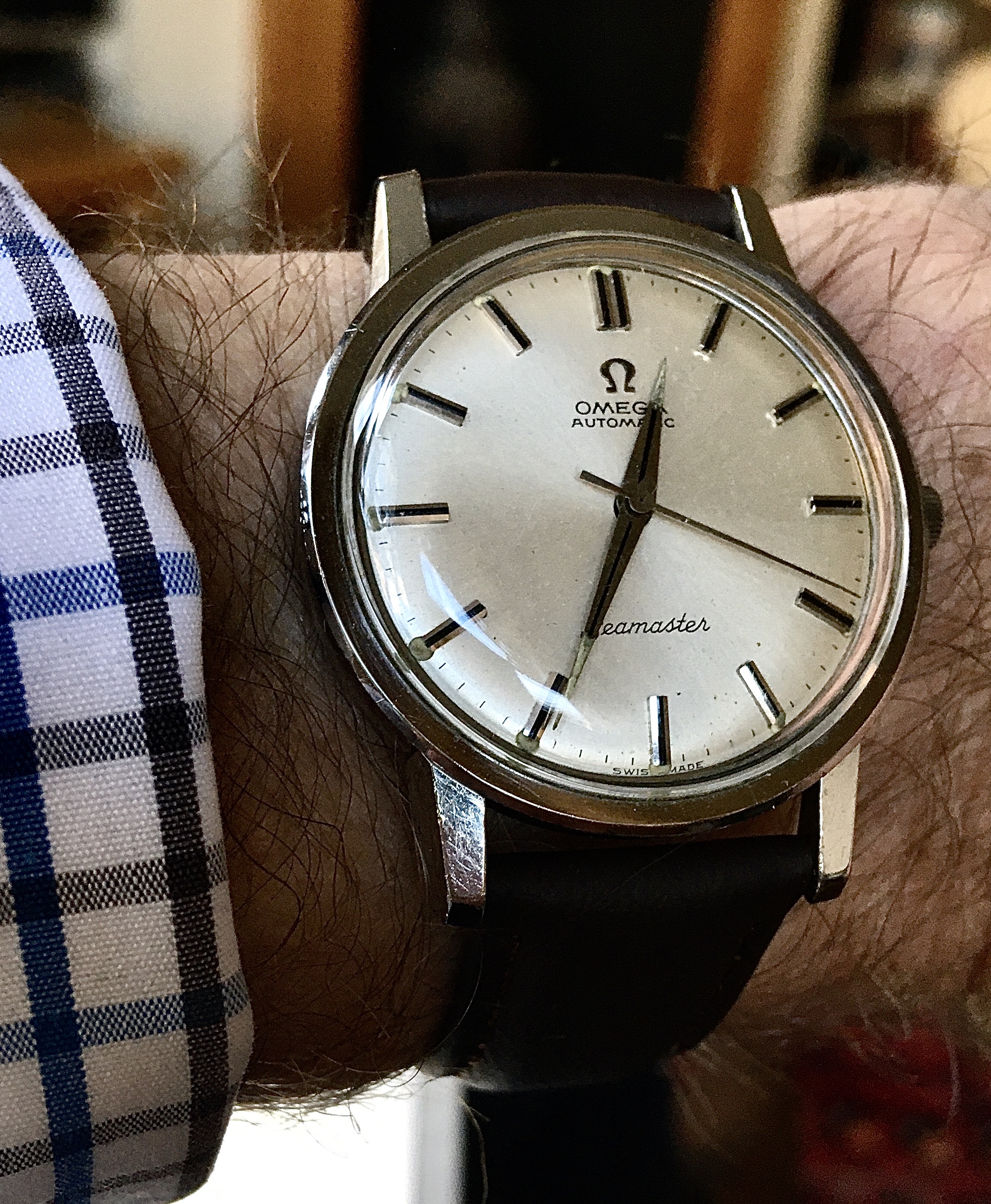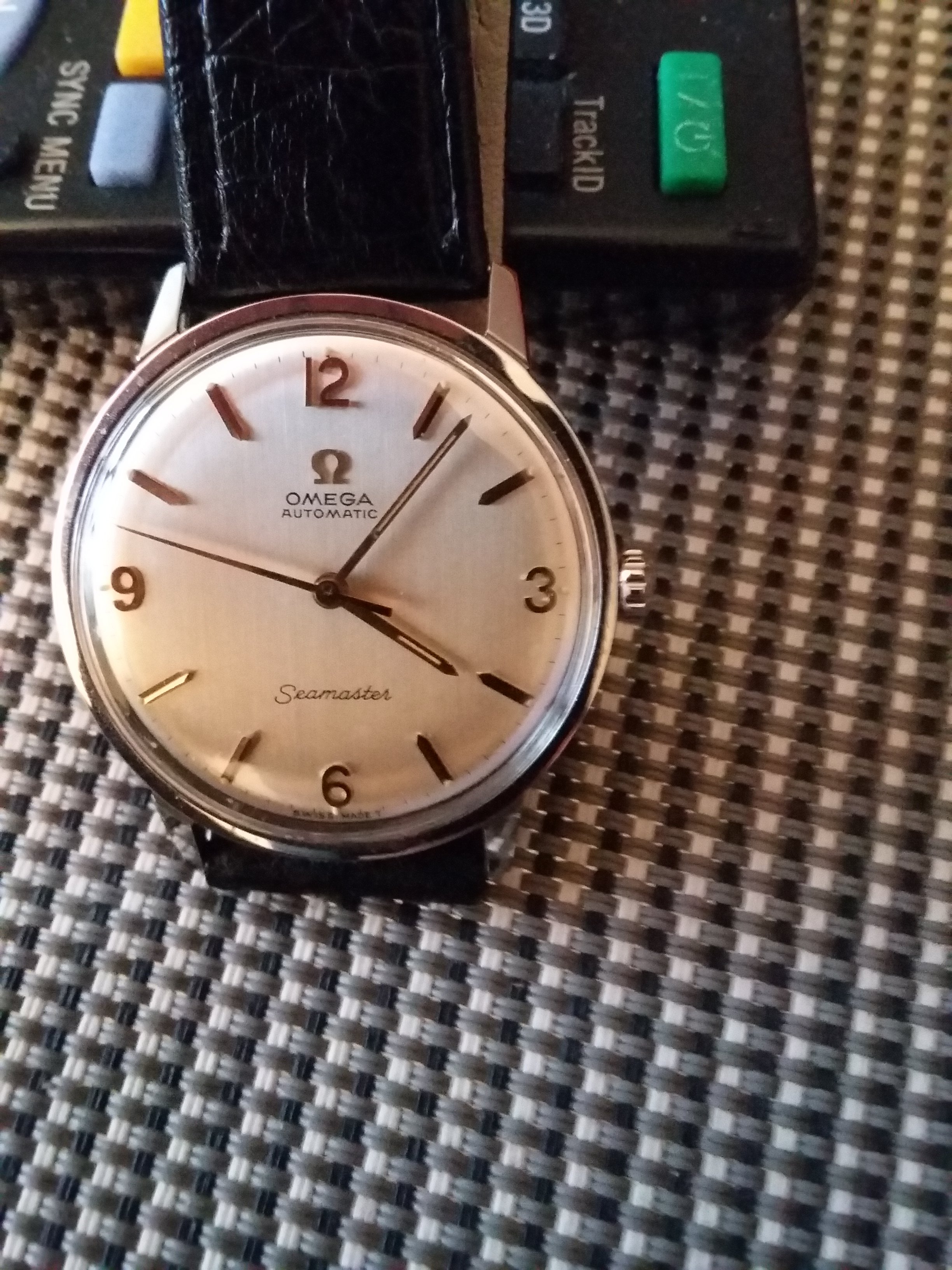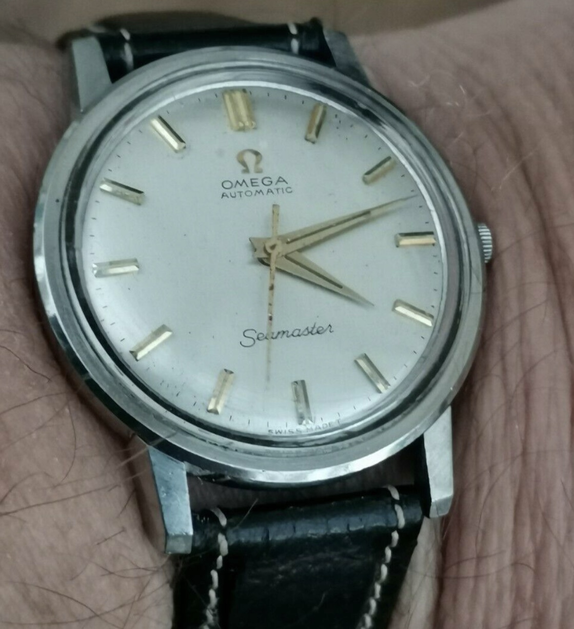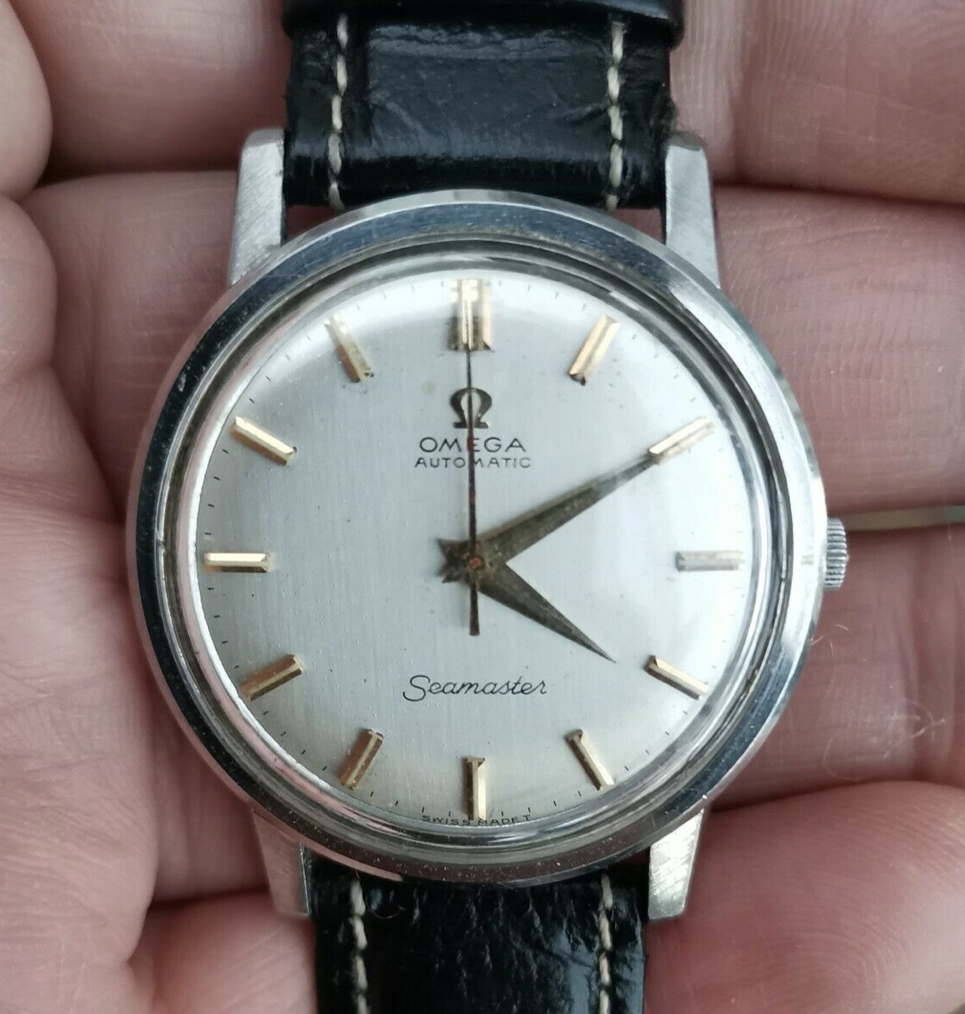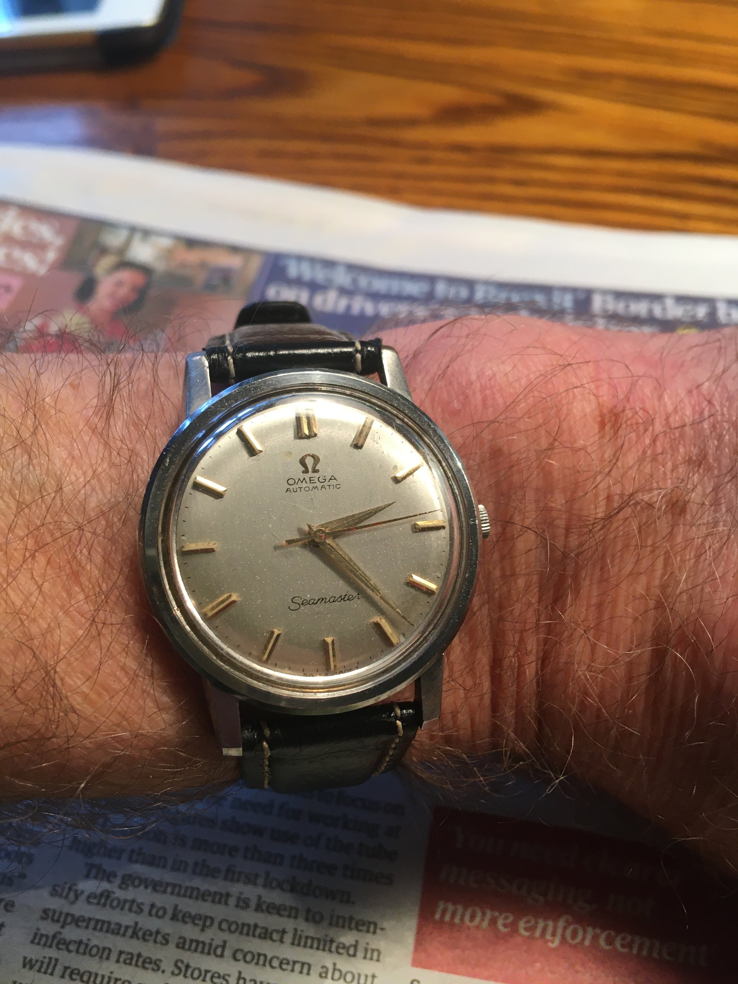 This dial isn't quite the same as my 165.003 below, which dates from 1965. Not the most close-up photo but the only one I have showing all the text and I think you can see enough. On mine, "OMEGA AUTOMATIC" is seriffed and the centre of the Ms dips all the way down. "Seamaster" is close but not quite there either: the first "a" in particular isn't quite the same, the crossbar of the "t" is shorter here, the second "s" and the "r" don't rise as high and the tail on the "r" is shorter. "Swiss Made" looks clumsy, and finally I am not seeing the sunburst finish I would expect. I know that dials were contracted out and there might be some slight variation, but too much looks wrong here. I say redial.