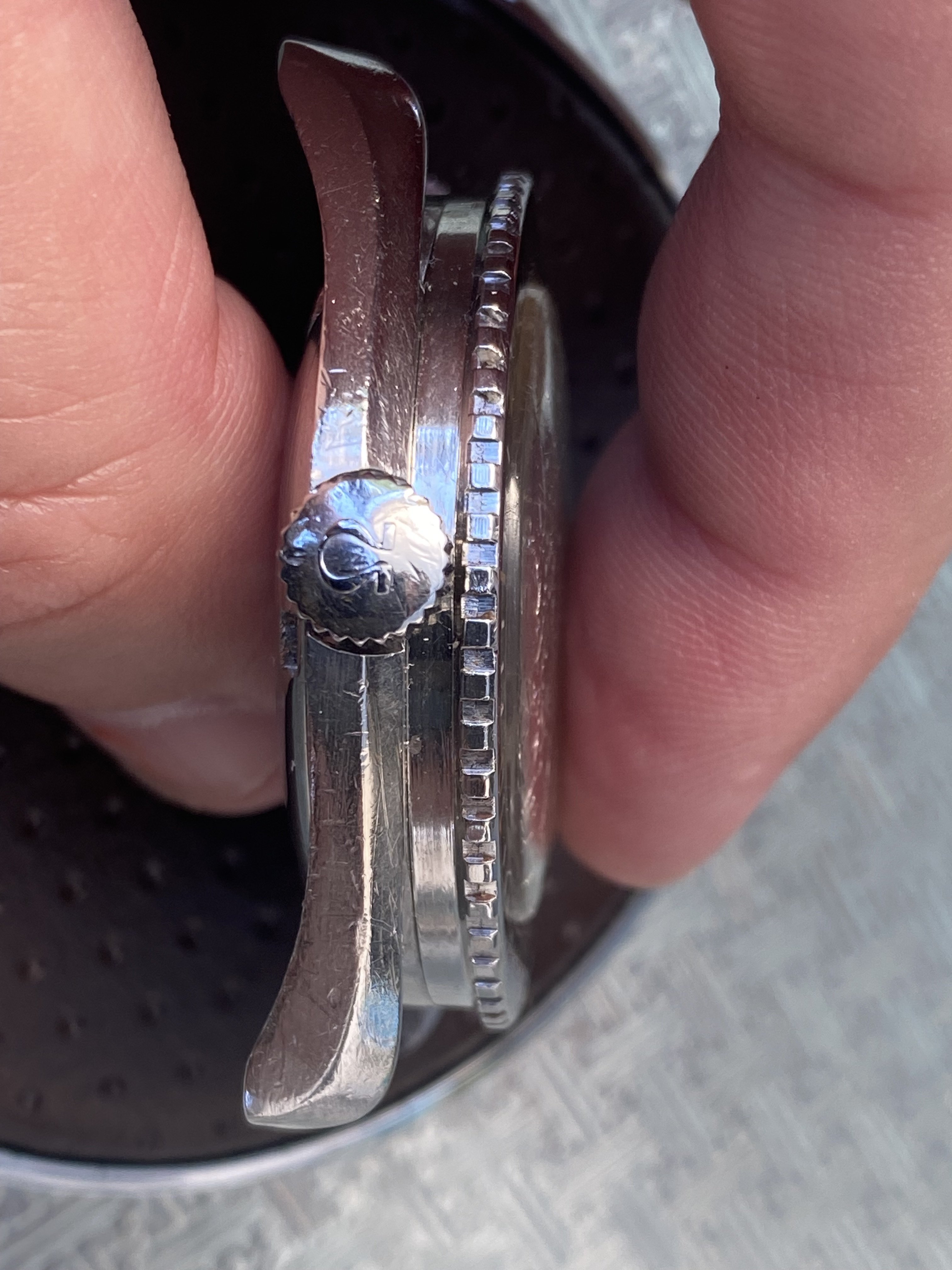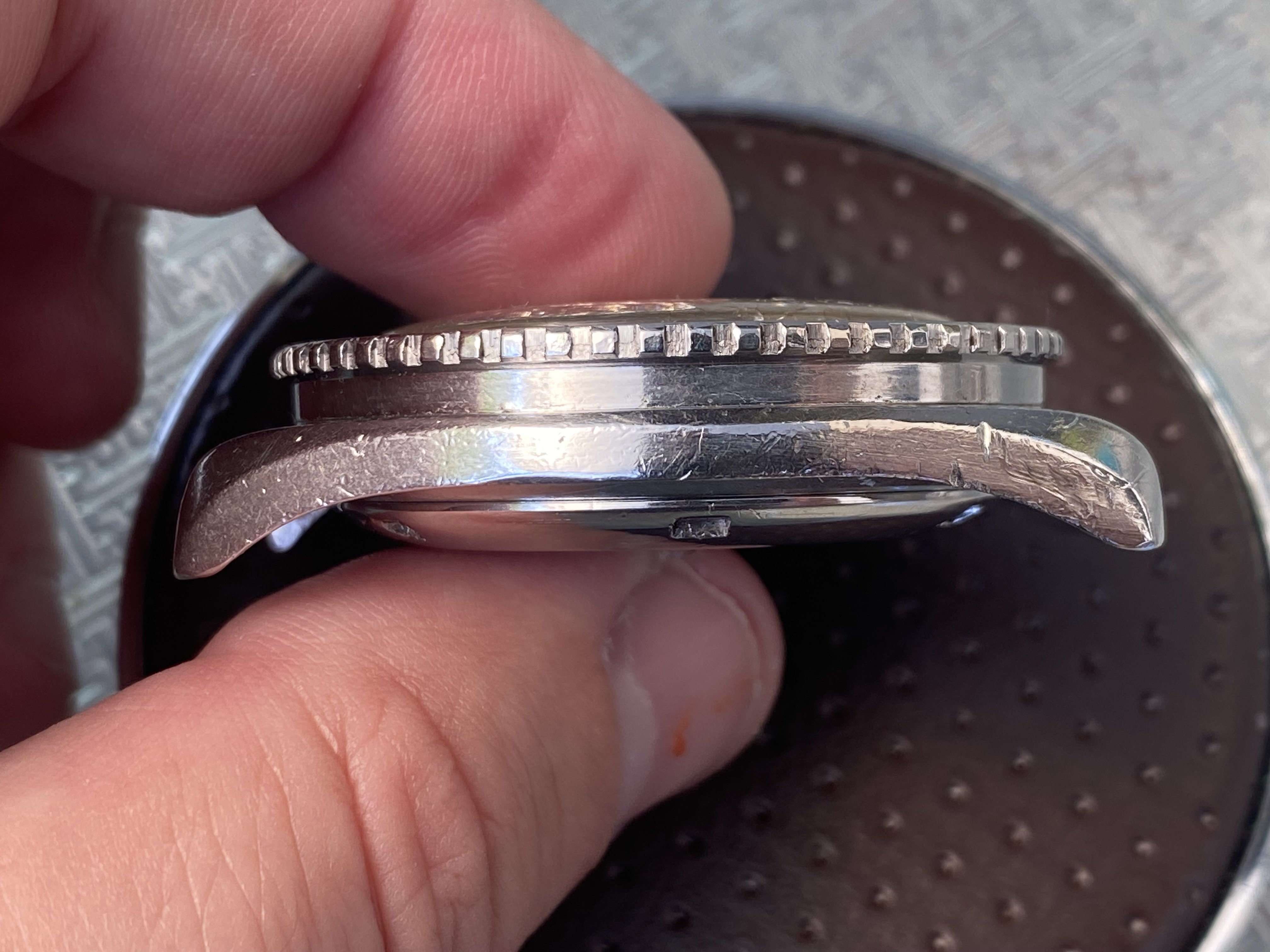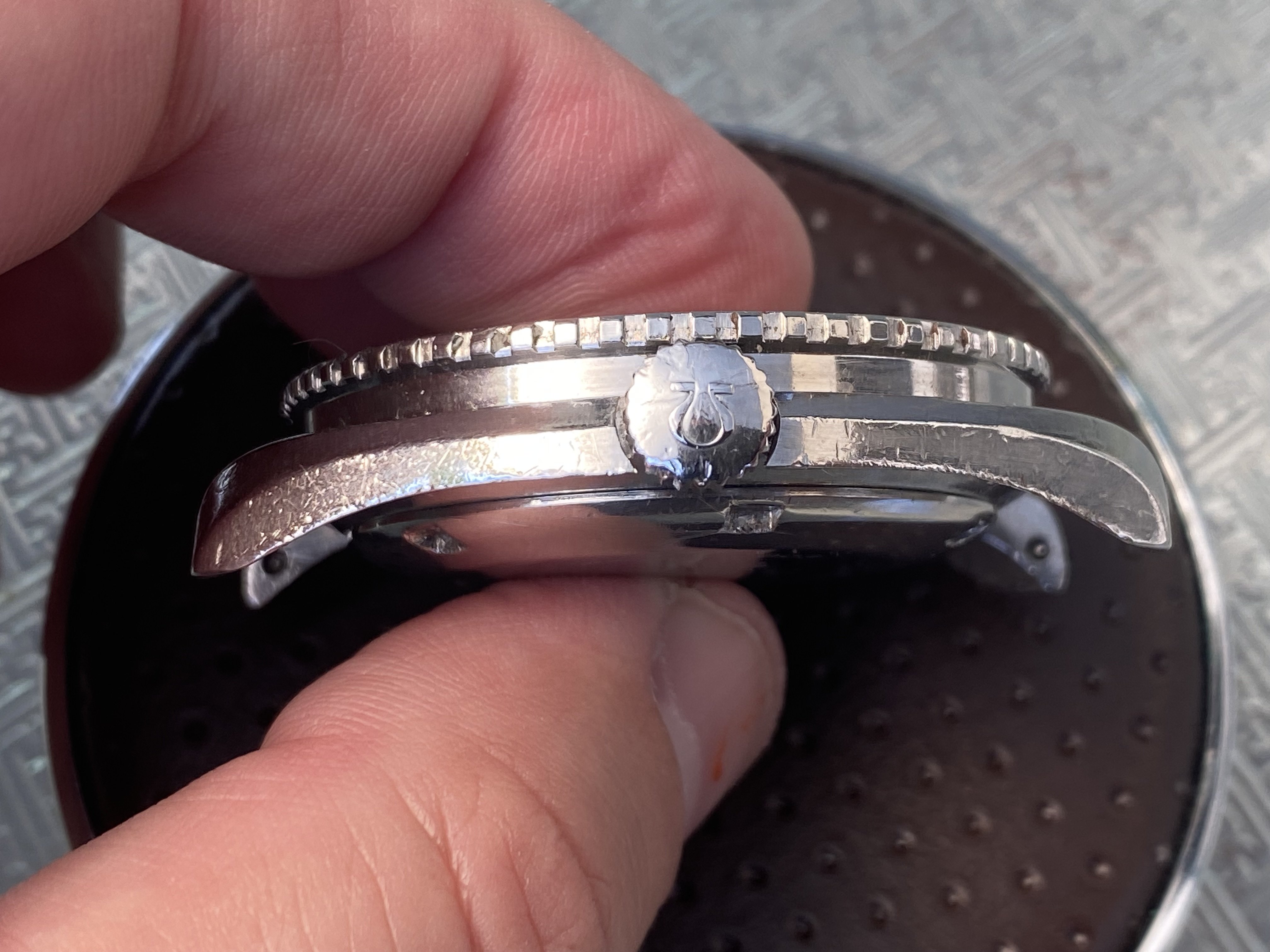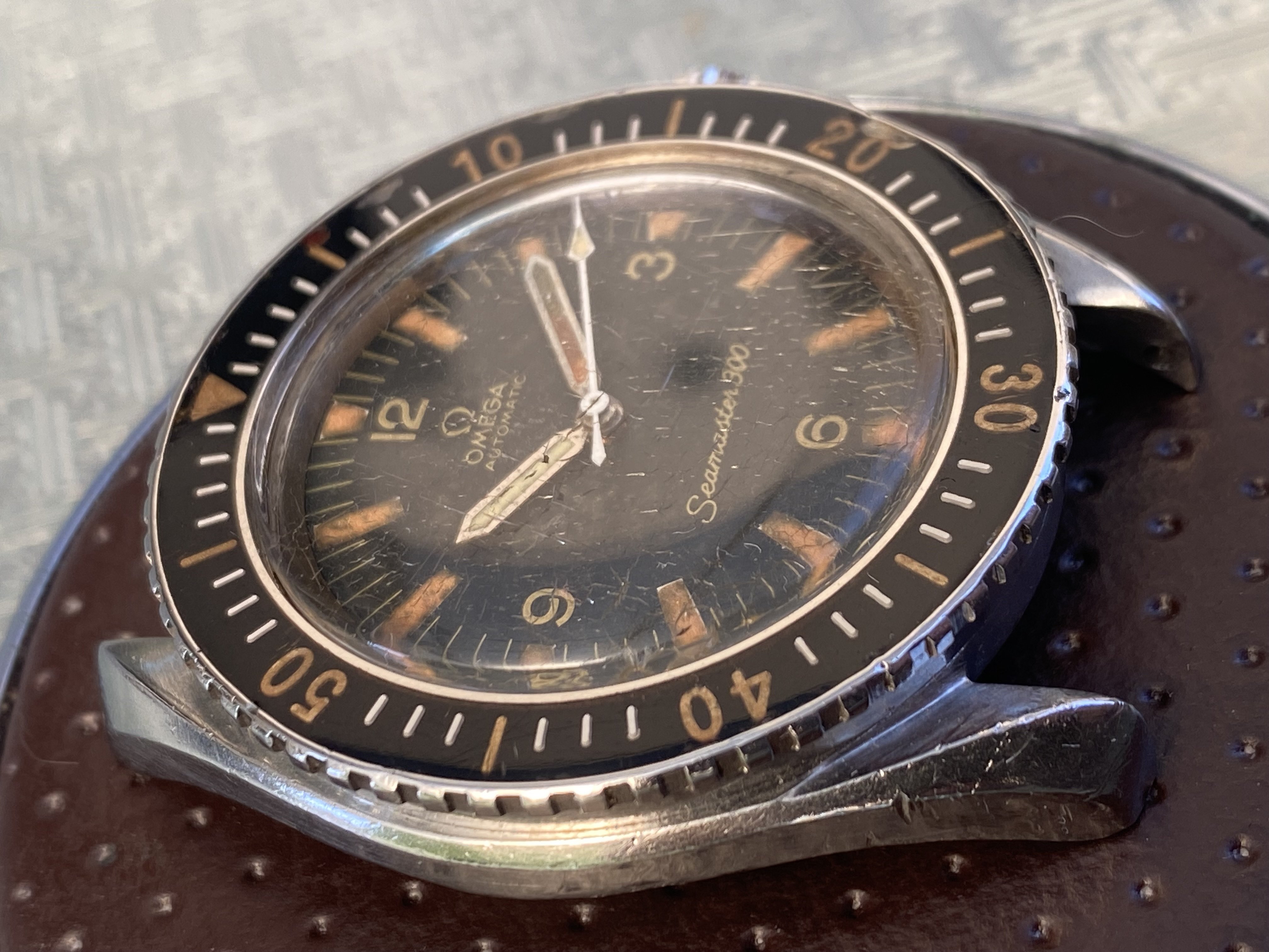 The acrylic bezel is in good condition, with only a couple of minor imperfections, mainly a small blow at the 20 minute mark. The crystal has lots of crazing and no Omega logo.