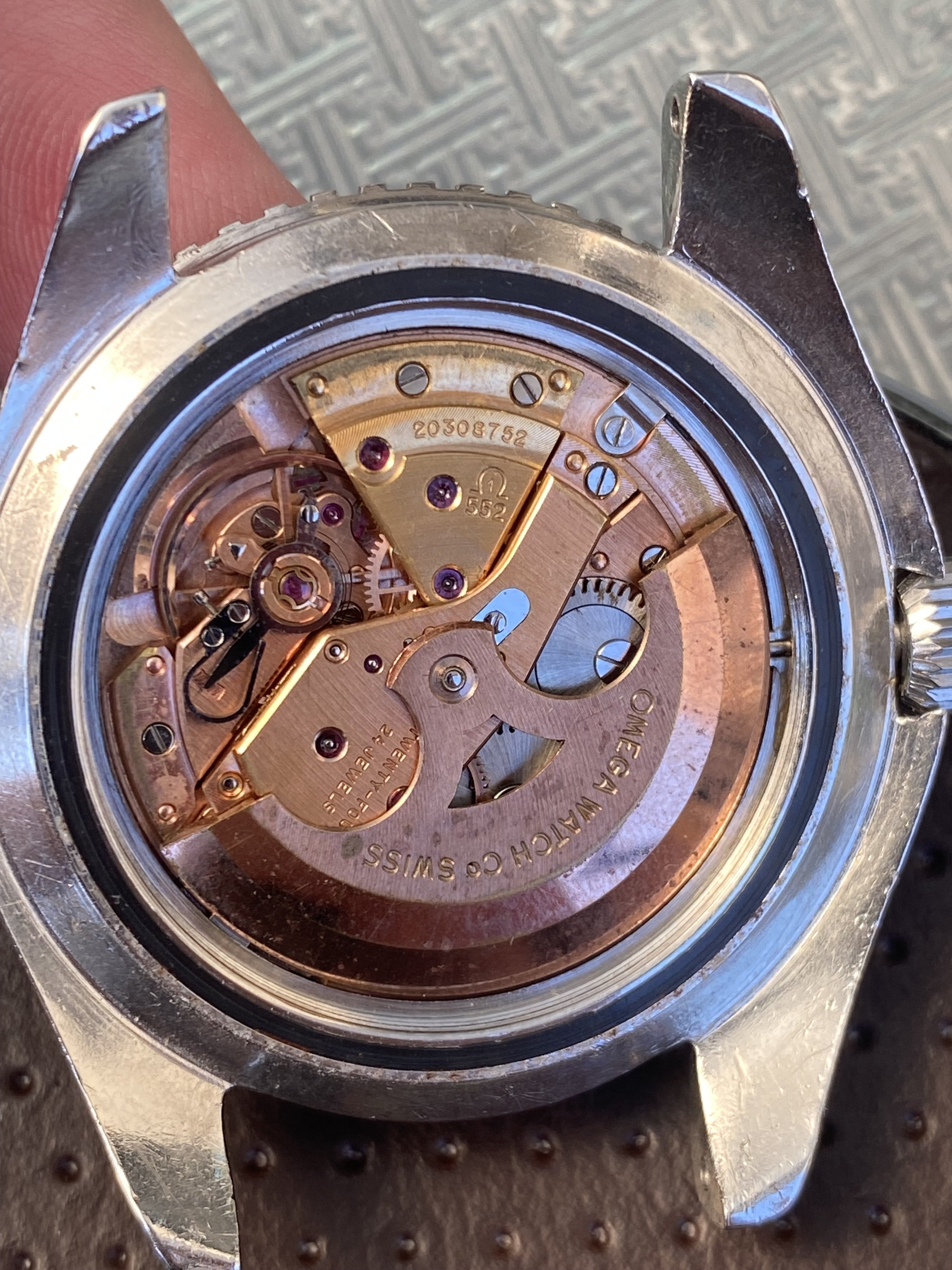 The caliber 552 movement has a 20 million serial number and is currently running, it should clean up nicely. It does have a different bronze tone on the serial number bridge.