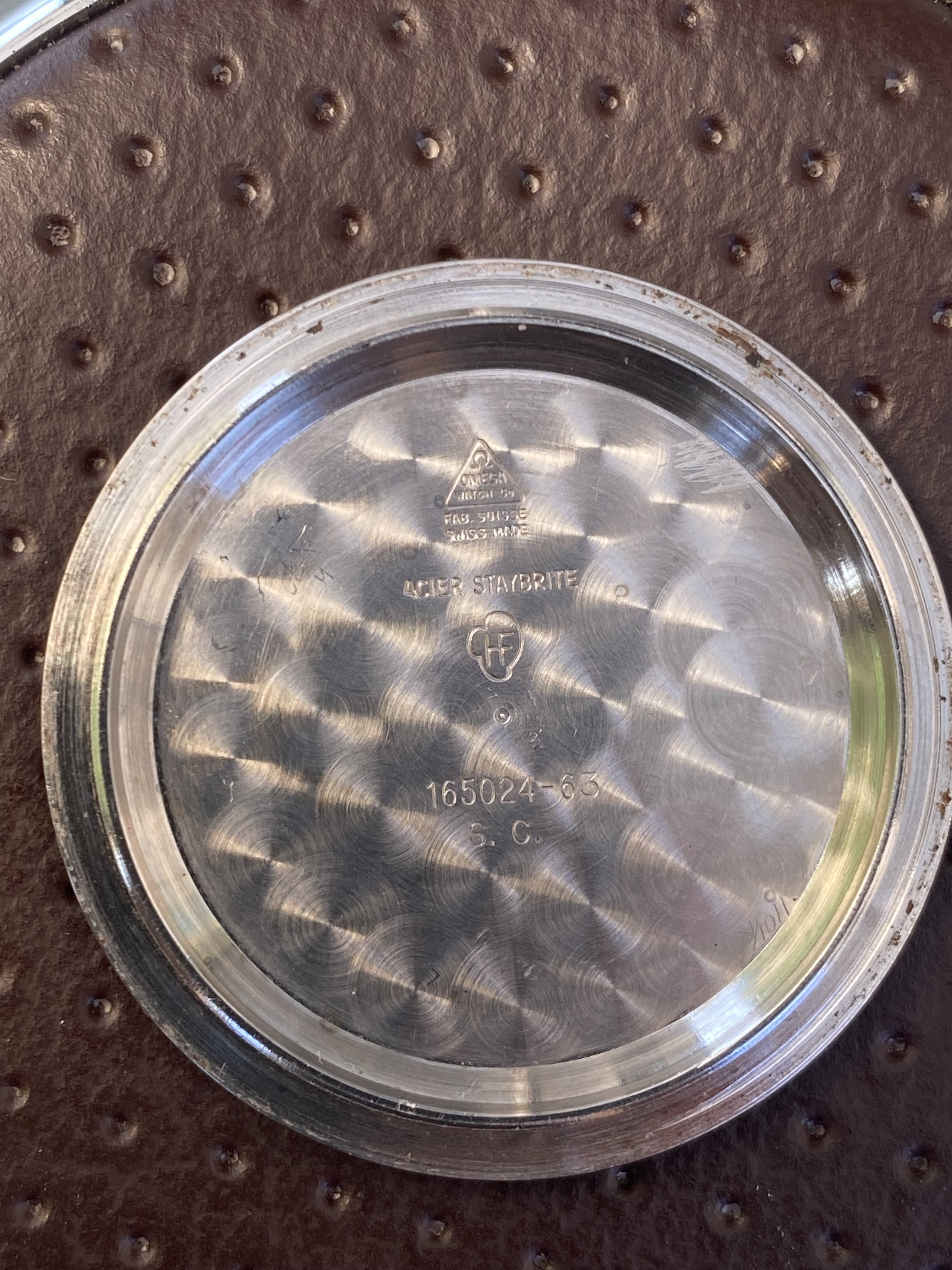 The watch is all original to the best of my knowledge, except for the short minute hand which came off a 166.073. It has what I believe is the original flat feet logo crown. The black dial has what seem to be slight humidity stains which actually look cool paired witha very nice set of pumpkin colored hour markers. Not perfect by any means but giving a lot of character.