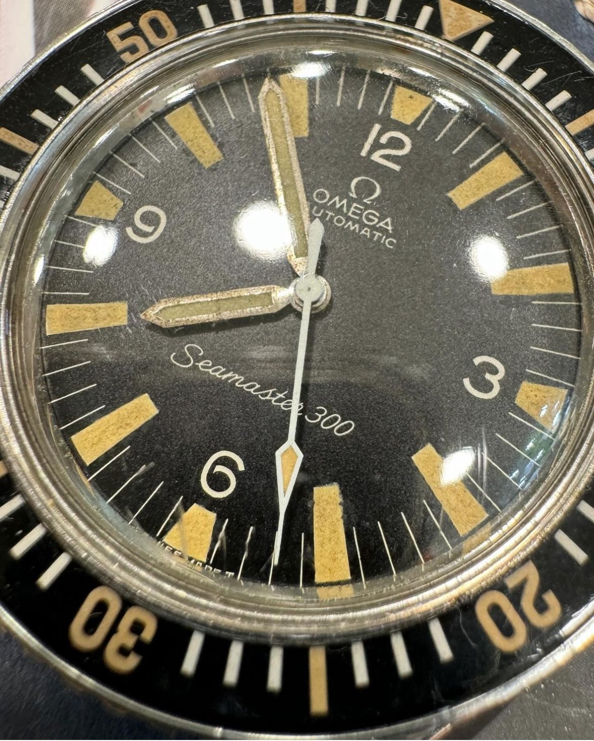 - Dial: has the pinholes on 12 and 6 markers. Lume patina seems evenly distributed. 3-6-9 font appears to be correct.