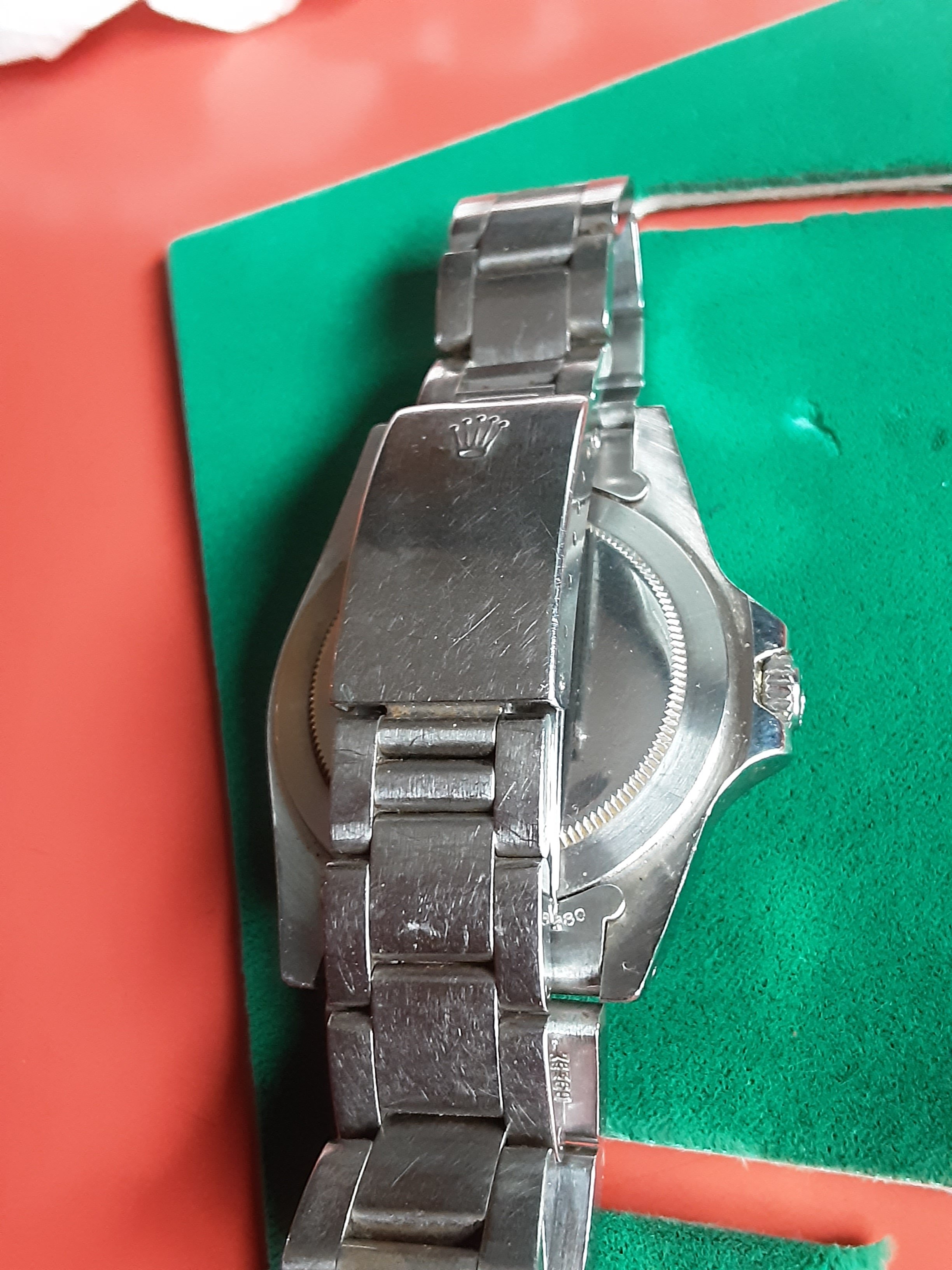 Obviously lived it's life as a true tool watch, but to my eye it seems like an honest watch. Don't see any dial damage under all the crystal scratches. Back hasn't been off and the crown is seized and didn't want to force it. Watch runs for a bit with a light shake but wouldn't want to speculate on the movement condition. Rolex papers say it was sold in 1980.